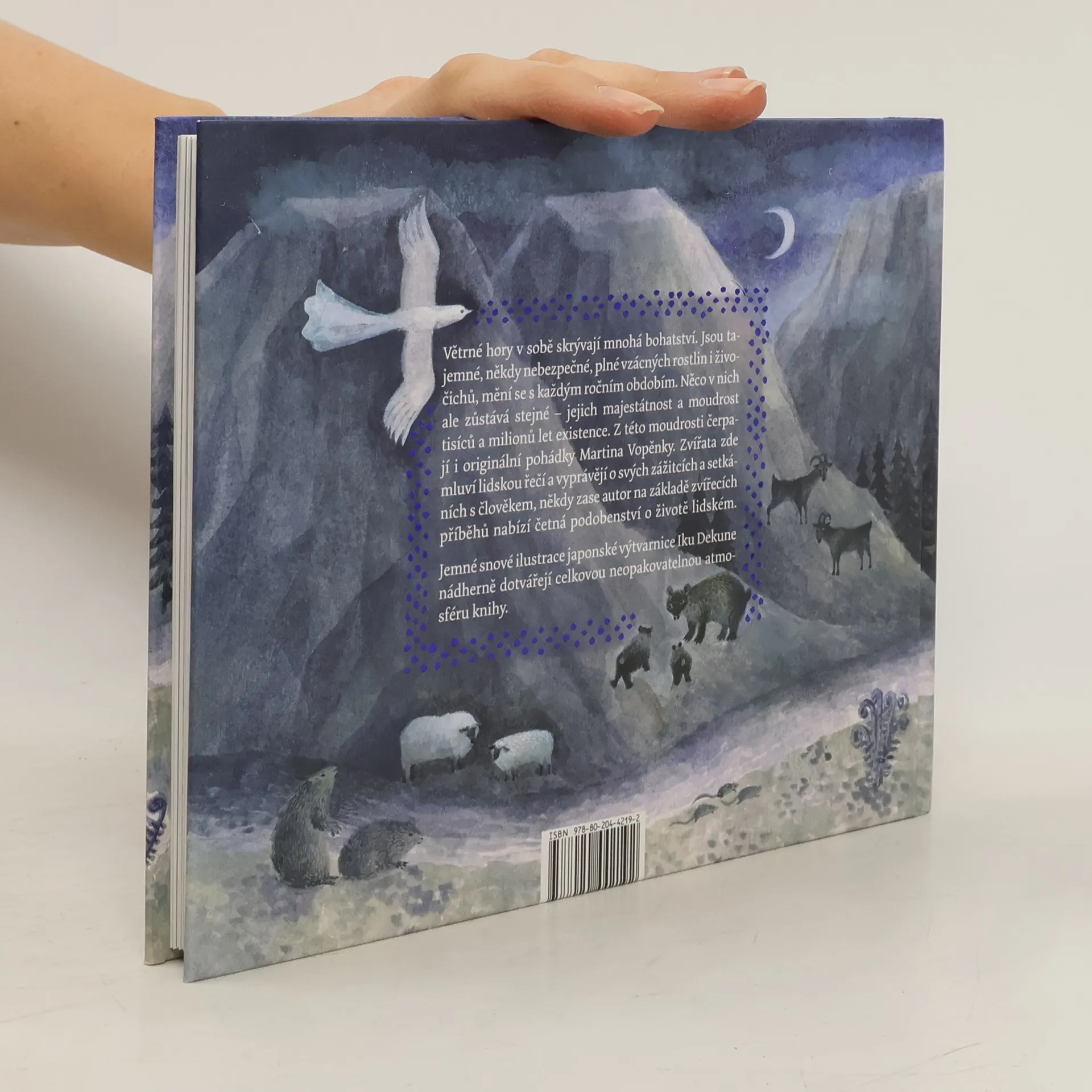 Větrné hory v sobě skrývají mnohá bohatství. Jsou tajemné, někdy nebezpečné, plné vzácných rostlin i živočichů, mění se s každým ročním obdobím. Něco v nich ale zůstává stejné – jejich majestátnost a moudrost tisíců a milionů let existence. Z této moudrosti čerpají i originální pohádky Martina Vopěnky. Zvířata zde mluví lidskou řečí a vyprávějí o svých zážitcích a setkáních s člověkem, někdy zase autor na základě zvířecích příběhů nabízí četná podobenství o životě lidském. Příběhy se čtou v několika rovinách, kde si každý může najít to své: jako lyrické popisy prostředí, jako pohádky, fi lozofi cké povídky, i jako bajky, které nenásilnou formou nabízejí i trochu poučení. Jemné snové ilustrace japonské výtvarnice Iku Dekune nádherně dotvářejí celkovou neopakovatelnou atmosféru knihy.