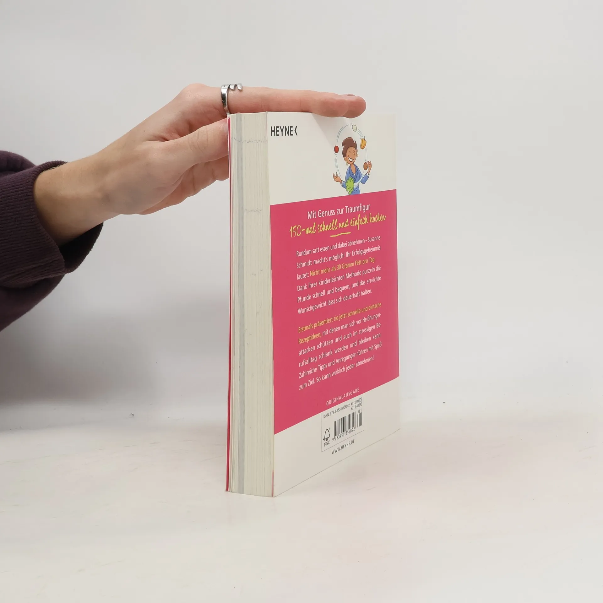Susanne Schmidt hat 57 Kilo in nur sieben Monaten abgenommen – jetzt hilft sie anderen im Kampf gegen die Pfunde Rundum satt essen und dabei abnehmen – Susanne Schmidt macht’s möglich! Ihr Erfolgsgeheimnis lautet: Nicht mehr als 30 Gramm Fett pro Tag. Dank ihrer kinderleichten Methode purzeln die Pfunde schnell und bequem, und das erreichte Wunschgewicht lässt sich dauerhaft halten. Erstmals präsentiert sie jetzt schnelle und einfache Rezeptideen, mit denen man sich vor Heißhungerattacken schützen und auch im stressigen Berufsalltag schlank werden und bleiben kann. So kann wirklich jeder abnehmen.