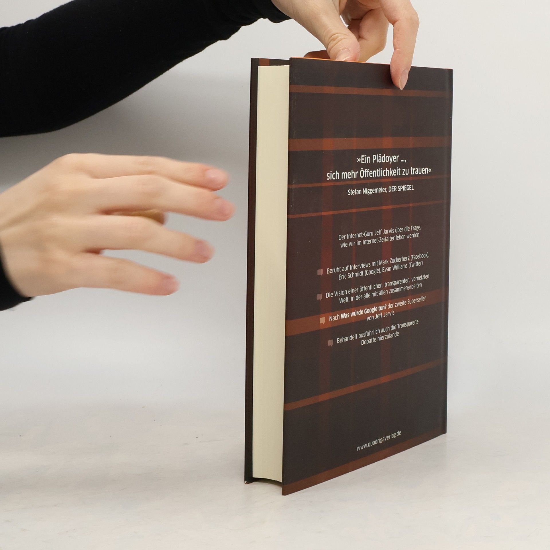 Wer sein Laptop oder Smartphone einschaltet, denkt gar nicht mehr daran, dass diese wunderbare Technologie gerade mal zwanzig Jahre alt ist. Wir googeln, twittern, surfen und vernetzen uns, ja, wir leben im Netz. Und alle anderen sind auch da. Zugleich ist die Sache uns unheimlich. Google, Amazon, Facebook und Twitter wissen mehr über uns als unsere Eltern und Freunde je wussten. Machen wir uns nicht zu Sklaven des Internets, während die reale Welt sich wie rasend verändert? Regierungen werden gestürzt, Autoritäten werden durch Internetforen ersetzt, die Zeitungen sterben, der Einzelhandel steht mit dem Rücken an der Wand. Daten sind der kostbarste Rohstoff des neuen Jahrtausends. Jeff Jarvis hat nach unseren Erwartungen, Möglichkeiten, Ängsten gefragt. Sein Ergebnis: Wir stehen am Anfang einer Umwälzung, deren Ende noch niemand absehen kann. Aber wir müssen keine Angst vor der neuen Transparenz und Öffentlichkeit haben, die das Internet uns ermöglicht. Sie werden die Gesellschaft, den Staat und die Wirtschaft von Grund auf erneuern und jeden Einzelnen auf ungeahnte Weise emanzipieren. Beruht auf Interviews mit Mark Zuckerberg (Facebook), Eric Schmidt (Google), Evan Williams (Twitter) Die Vision einer öffentlichen, transparenten, vernetzten Welt, in der alle mit allen zusammenarbeiten Nach „Was würde Google tun?“ der zweite Superseller von Jeff Jarvis Behandelt ausführlich auch die Transparenz-Debatte hierzulande
