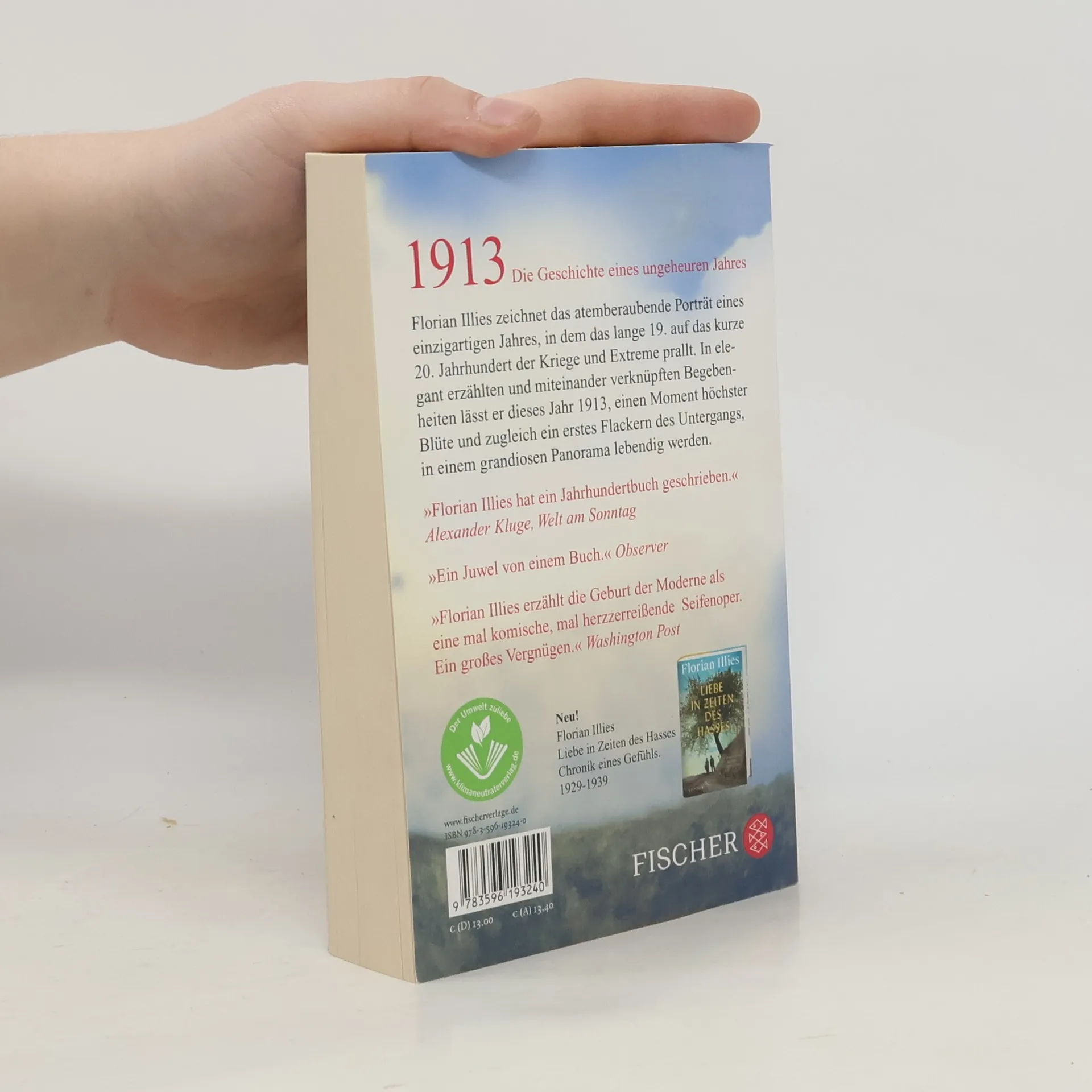Die Geschichte eines ungeheuren Jahres – der internationale Bestseller jetzt als Taschenbuch! »Ich konnte nicht mehr aufhören zu lesen – Illies' Geschichten sind einfach großartig.«Ferdinand von Schirach Florian Illies entfaltet virtuos ein historisches Panorama. 1913: Es ist das eine Jahr, in dem unsere Gegenwart begann. In Literatur, Kunst und Musik werden die Extreme ausgereizt, als gäbe es kein Morgen. Zwischen Paris und Moskau, zwischen London, Berlin und Venedig begegnen wir zahllosen Künstlern, deren Schaffen unsere Welt auf Dauer prägte. Man kokst, trinkt, ätzt, hasst, schreibt, malt, zieht sich gegenseitig an und stößt sich ab, liebt und verflucht sich. Es ist ein Jahr, in dem alles möglich scheint. Und doch wohnt dem gleißenden Anfang das Ahnen des Verfalles inne. Literatur, Kunst und Musik wussten schon 1913, dass die Menschheit ihre Unschuld verloren hatte. Florian Illies lässt dieses eine Jahr, einen Moment höchster Blüte und zugleich ein Hochamt des Unterganges, in einem grandiosen Panorama lebendig werden.