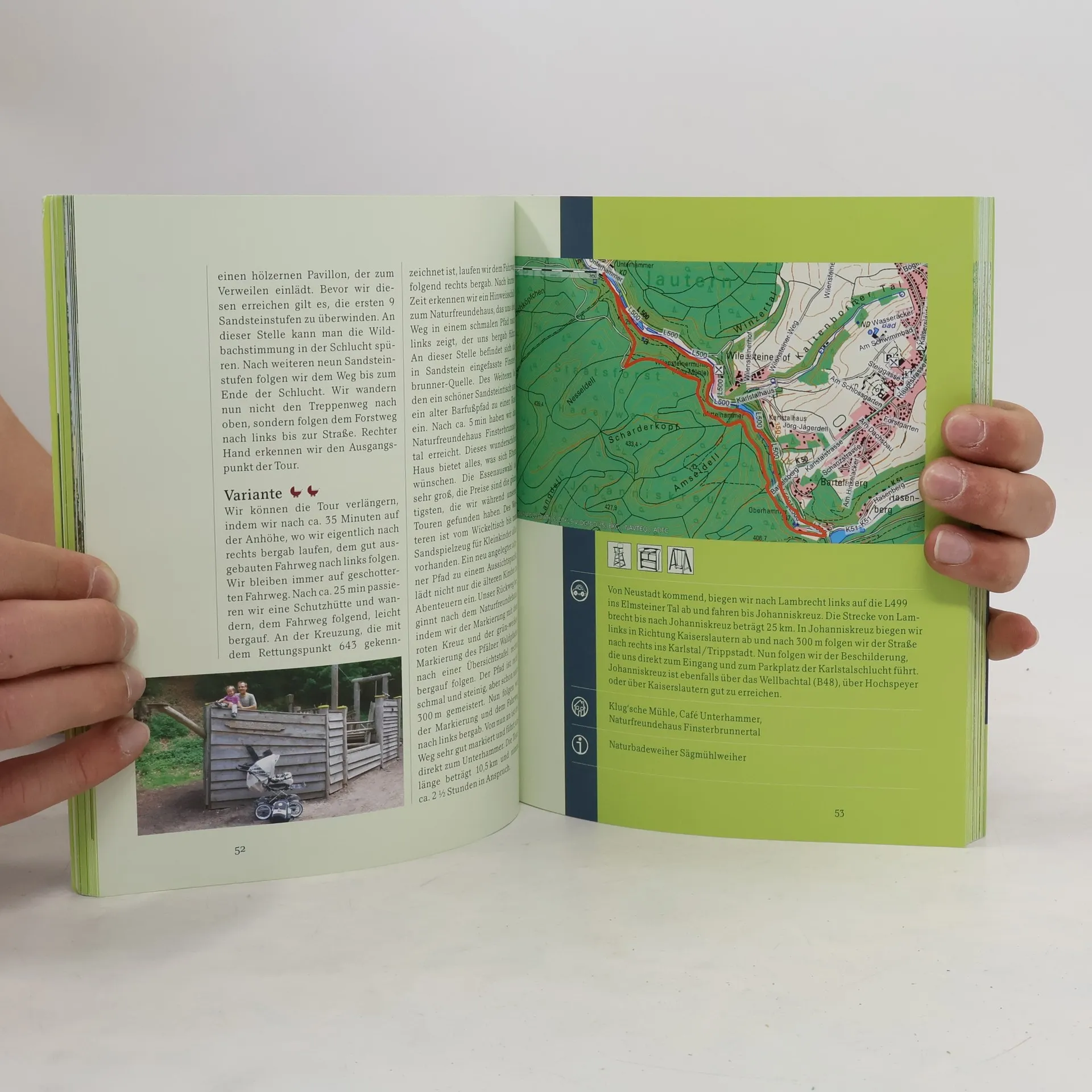 Das Buch „Mit dem Kinderwagen durch die Pfalz“ beschreibt 32 babyfreundliche Touren. Die Autoren, selbst Eltern, beschreiben präzise und detailliert Wanderungen für Eltern, die mit dem Kinderwagen unterwegs sind und die Pfalz von ihrer schönsten Seite erleben wollen. Die 32 ausgewählten Touren sind vielfältig – sie reichen von Kusel über den Donnersberg nach Bad Dürkheim und von der Weinstraße bis zum Bienwald. Egal ob für Babys oder Kleinkinder, die es genießen über Stock und Stein geschoben zu werden, es ist für jeden Geschmack etwas zu finden. Die leichten bis sehr schweren Wanderungen sind ausführlich beschrieben, spezielle und übersichtliche Karten verschaffen einen Überblick über die jeweilige Tour. Es handelt sich meistens um Rundwege, die speziell auf die Bedürfnisse von Eltern mit Kindern eingehen.