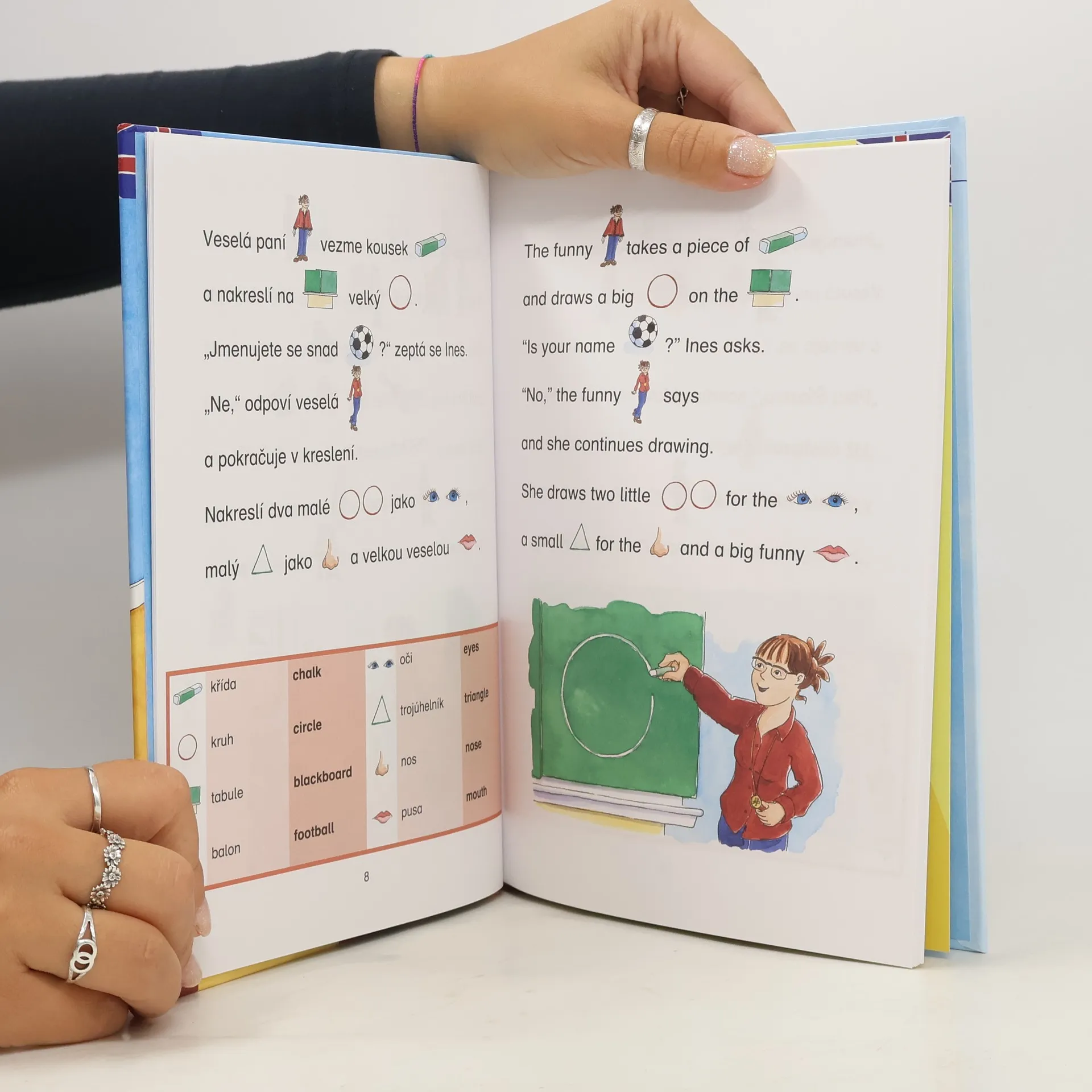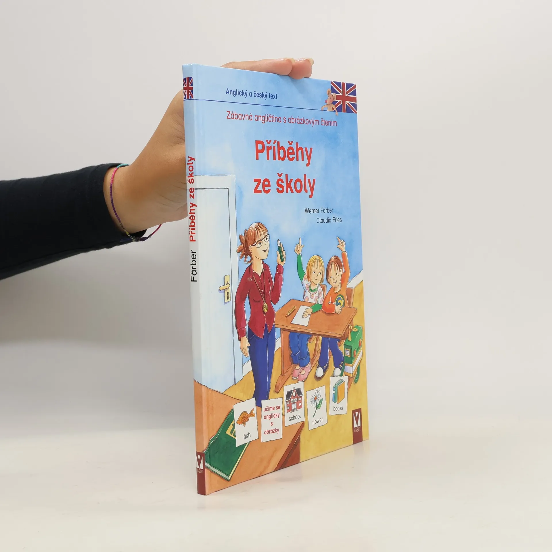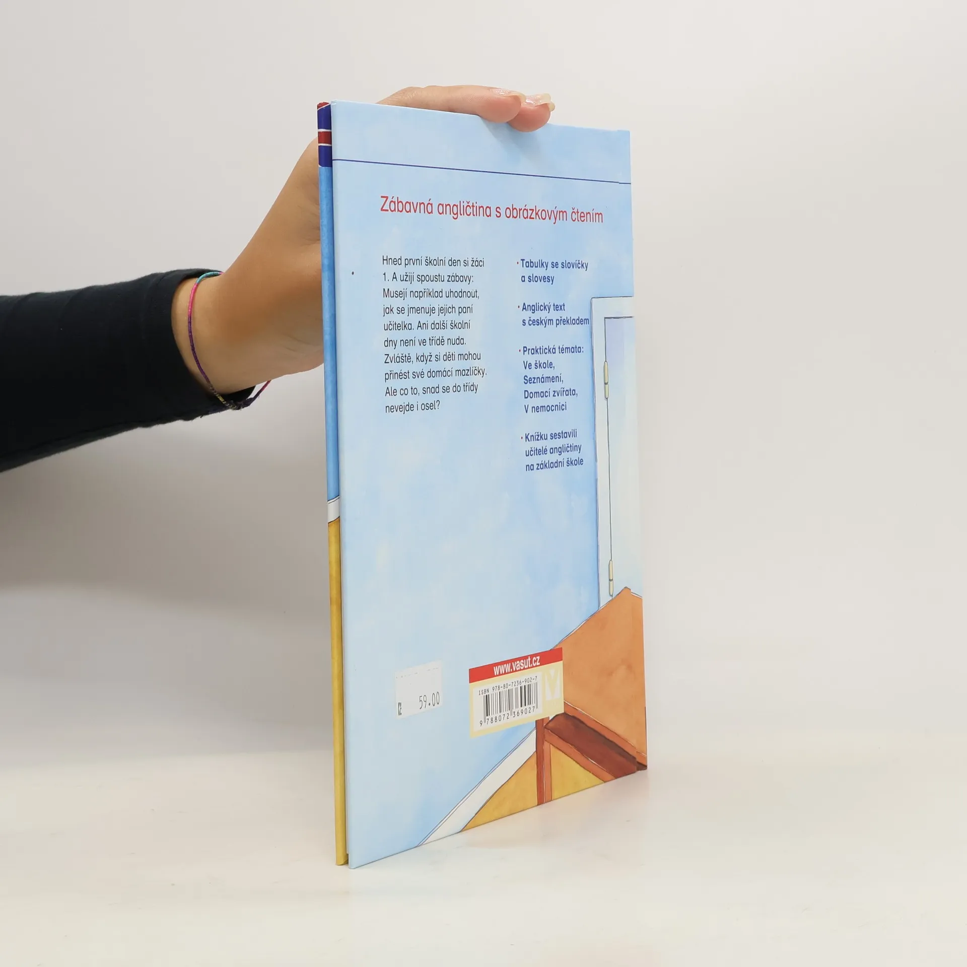 Hned první školní den si žáci 1. A užijí spoustu zábavy: Musejí například uhodnout, jak se jmenuje jejich paní učitelka. Ani další školní dny není ve třídě nuda. Zvláště, když si děti mohou přinést své domácí mazlíčky. Ale co to, snad se do třídy nevejde i osel? – Tabulky se slovíčky a slovesy – Anglický text s českým překladem – Praktická témata: Ve škole, Seznámení, Domací zvířata, V nemocnici – Knížku sestavili učitelé angličtiny na základní škole