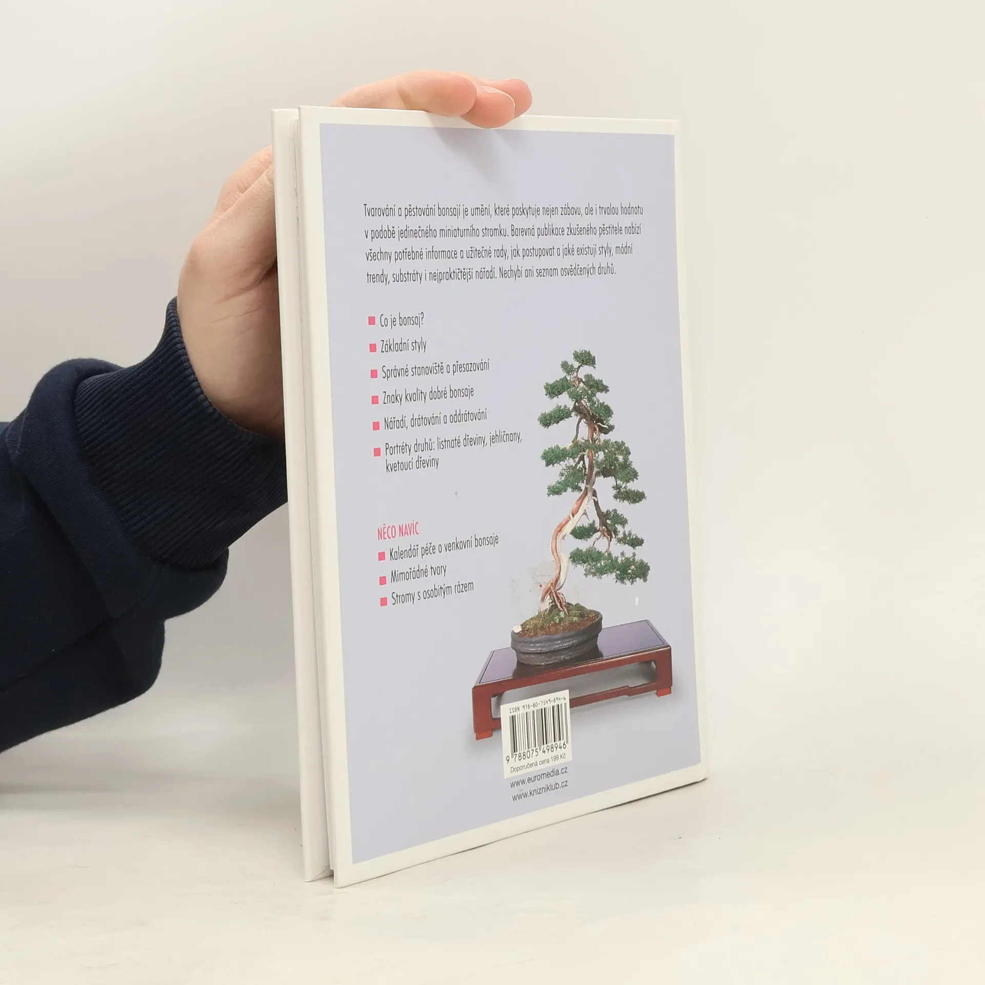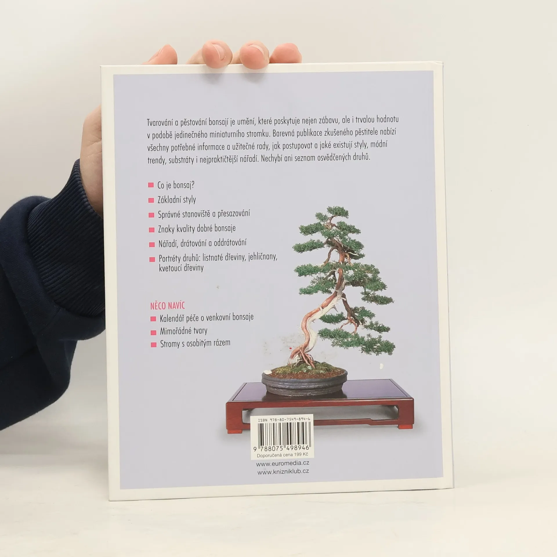 Tvarování a pěstování bonsají je umění, které poskytuje nejen zábavu, ale i trvalou hodnotu v podobě jedinečného miniaturního stromku. Barevná publikace zkušeného pěstitele nabízí všechny potřebné informace a užitečné rady, jak při pěstování postupovat a jaké existují styly, módní trendy, substráty i nejpraktičtější nářadí. Nechybí ani seznam osvědčených druhů.