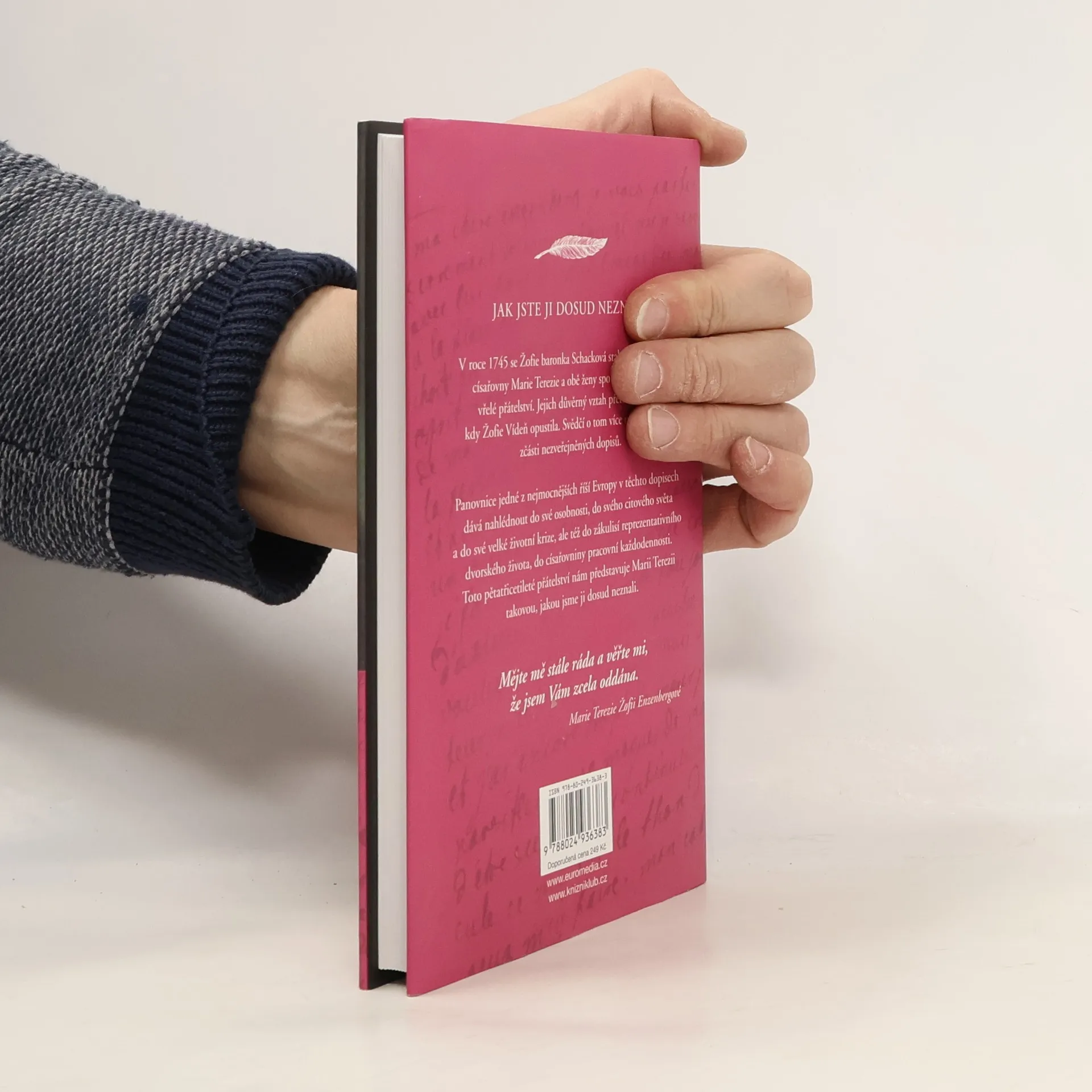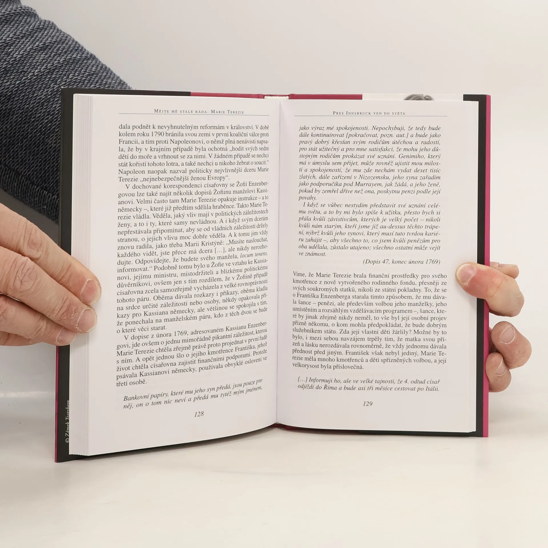 Dopisy nejbližší přítelkyni. V roce 1745 se Žofie baronka Schacková stala dvorní dámou císařovny Marie Terezie a obě ženy spolu záhy navázaly vřelé přátelství. Jejich důvěrný vztah vytrval i poté, kdy Žofie Vídeň opustila. Svědčí o tom více než 80 dosud zčásti nezveřejněných dopisů. Panovnice jedné z nejmocnějších říší Evropy v těchto dopisech dává nahlédnout do své osobnosti, do svého citového světa a do své velké životní krize, ale též do zákulisí reprezentativního dvorského života, do císařovniny pracovní každodennosti. Toto pětatřicetileté přátelství nám představuje Marii Terezii takovou, jakou jsme ji dosud neznali.