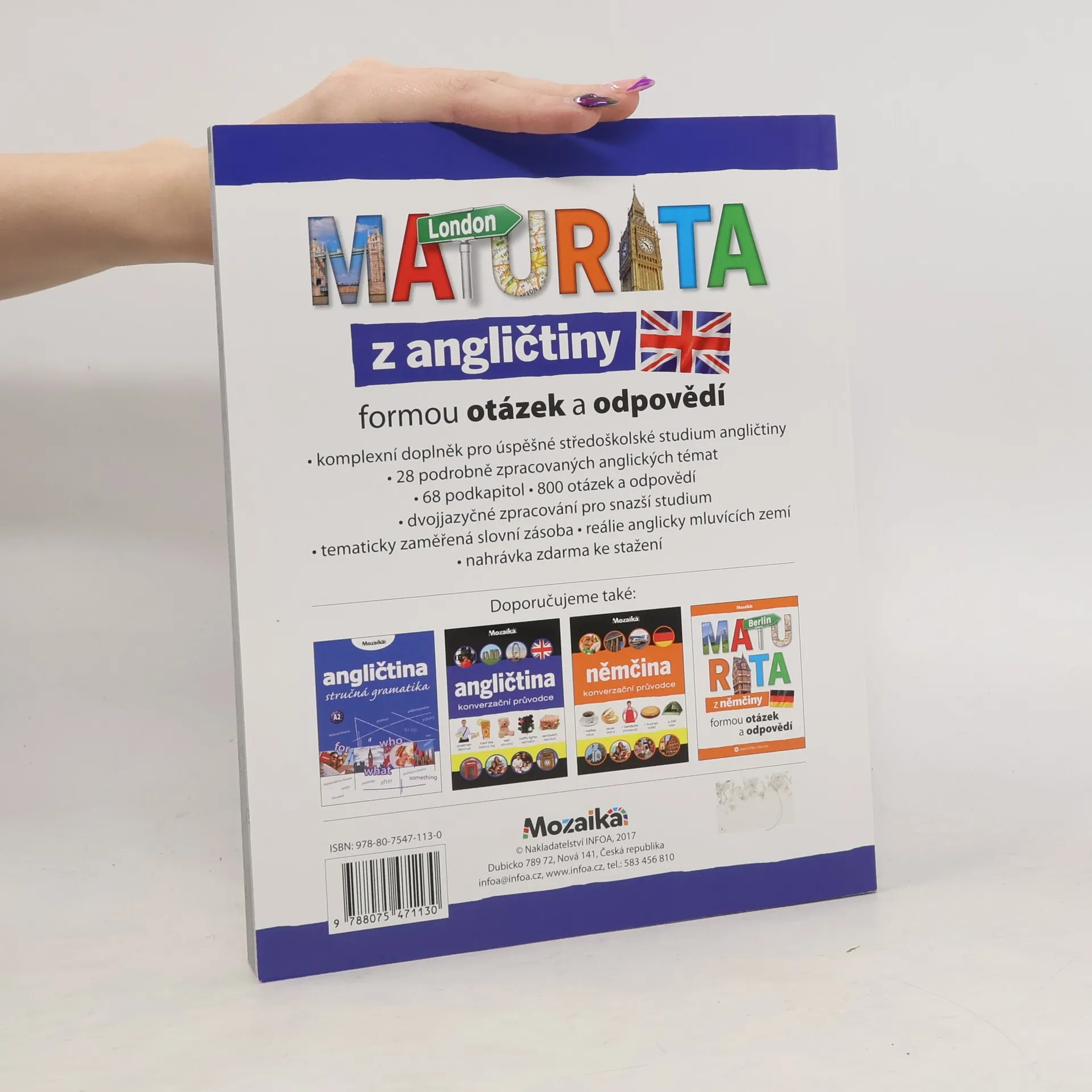 Kniha je komplexním doplňkem pro úspěšné středoškolské studium angličtiny. Obsahuje 28 podrobně zpracovaných anglických témat, 800 otázek a odpovědí, tematicky zaměřenou slovní zásobu, reálie anglicky mluvících zemí. Kniha je ve dvojjazyčném zpracování pro snažší studium.
