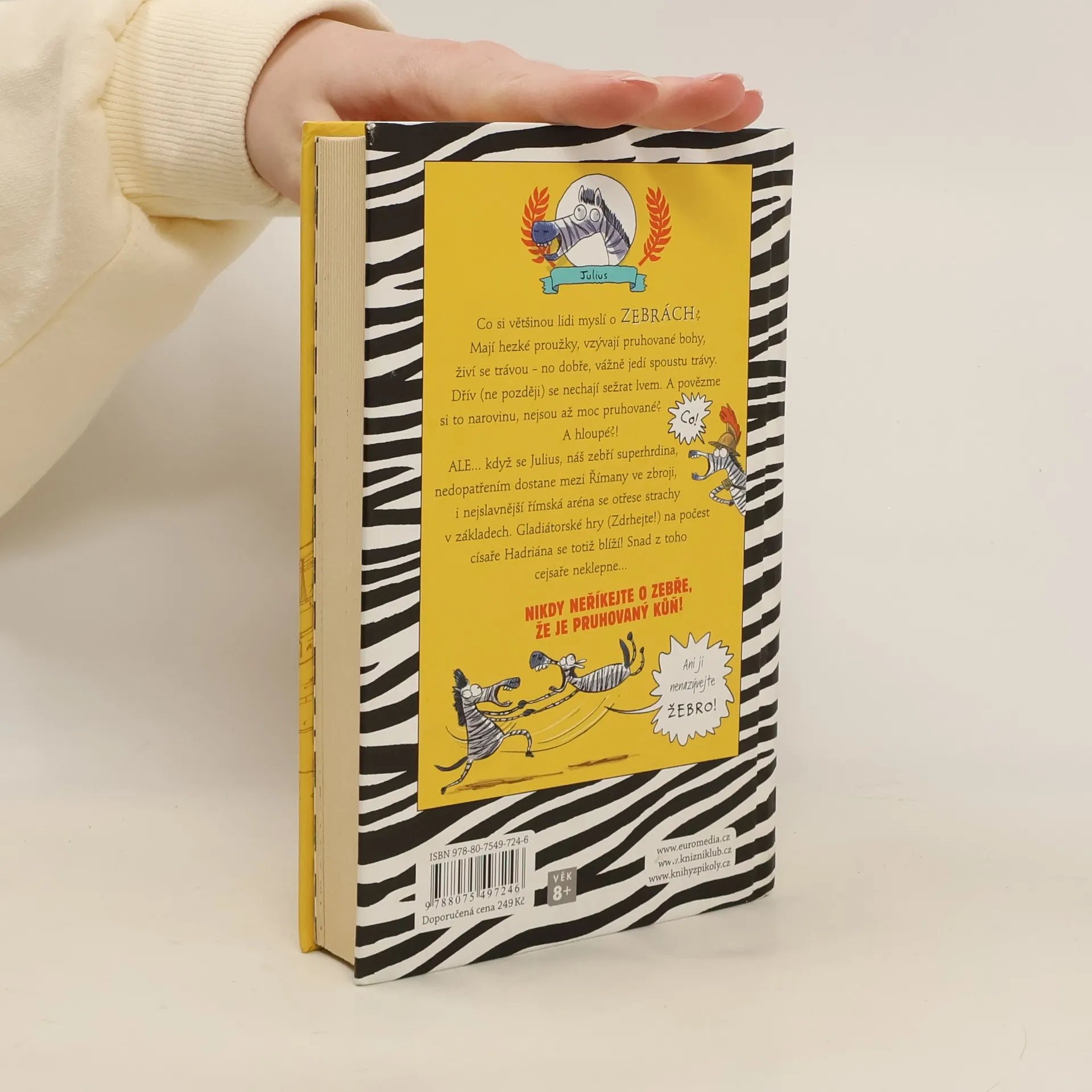 Hrom aby udeřil do savany, když říkám, že zebry nejsou koně!... Myslíte si, že znáte zebry, hm?! Jasně, mají hezké proužky, jí trávu a občas si je dá k večeři lev. To ale ještě neznáte Juliuse! Tenhle zebroun to dotáhl až do gladiátorské arény v Římě! Pravda, trochu omylem, ale bojovnost, statečnost a ostrovtip mu nechybí. Když se před zraky všech v aréně neohroženě postaví zběsilému gladiátoru Viktoriovi, vyslouží si přízeň publika i císaře, který mu nabídne, aby se stal gladiátorem. Dobrodružná, humorná a lehce potrhlá kniha o odvážném zebřím bojovníkovi Juliusi Zebrovi je pro čtenáře od 8 let.