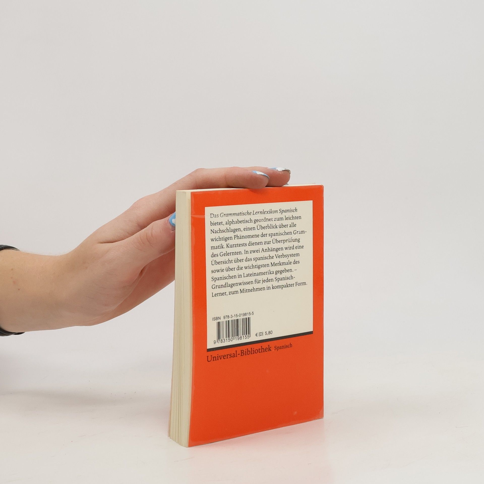 Das »Grammatische Lernlexikon Spanisch« schließt an die erfolgreichen Titel »Grammatisches Lernlexikon Englisch« (UB 19767) und »Grammatisches Lernlexikon Französisch« (UB 19743) an und bietet, alphabetisch geordnet zum leichten Nachschlagen, einen Überblick über alle wichtigen Phänomene der spanischen Grammatik. Kurztests dienen zur Überprüfung des Gelernten. In zwei Anhängen wird eine Übersicht über das Verbsystem sowie über die wichtigsten Merkmale des Spanischen in Lateinamerika gegeben. Grundlagenwissen in kompakter Form.