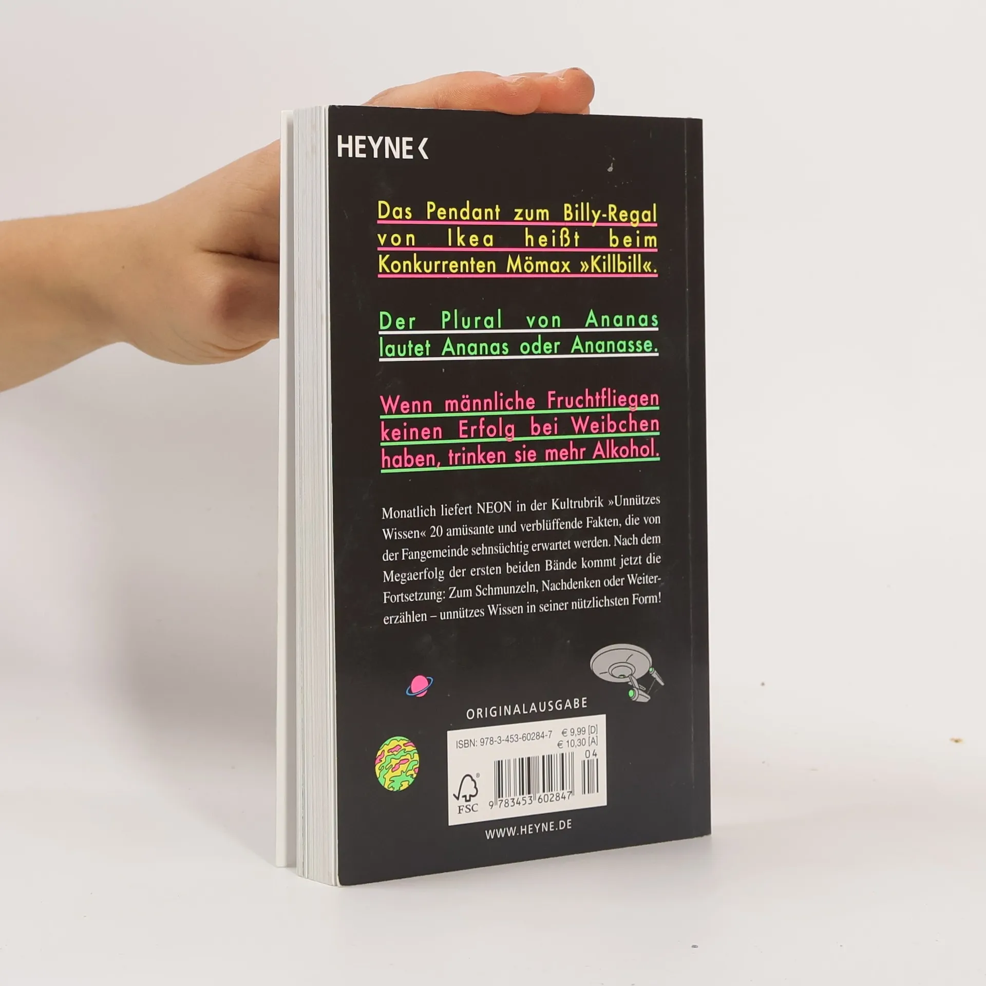 »Unnützes Wissen« ist die beliebteste und erfolgreichste NEON-Kolumne Nietzsche hat bei Facebook mehr als dreizehnmal so viele Fans wie Goethe, das Pendant zum Billy-Regal von Ikea heißt beim Konkurrenten Mömax »Killbill«, und Nilpferde sind Schweine, keine Pferde: Monatlich liefert NEON in der Kultrubrik »Unnützes Wissen« 20 amüsante und verblüffende Fakten, die von der Fangemeinde sehnsüchtig erwartet werden. Nach dem Megaerfolg der ersten beiden Bände kommt jetzt das neue Unnütze Wissen: zum Schmunzeln, Nachdenken oder Weitererzählen – unnützes Wissen in seiner nützlichsten Form! Ausstattung: durchgehend 4c