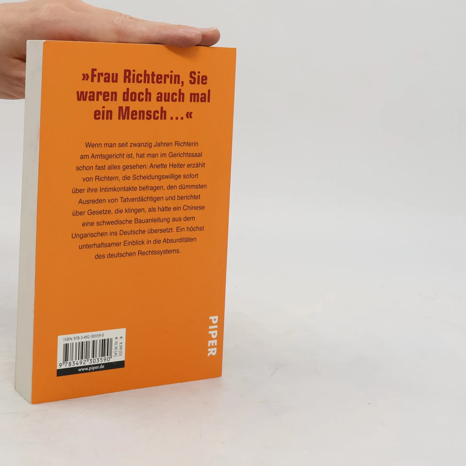 Wenn man seit zwanzig Jahren Richterin am Amtsgericht ist, hat man im Gerichtssaal schon fast alles gesehen: Annette Heiter berichtet über die Regelungswut des Gesetzgebers, die absurde Klagefreudigkeit von Nachbarn, erzählt von amtsmüden Richtern, übereifrigen Rechtsanwälten und absurden Zeugenaussagen. Wie die wahre Geschichte des Richters, der Scheidungswillige sofort über ihre Intimkontakte befragt, den dümmsten Ausreden von Tatverdächtigen und über Gesetze, die klingen, als hätte ein Chinese eine schwedische Bauanleitung aus dem Ungarischen ins Deutsche übersetzt. Ein höchst unterhaltsamer Einblick in die Absurditäten des deutschen Rechtssystems und ein ideales Geschenk für Juristen und Laien.