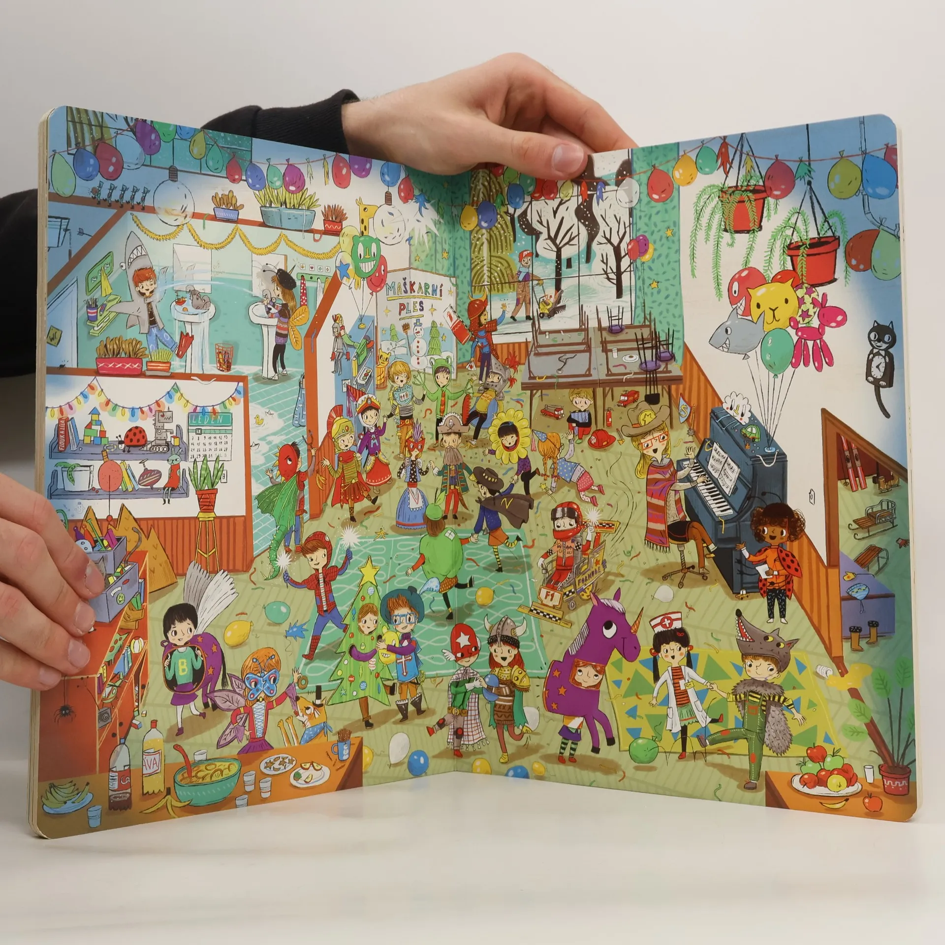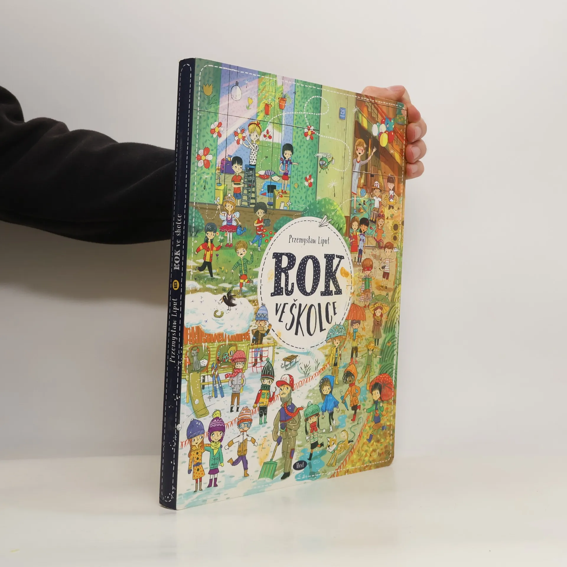 Vítej v naší školce! Tady se učíme, hrajeme si a občas vyvádíme skopičiny. Lukáš má rád fotbal, Tomáš je zase odborník na dinosaury. Evička pořád něco ztrácí a Ivanka ráda pořádá čajové dýchánky pro panenky. Jirku zajímá vesmír a vesmírné lodě a jednou z něj bude kosmonaut. Naše paní učitelka se jmenuje Květa. Pak je tu s námi ještě pan Janda, který umí všechno opravit, a jeho pes Alík. Staráme se taky o kočičku Micku – ta darebačka se pořád někde schovává a my ji hledáme. Pojď se s námi skamarádit! Chodit do školky je zábava. Rok ve školce obsahuje dvanáct bohatě ilustrovaných dvoustran, které dětem ukazují, co všechno se dá v průběhu roku – od září do letních prázdnin – zažít ve školce. Děti si díky detailním obrázkům procvičují postřeh a schopnost vyprávět příběhy, ale především se budou při zkoumání ilustrací výborně bavit.