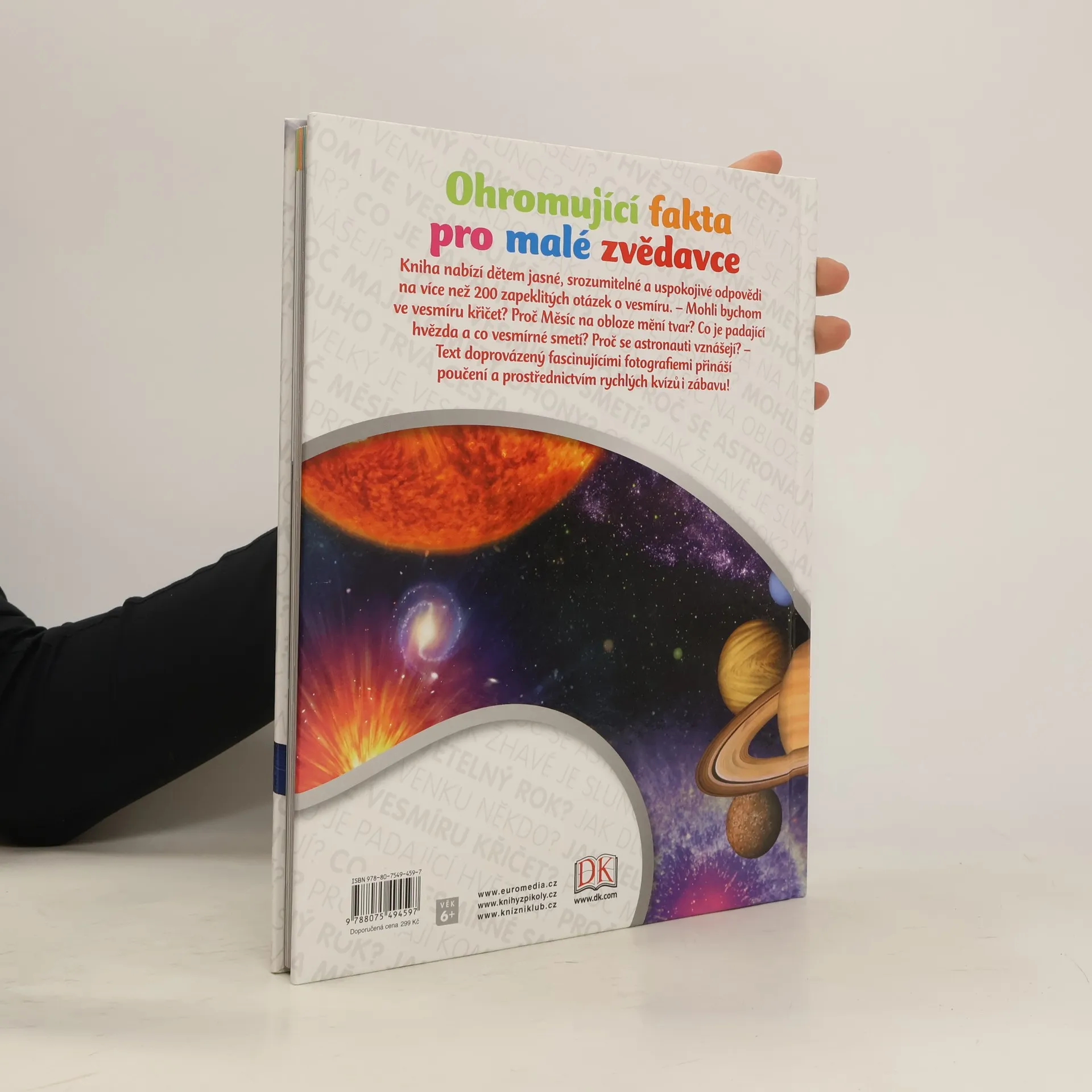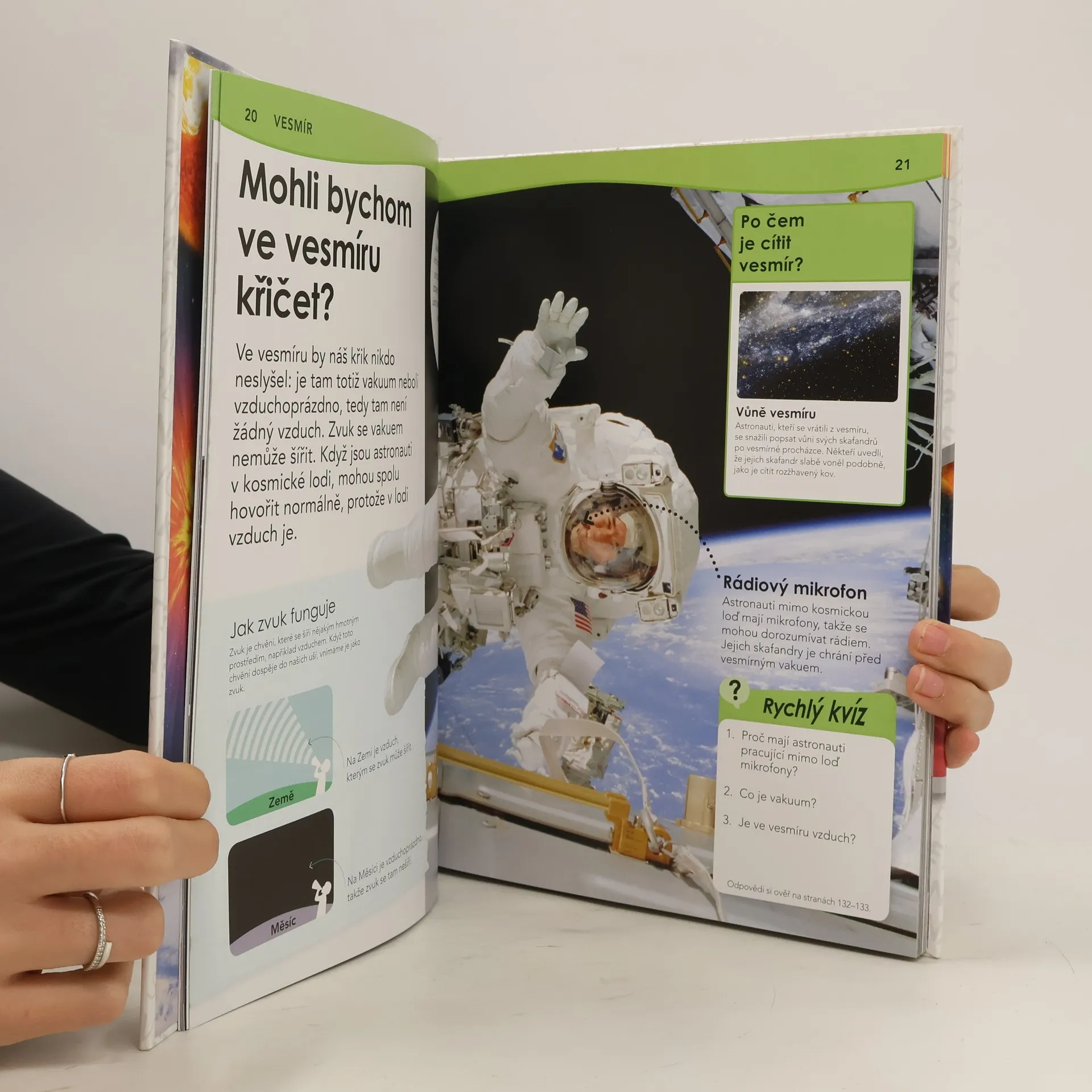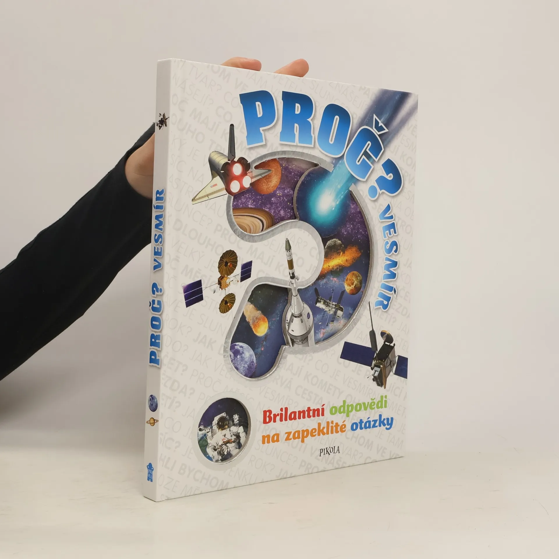 Brilantní odpovědi na zapeklité otázky, to je podnázev této encyklopedie o vesmíru, určené pro děti mladšího školního věku. – Mohli bychom ve vesmíru křičet? Proč Měsíc na obloze mění tvar? Co je padající hvězda? Co je vesmírné smetí? Proč se astronauti vznášejí? – Na více než 200 otázek o sluneční soustavě, hvězdách, galaxiích či průzkumu vesmíru dostávají děti jasné, srozumitelné a uspokojivé odpovědi plné informací, doprovázených fascinujícími fotografiemi.