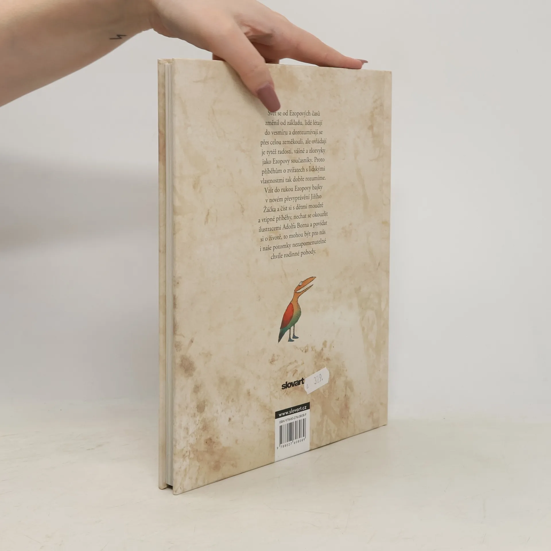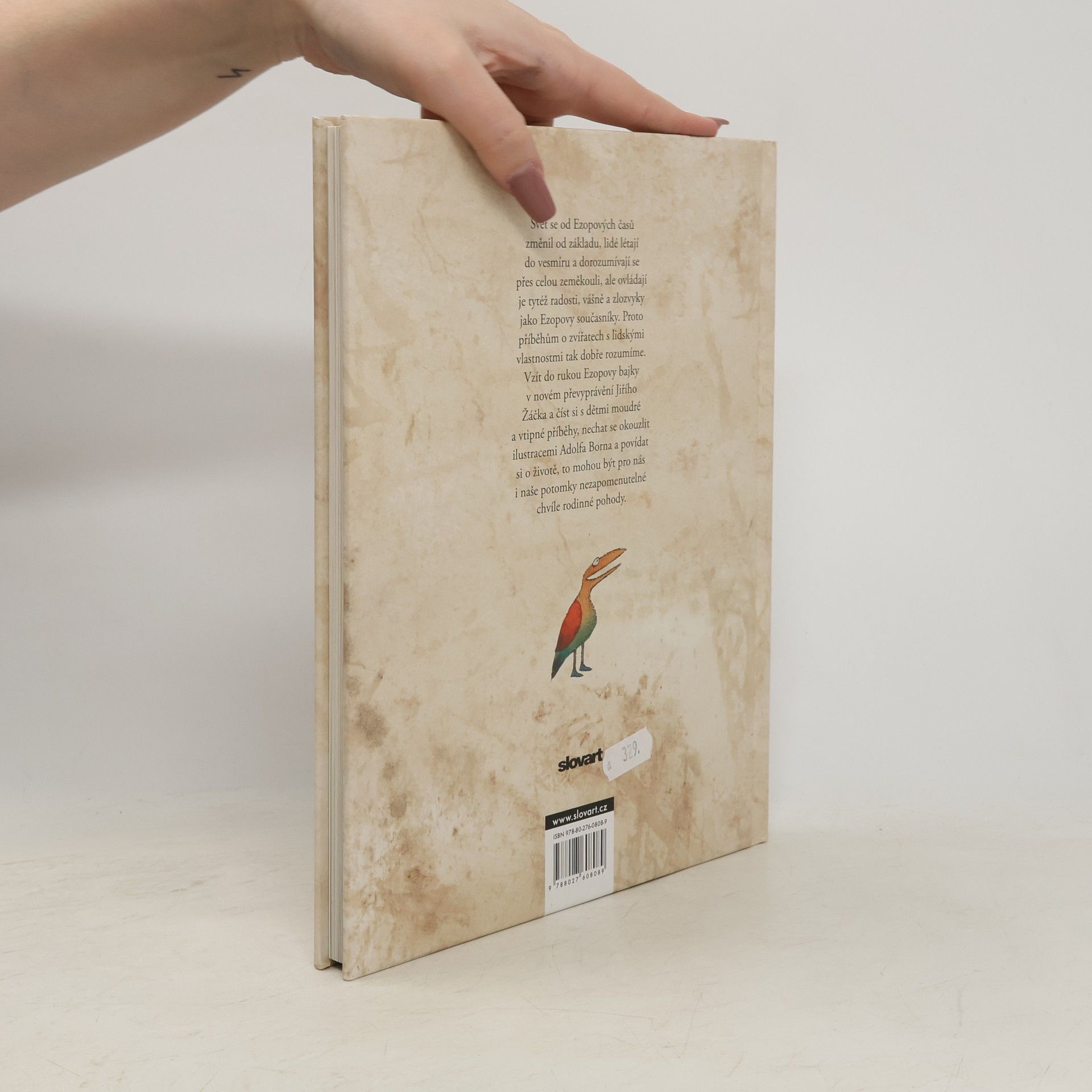 Podle dějepisce Herodota žil v Malé Asii v 6. století před Kristem otrok Aisopos čili Ezop. Byl prý hrbatý, znetvořený a koktavý, ale hlavu měl bystřejší a myšlení pronikavější než lidé urostlí a zdraví. Uměl pobavit posluchače zvířecími bajkami a vtipnými příběhy, ale zdaleka ne všichni jeho současníci byli jeho obdivovatelé. Traduje se, že byl v Delfách popraven za údajné rouhání bohům. Ezopovi byla připisována většina starověkých bajek, zapsány však byly až po třech stoletích od jeho smrti. Mnohokrát byly převyprávěny prózou i ve verších a najde se jen málo těch, co by nevěděli, kdo byl Ezop. Ale ať už se ten moudrý muž jmenoval Ezop, nebo jinak, ať už žil v 6. století před Kristem, anebo jindy, ať už byl thráckého původu, nebo jného, hlavní je, že jeho bajky dodnes nezestárly. Svět se za tu dobu změnil od základu, lidé létají do vesmíru a dorozumívají se přes celou zeměkouli, ale ovládají je tytéž radosti, vášně a zlozvyky jako Ezopovy současníky. Proto jim tak dobře rozumíme - dospělí i děti. Vzít do rukou převyprávění Ezopových bajek od Jiřího Žáčka a číst si s dětmi moudré a vtipné příběhy, prohlížet si ilustrace Adolfa Borna a povídat si o životě, to může být chvíle, která se nám zapíše do paměti.