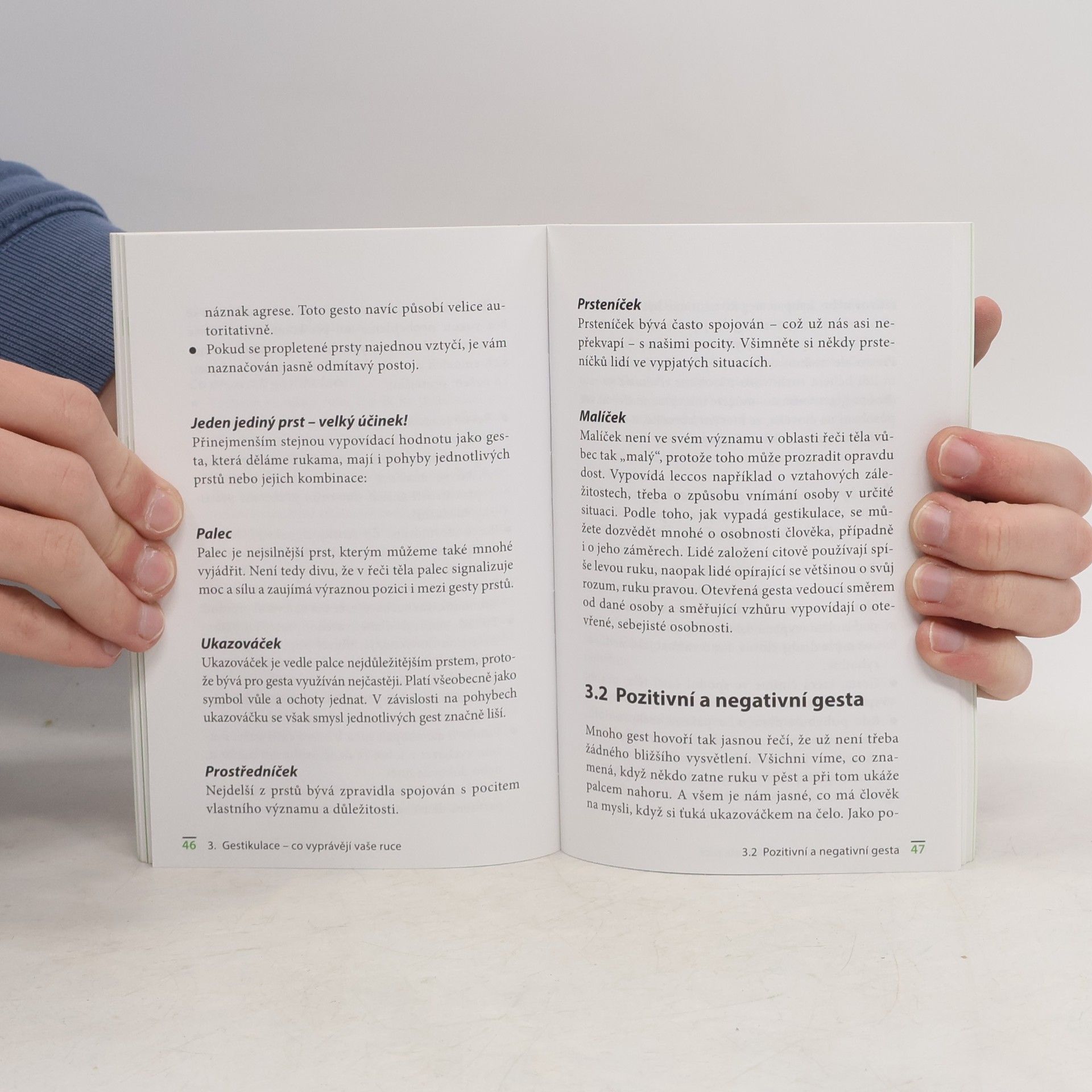 Pokud chcete blíže poznat lidi ve svém okolí nebo si udělat správný obrázek o těch, které vidíte poprvé v životě, máte v rukou správnou knihu. Autorka v ní chápe tělo jako zrcadlo duše, v němž se zobrazují naše psychické stavy. Klade si základní otázky: Co lze vyčíst z gest, z mimiky? Co z pozdravu a podání ruky? Jak poznáme, že nám někdo lže? Jak se chovat při první schůzce s opačným pohlavím a na co si dát pozor v zahraničí, aby nedošlo ke zbytečnému nedorozumění? Součástí publikace jsou i názorná cvičení.