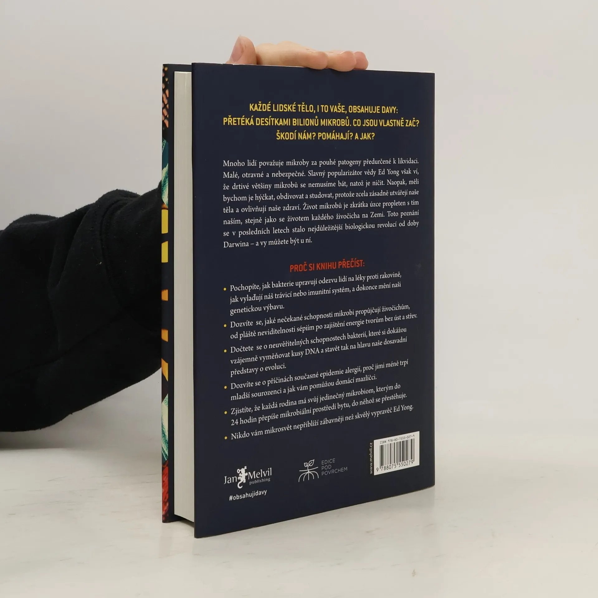 Přelomové, nádherně poučné a velmi zábavné pojednání o nejzásadnější revoluci v biologii od dob Darwina - pohled na svět „očima mikroba“, který odhaluje kouzelný a radikálně přestavěný obraz života na Zemi. Každý živočich, ať už člověk, sépie nebo vosa, je domovem milionů bakterií a dalších mikrobů. Ed Yong, jehož humor je stejně evidentní jako jeho vzdělání, nás ponouká k tomu, abychom se na sebe a své zvířecí společníky podívali v novém světle - ne jako na jedince, ale spíše jako na vzájemně propojené a závislé davy, kterými nepochybně jsme. Mikrobi v našem těle jsou součástí našeho imunitního systému a chrání nás před chorobami. V hlubokých oceánech se nacházejí záhadní tvorové bez úst a střev, kterým veškerou energii zajišťují mikrobi. Bakterie poskytují sépiím pláště neviditelnosti, pomáhají škůdcům likvidovat lesy a umožňují parazitům způsobovat nemoci postihující miliony lidí. Mnoho lidí mikroby považuje za patogeny předurčené k likvidaci, ale ti, kteří s námi žijí - mikrobiom - formují naše tělo, chrání naše zdraví, utvářejí naši identitu a zaručují nám neuvěřitelné schopnosti. V této ohromující knize vás Ed Yong zavede na velkolepou výpravu za našimi mikrobiálními partnery a představí vám vědce v předních liniích vývoje. Změní váš pohled na přírodu a zároveň i vnímání našeho místa v ní.