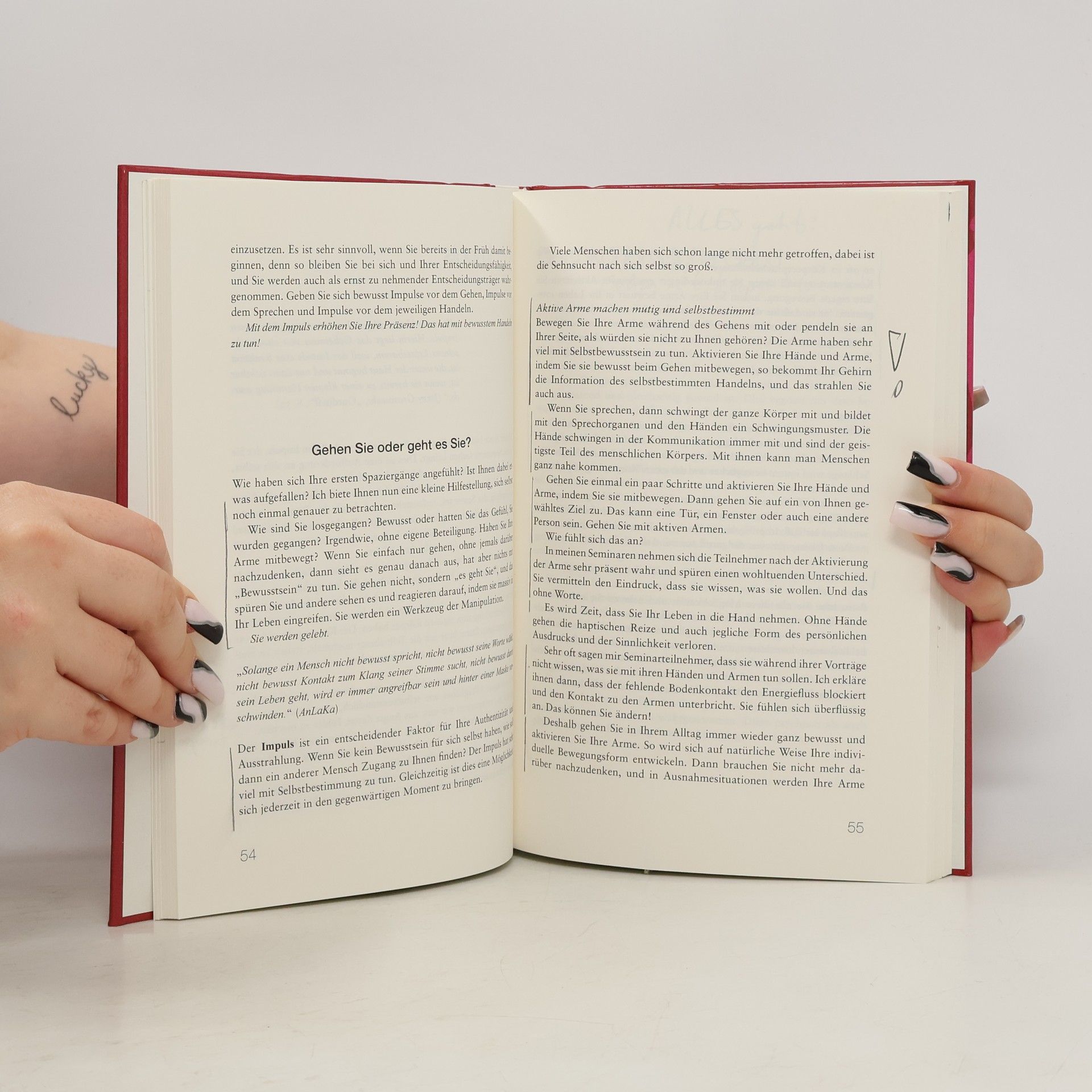 Haltung und die Fußstellung beeinflussen unser Leben! Gehen ist nicht nur Gehen, sondern das Fundament für jegliches Handeln! Jeder Gehstil hat Auswirkungen auf das gesamte Leben. Eine von der Trainerin und Schauspielerin entwickelte Methode zeigt, wie Menschen im Gehen ihre au-thentische und humorvolle Gesamtpersönlichkeit entfalten können. Diese Methode ist in der Praxis erfolg-reich erprobt und bietet ein humorvolles, konkretes Angebot, alle vergessenen Ressourcen zu aktivieren. Individualität, Mut, Kreativität, bewusste Entscheidungen und Humorfähigkeit werden durch aktive Übungen und themenbezogene Spaziergänge angeregt. Diese detailliert beschriebenen atmosphärischen Spaziergänge laden dazu ein, mit bewusster Entscheidungskraft und Selbstbestimmung zu gehen. Humorvolle, knackige Sprüche lockern die Kapitel auf, geben den Leserinnen und Lesern ein Bild zur je-weiligen Thematik und zeigen einen Weg, tief verwurzelte Muster durch Erdung, Aufrichtung und Humor-fähigkeit schlendernd zu verlassen.