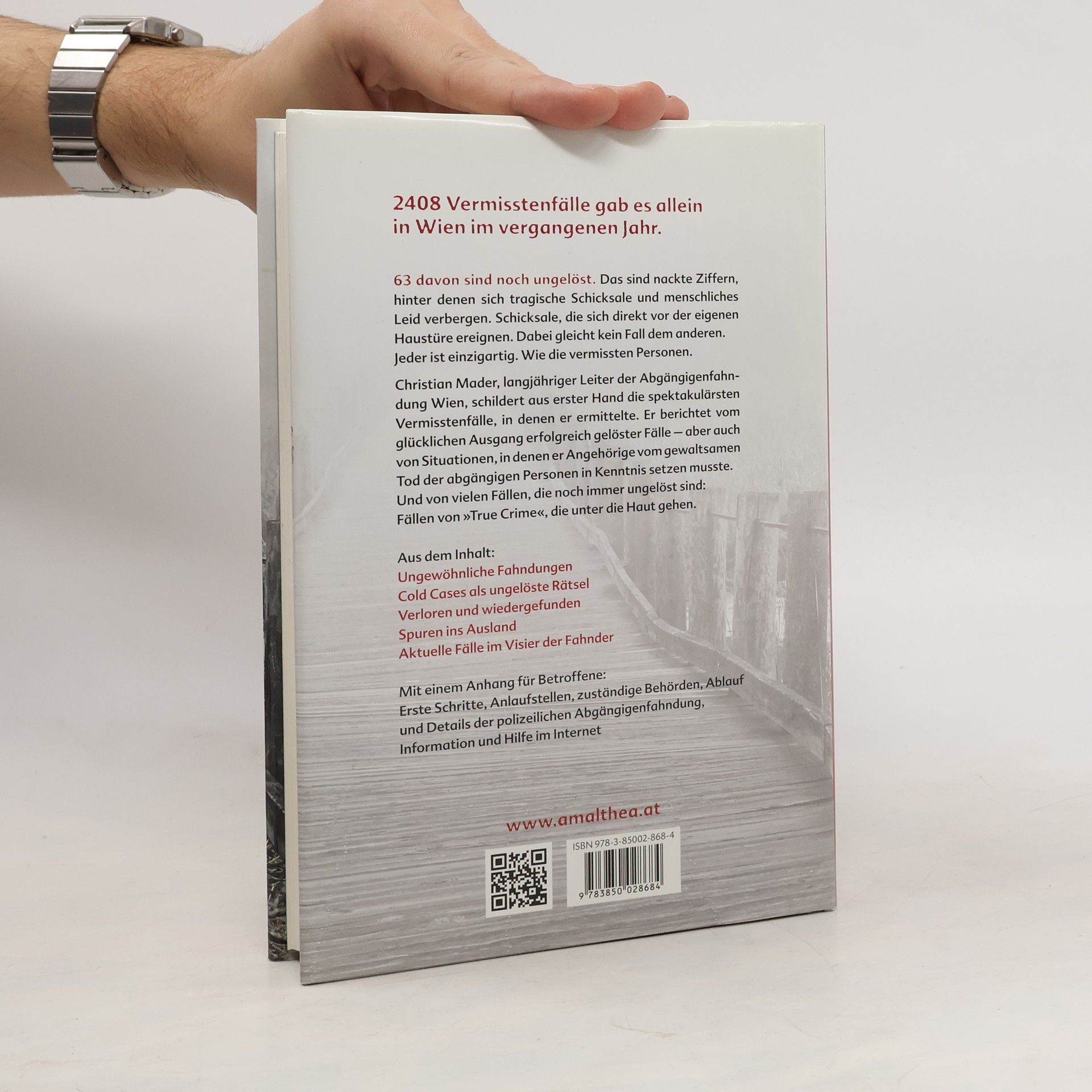 Als ehemaliger Abgängigenfahnder bei der Kriminalpolizei Wien berichtet Christian Mader von Personen, die von heute auf morgen spurlos verschwunden sind, und erzählt mit großem Einfühlungsvermögen deren ganz persönliche Geschichte. Nicht nur spektakuläre Fälle wie das immer noch rätselhafte Verschwinden der Gabriele Barta, die Ermordung von Julia Kührer oder die jahrelangen Martyrien von Elisabeth Fritzl und Natascha Kampusch gehen ans Herz – oft sind es gerade die weniger bekannten Schicksale, die besonders erschüttern. Da ist beispielsweise Mirco, der seinen Selbstmord inszenierte, den er vermutlich nie begangen hat, oder Jon, der aus dem Seniorenheim verschwand, um in seine Vergangenheit zu reisen … All diese Menschen sind als Teil dieses Buches unsterblich, wo auch immer sie gerade sein mögen.