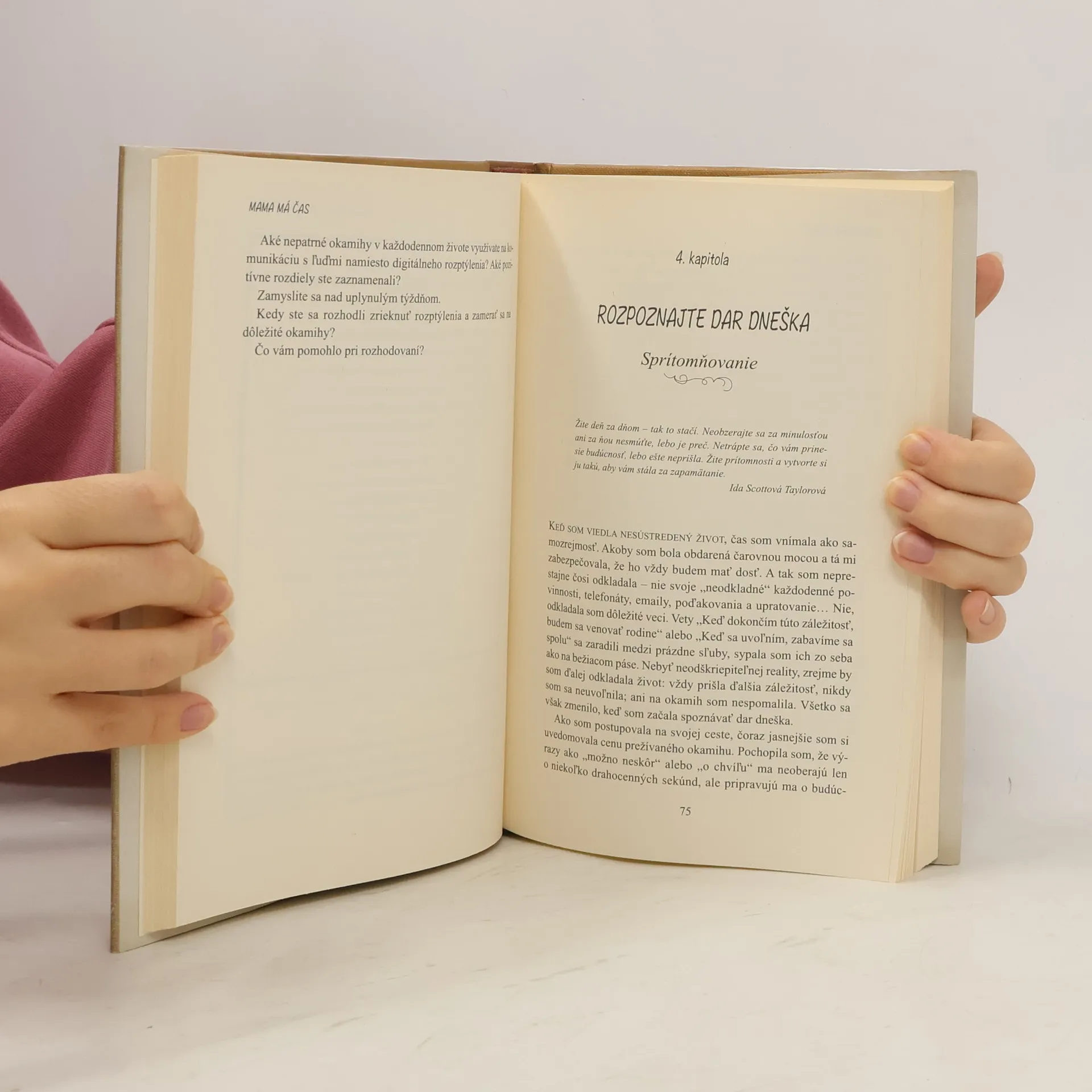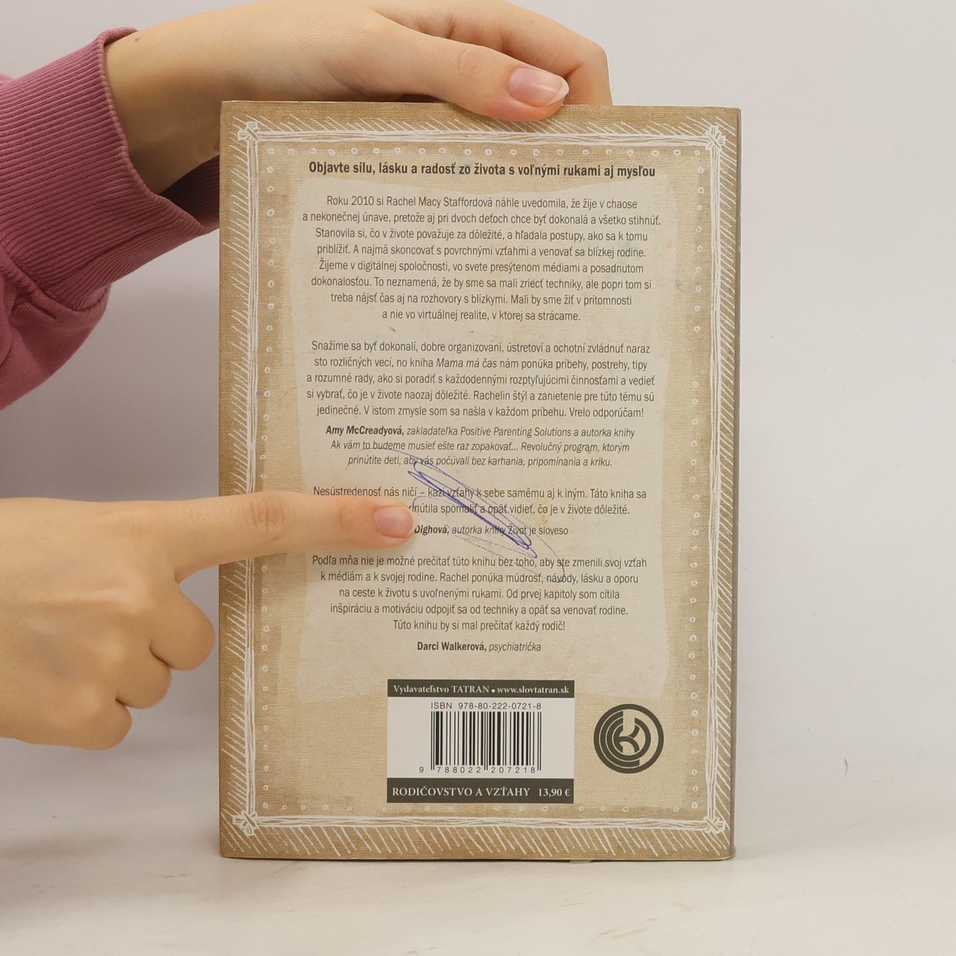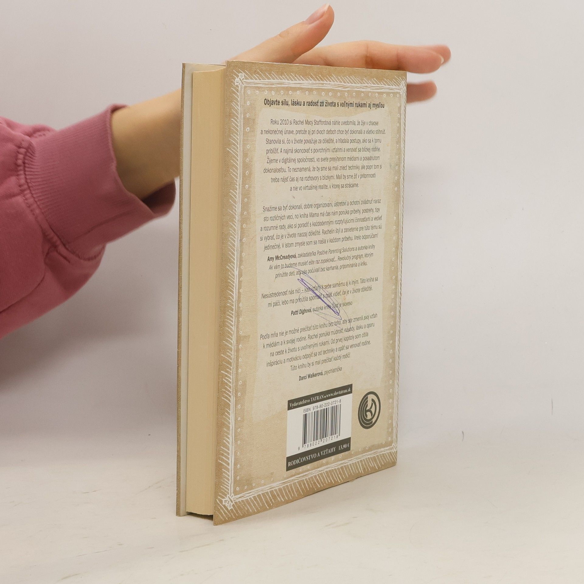 Návod, ako odložiť telefón, spáliť zoznam povinností a pochopiť, čo je naozaj dôležité! Rachel Macy Staffordová, známa blogerka, podnietila diskusiu o úlohe zaneprázdnenej matky. V knihe sa zaoberá výzvami, ktorým čelí každý rodič – od starostlivosti o batoľa po potrebu venovať pozornosť tínedžerom. Mnohé čitateľky sa po prečítaní knihy priznávajú, že sa stali lepšími matkami, ktoré sa už nenechajú rozrušiť každým malým problémom a viac si užívajú prítomnosť so svojimi deťmi. Kniha ponúka odpoveď na hľadanie rovnováhy v digitálnom svete presýtenom médiami a posadnutosťou dokonalosťou. Neznamená to vzdať sa technológie, ale nájsť si čas na skutočné spojenie s blízkymi. Odporúča zameniť povinnosti za radostné chvíle, ako je tanec s deťmi v daždi, a žiť v prítomnosti, nefalšovane a cieľavedome. Rachel Staffordová otvorí oči mnohým matkám a ukáže im, že treba vážiť si každú minútku s rodinou, pretože je to najcennejší dar. Objavte silu, lásku a radosť zo života s voľnými rukami aj mysľou. Rachel si v roku 2010 uvedomila, že žije v chaose a únave, a začala hľadať spôsoby, ako sa priblížiť k tomu, čo je v živote naozaj dôležité. V knihe sa snaží skoncovať s povrchnými vzťahmi a povzbudiť čitateľov, aby žili v prítomnosti a nie vo virtuálnej realite.