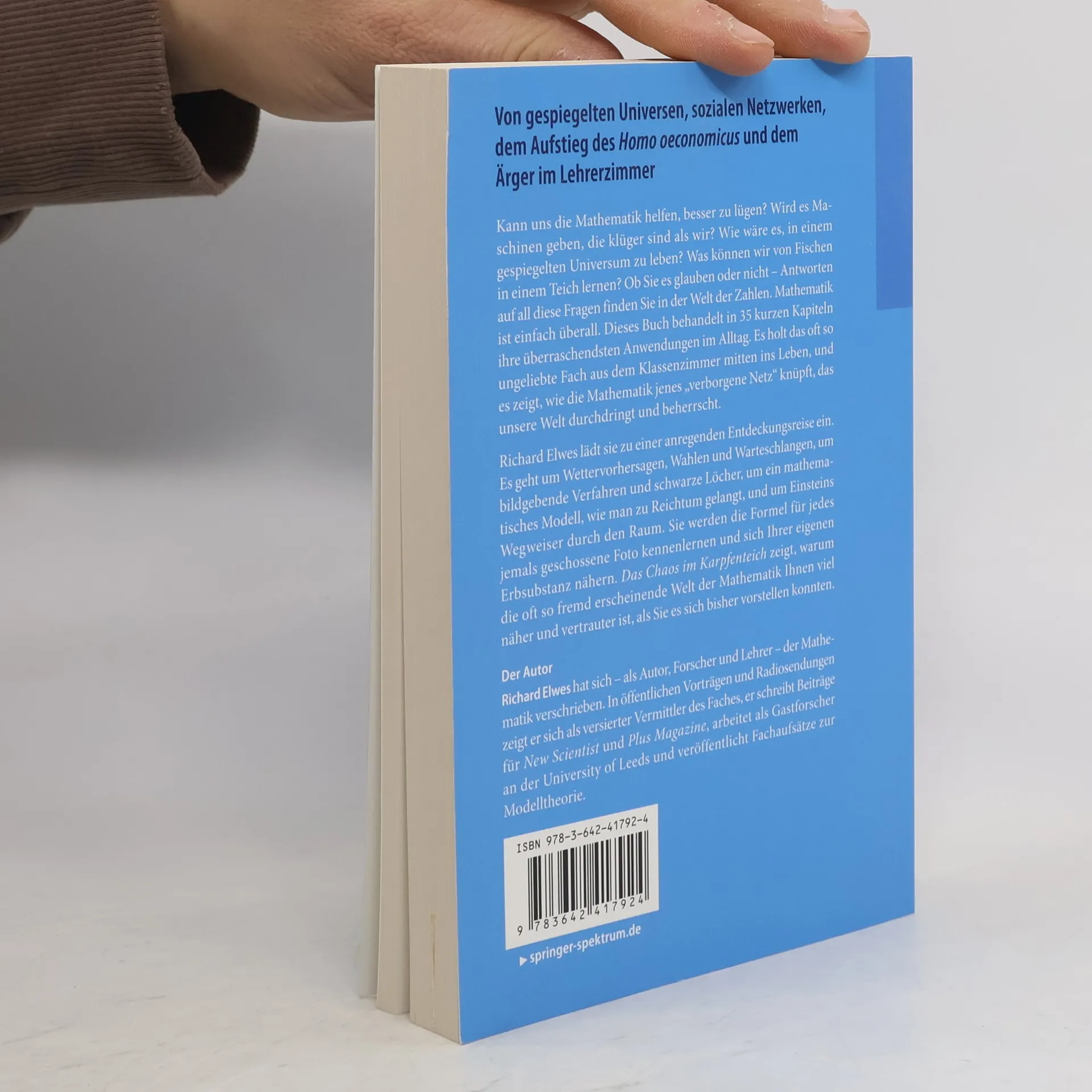 Von gespiegelten Universen, sozialen Netzwerken, dem Aufstieg des Homo oeconomicus und dem Ärger im Lehrerzimmer Kann uns die Mathematik helfen, besser zu lügen? Wird es Maschinen geben, die klüger sind als wir? Wie wäre es, in einem gespiegelten Universum zu leben? Was können wir von Fischen in einem Teich lernen? Ob Sie es glauben oder nicht – Antworten auf all diese Fragen finden Sie in der Welt der Zahlen. Mathematik ist einfach überall. Dieses Buch behandelt in 35 kurzen Kapiteln ihre überraschendsten Anwendungen im Alltag. Es holt das oft so ungeliebte Fach aus dem Klassenzimmer mitten ins Leben, und es zeigt, wie die Mathematik jenes „verborgene Netz“ knüpft, das unsere Welt durchdringt und beherrscht. Richard Elwes lädt sie zu einer anregenden Entdeckungsreise ein. Es geht um Wettervorhersagen, Wahlen und Warteschlangen, um bildgebende Verfahren und schwarze Löcher, um ein mathematisches Modell, wie man zu Reichtum gelangt, und um Einsteins Wegweiser durch den Raum. Sie werden die Formel für jedes jemals geschossene Foto kennenlernen und sich Ihrer eigenen Erbsubstanz nähern. Das Chaos im Karpfenteich zeigt, warum die oft so fremd erscheinende Welt der Mathematik Ihnen viel näher und vertrauter ist, als Sie es sich bisher vorstellen konnten.
