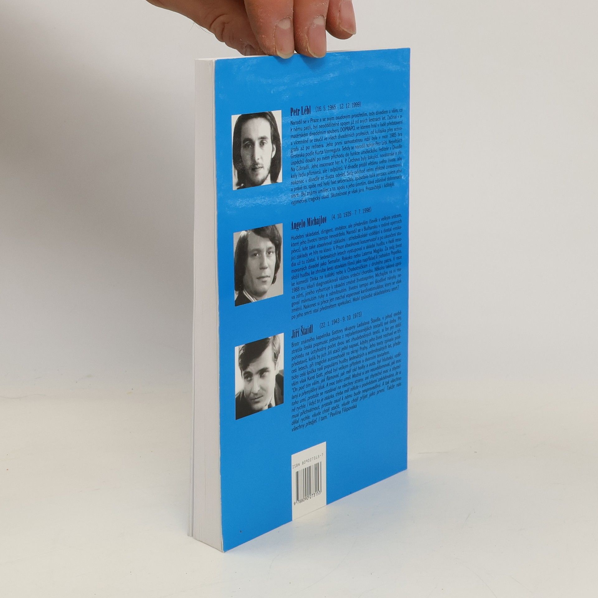 Kniha přibližuje život a úmrtí tří umělců - Petra Lébla, Angela Michajlova a Jiřího Štajdla.