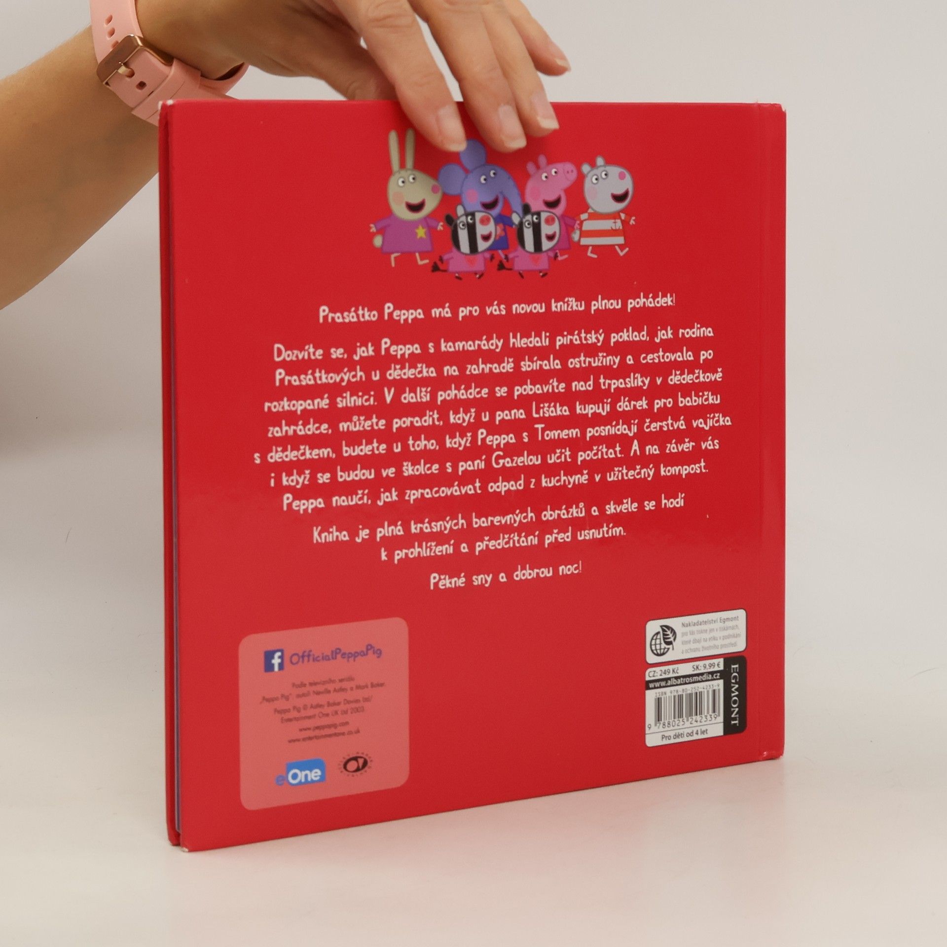 V nové knížce plné pohádek si přečtete, jak Peppa s kamarády hledala pirátský poklad nebo se ve školce učila počítat, o tom, jak s rodinou sbírali ostružiny, nakupovali u pana Lišáka, cestovali po rozkopané silnici, stavěli studnu přání, sbírali čerstvá vajíčka a vyráběli kompost. Knížka s krásnými obrázky se skvěle hodí k předčítání přes usnutím!