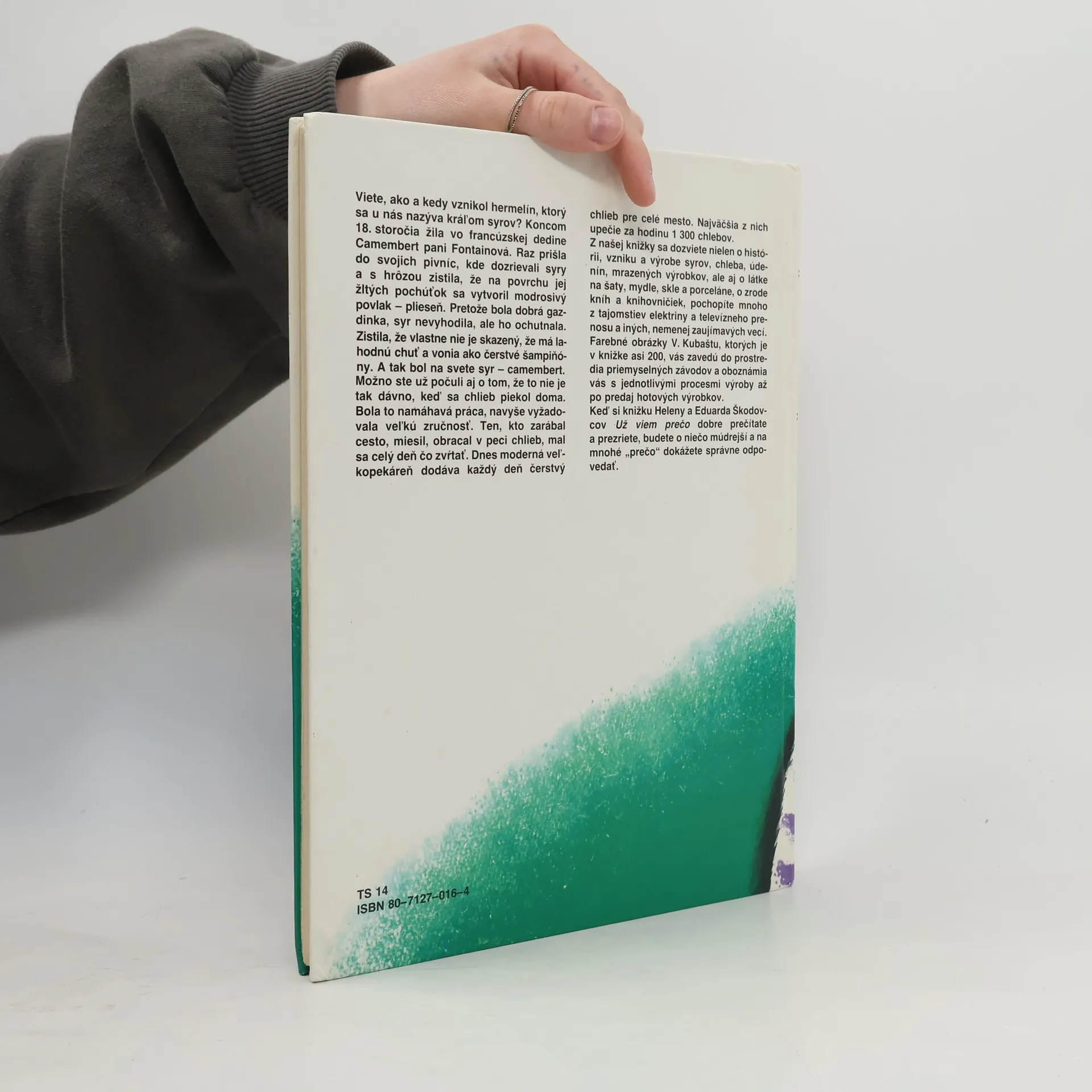 Z tejto knižky sa dozviete nielen o histórii, vzniku a výrobe syrov, chleba, údenín, mrazených výrobkov, ale aj o látke na šaty, mydle, skle a porceláne, o zrode kníh a knihovničiek, pochopíte mnoho z tajomstiev elektriny a televízneho prenosu a iných, nemenej zaujímavých vecí. Nádherné farebné ilustrácie Vojtěcha Kubaštu, ktorých je v knižke asi 200, vás zavedú do prostredia priemyselných závodov a oboznámia vás s jednotlivými procesmi výroby až po predaj hotových výrobkov. Kapitoly: Už viem prečo... pisári neodpisujú knihy, veľkopekáreň pečie rýchlejšie ako stará mama, musia syry zrieť, musia mať údeniny dym, zmrazujeme potraviny, opice objavili čokoládu, slnko vyrába cukor, je voda vzácna tekutina, mydlové bublinky ničia špinu, porcelán sa musí unúvať tri razy do pece, cvrčky opustili sklárňu, žijeme v dobe oceľovej, uhlie nie je iba na kúrenie, rastú sídliská ako huby po daždi, kožená topánka dýcha, vreteno dostalo výpoveď, žaby roztočili motory, Bajaja hrá bez povrázkov, vidím to, čo nie je vidieť, stôl nerastie v lese.