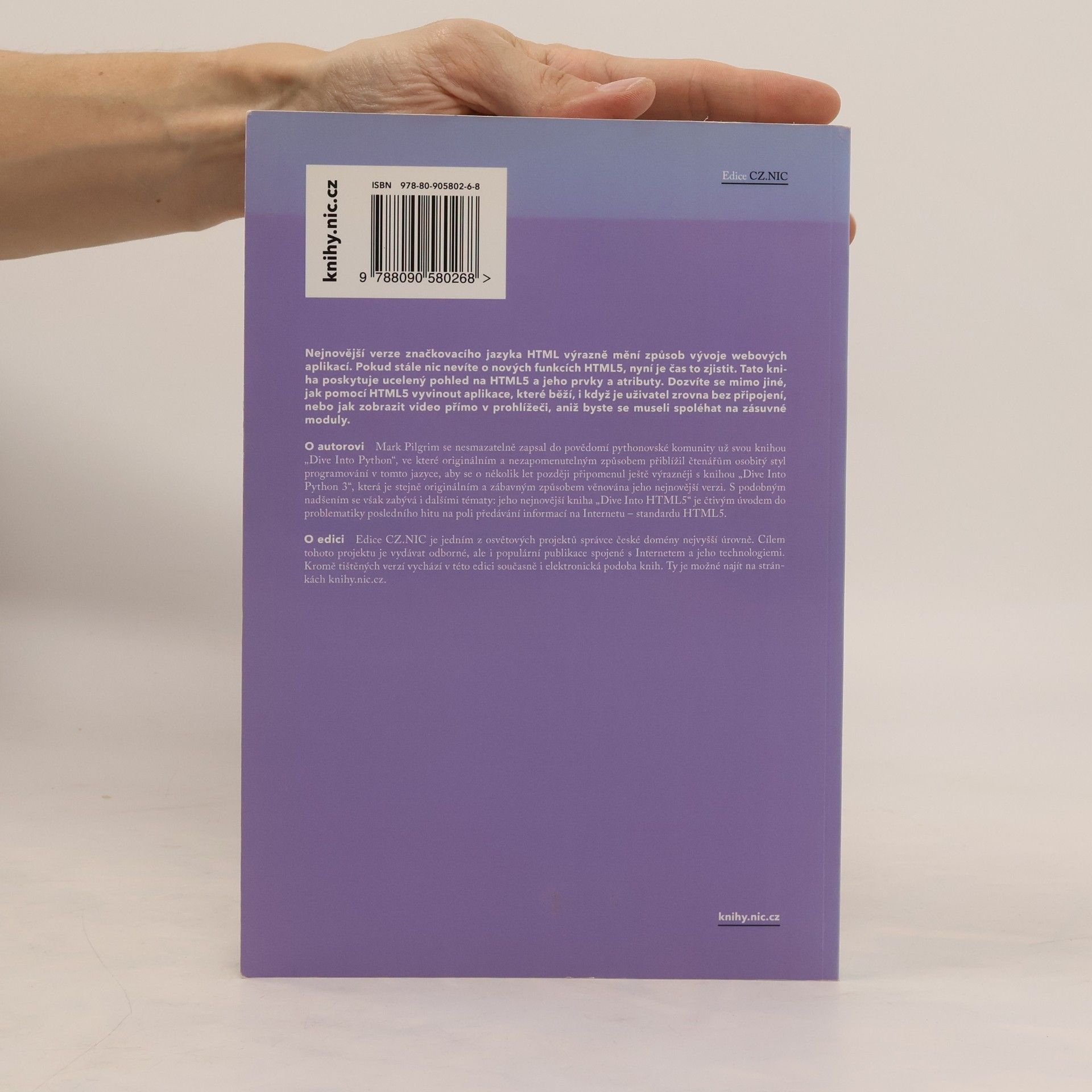 Nejnovější verze značkovacího jazyka HTML výrazně mění způsob vývoje webových aplikací. Pokud stále nic nevíte o nových funkcích HTML5, nyní je čas to zjistit. Tato kniha poskytuje ucelený pohled na HTML5 a jeho prvky a atributy. Dozvíte se mimo jiné, jak pomocí HTML5 vyvinout aplikace, které běží, i když je uživatel zrovna bez připojení, nebo jak zobrazit video přímo v prohlížeči, aniž byste se museli spoléhat na zásuvné moduly. Kniha je k dispozici ke stažení zdarma na stránkách vydavatele: https://knihy.nic.cz/