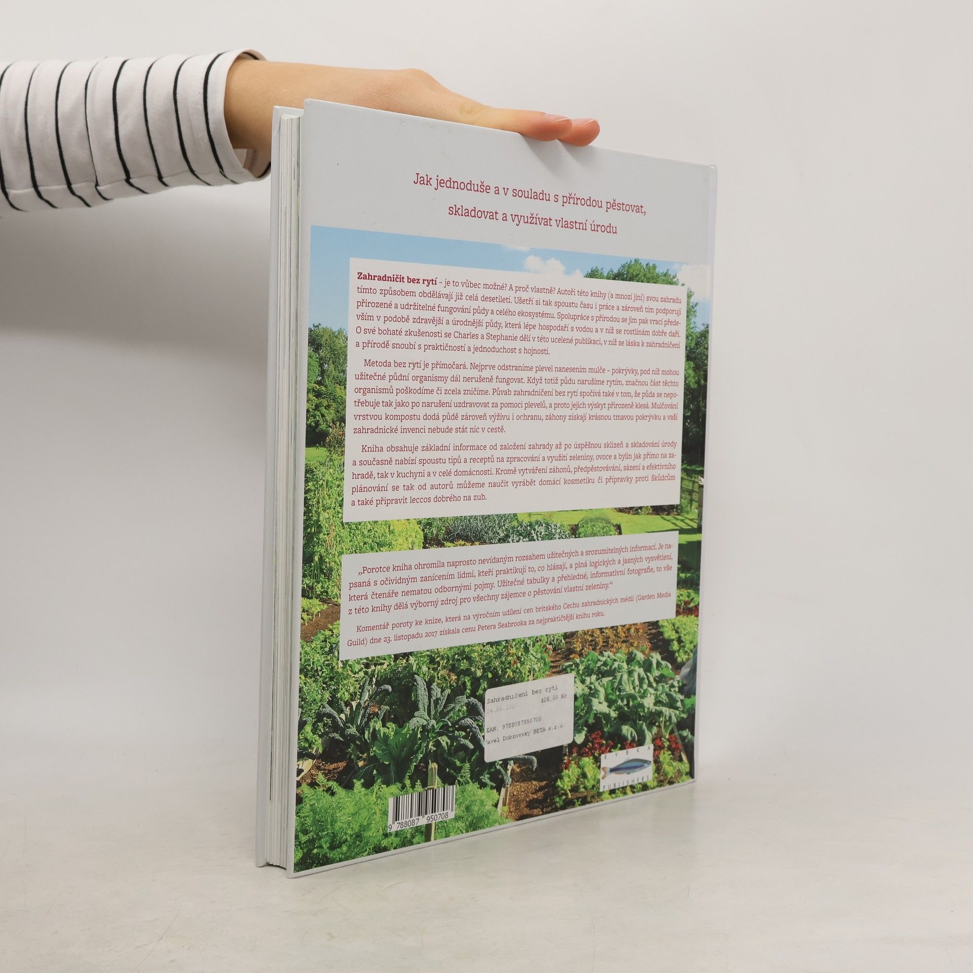 Jak jednoduše a v souladu s přírodou pěstovat, skladovat a využívat vlastní úrodu. Zahradničit bez rytí – je to vůbec možné? Autoři této knihy se touto metodou zabývají již celá desetiletí, šetří čas a práci a podporují udržitelnost půdy a ekosystému. Spolupráce s přírodou se projevuje v zdravější a úrodnější půdě, která lépe hospodaří s vodou a prospívá rostlinám. Charles a Stephanie sdílejí své zkušenosti, kde se láska k zahradničení snoubí s praktičností. Metoda bez rytí spočívá v odstranění plevelu pomocí mulče, což umožňuje užitečným půdním organismům nerušeně fungovat. Narušení půdy rytím by poškodilo tyto organismy. Zahradničení bez rytí snižuje výskyt plevelů a mulčování kompostem dodává půdě výživu a ochranu. Kniha obsahuje informace od založení zahrady po sklizeň a skladování úrody, spolu s tipy a recepty na zpracování zeleniny, ovoce a bylin. Učíte se nejen zakládat záhony, ale také vyrábět domácí kosmetiku, přípravky proti škůdcům a připravovat chutná jídla.