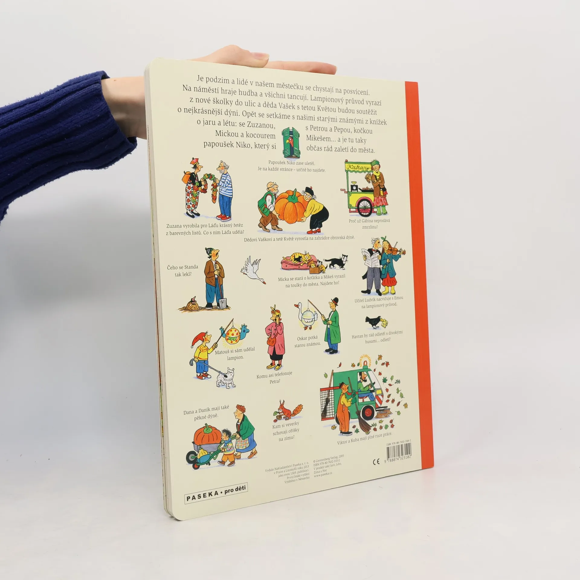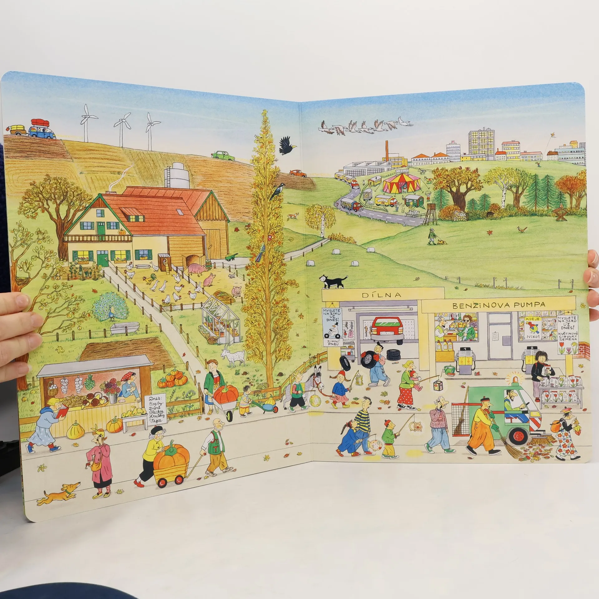 Jednoduchou řečí obrázků vypráví renomovaná autorka a ilustrátorka dětských knih Rotraut Susanne Bernerová příběhy všedního dne, obratně a vtipně splétá dohromady drobné epizody. Malý čtenář může v knížce hledat postavičky a zvířátka a sledovat, co dělají od první do poslední stránky.