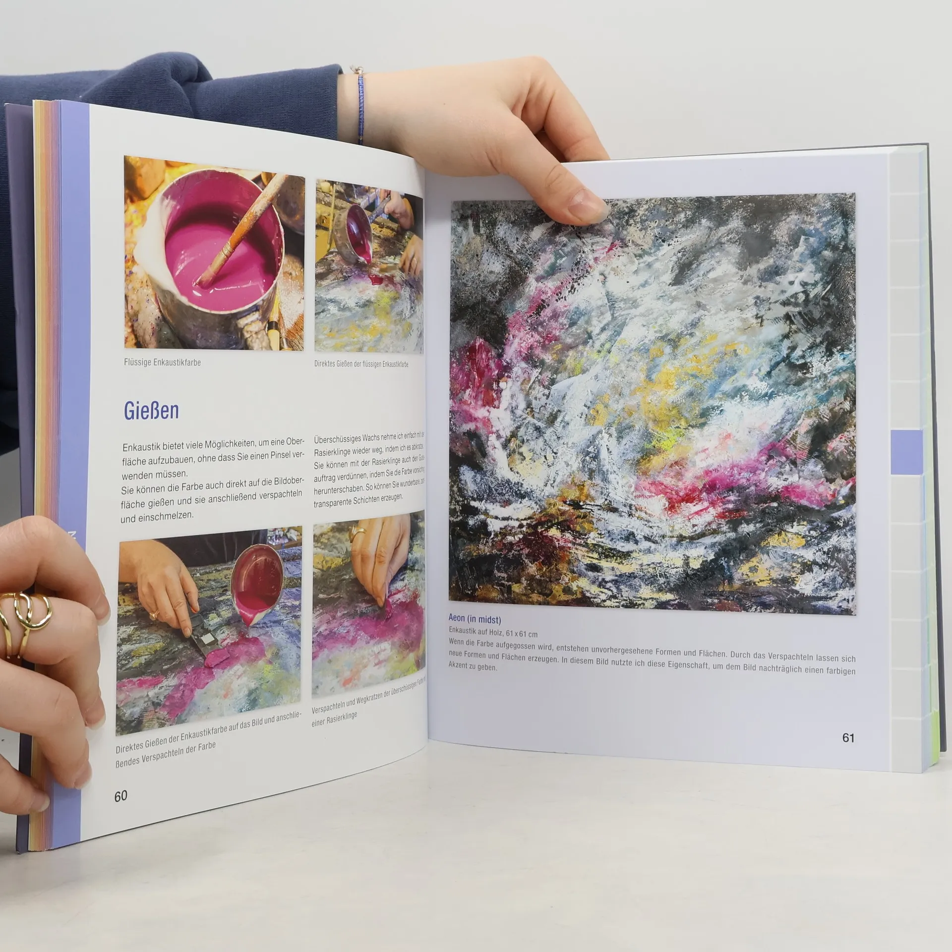 Alte Technik, moderne Kunst! Die Encaustic-Künstlerin Birgit Hüttemann-Holz gibt in diesem Buch eine umfassende Einführung in die Technik der Wachsmalerei . Sie stellt dabei nicht nur alle Materialien, Werkzeuge und Grundtechniken vor, sondern auch das gesamte Spektrum dieser traditionellen Malerei. In vielen Schritt- und Atelierfotos wird erklärt, wie der Weg zum künstlerischen Wachsbild auch Anfängern gelingt. Die Künstlerin erläutert sowohl alle gängigen Maltechniken für glatte Oberflächen als auch die professionelle Gestaltung von strukturierten Bildern . Encaustic-Collagen auf Papier, Metallfolien und mit organischem Material versehen machen deutlich, wie vielfältig die zeitgenössische Wachsmalerei ist und wie groß die Möglichkeiten für die künstlerische Gestaltung mit dem Medium Wachs sein können.