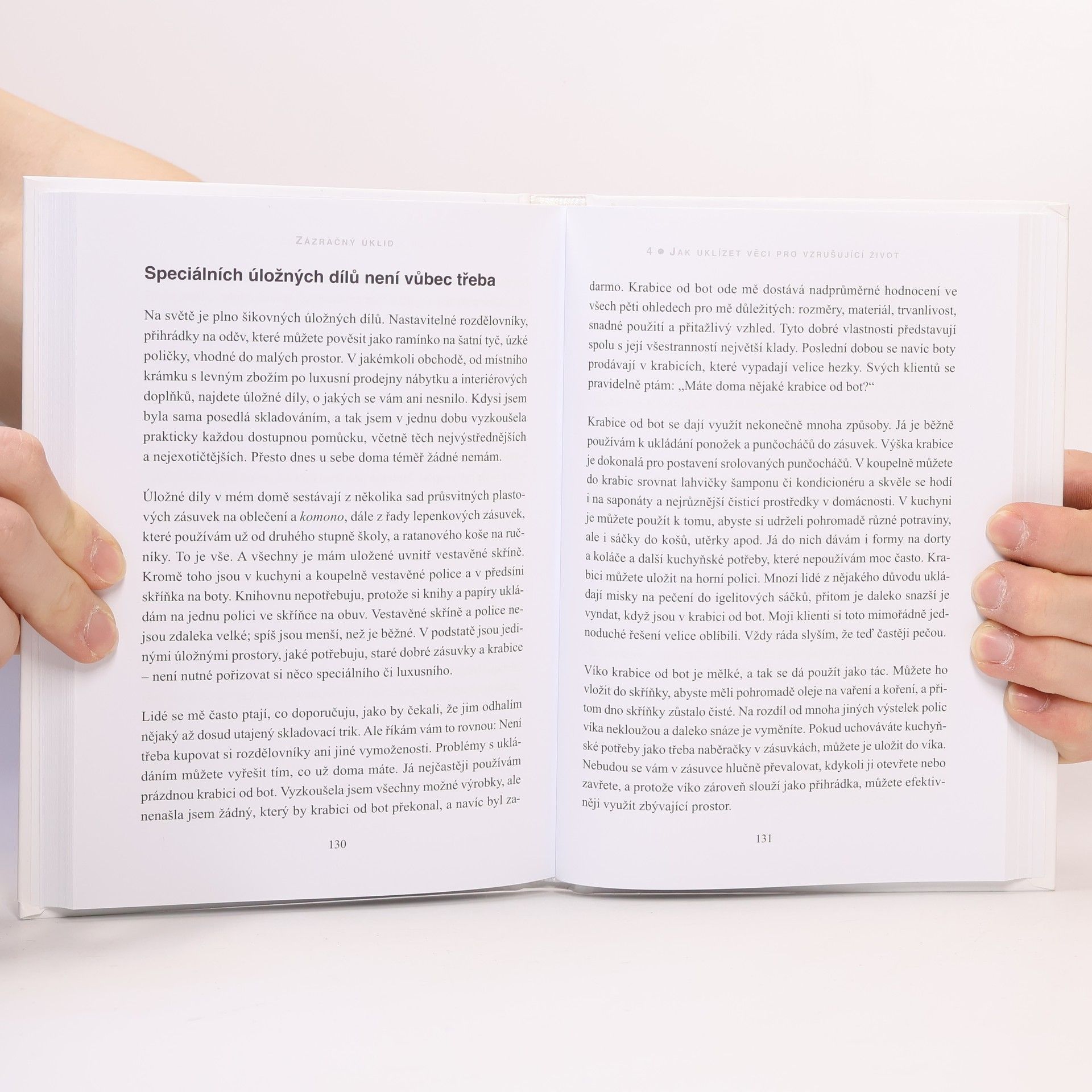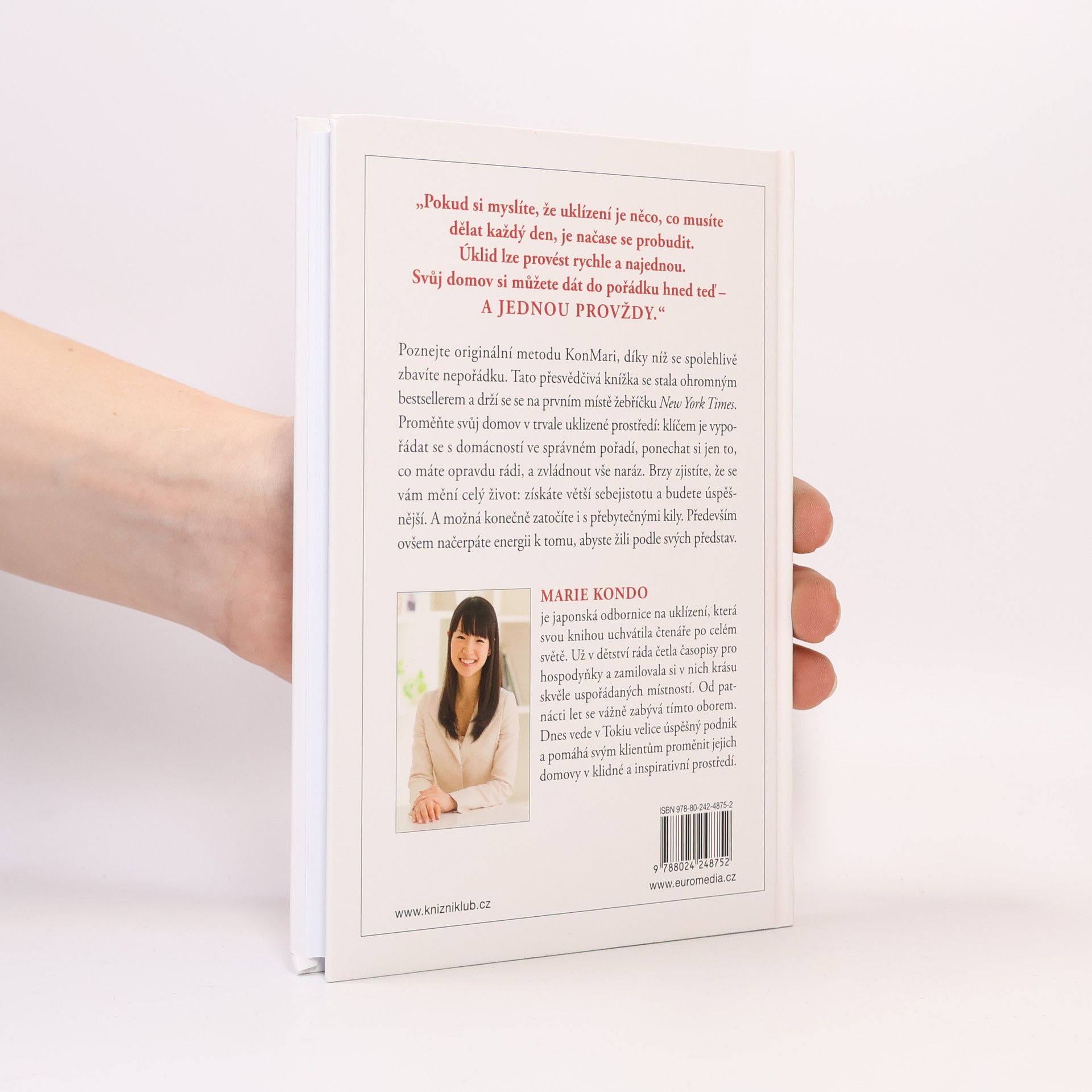 Poznejte originální umění, díky němuž se spolehlivě zbavíte nepořádku a náležitě si uspořádáte věci. Tato přesvědčivá knížka se právem stala ohromným bestsellerem po celém světě a vyšvihla se na první místo žebříčku New York Times. Proměňte svůj domov pomocí autorčiny inspirativní metody v trvale uklizené prostředí: klíčem je vypořádat se s domácností ve správném pořadí, ponechat si jen to, co opravdu milujete, a udělat vše rychle. Změníte tak svůj život – získáte větší sebejistotu, budete úspěšnější a možná i konečně zatočíte s přebytečnými kily. A především načerpáte energii k tomu, abyste žili podle svých představ.