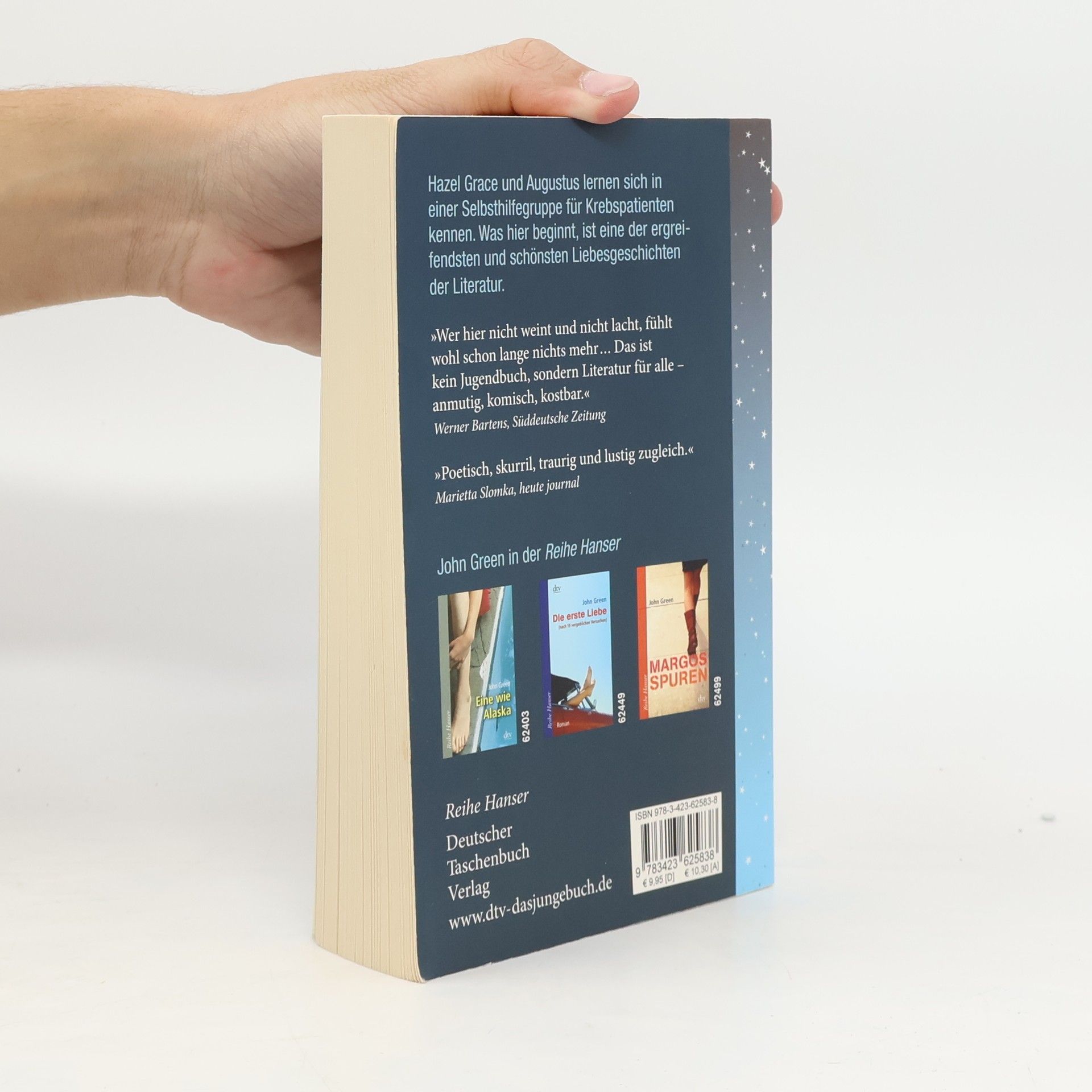 „Krebsbücher sind doof“, sagt die 16-jährige Hazel, die selbst Krebs hat. Sie will auf gar keinen Fall bemitleidet werden und kann mit Selbsthilfegruppen nichts anfangen. Bis sie in einer Gruppe auf den intelligenten, gut aussehenden und umwerfend schlagfertigen Gus trifft. Der geht offensiv mit seiner Krankheit um. Hazel und Gus diskutieren Bücher, hören Musik, sehen Filme und verlieben sich ineinander - trotz ihrer Handicaps und Unerfahrenheit. Gus macht Hazels großen Traum wahr: Gemeinsam fliegen sie nach Amsterdam, um dort Peter Van Houten zu treffen, den Autor von Hazels absolutem Lieblingsbuch. Ein tiefgründiges, emotionales und zugleich freches Jugendbuch über Krankheit, Liebe und Tod. Ausgezeichnet mit dem Deutschen Jugendliteraturpreis 2013 (Preis der Jugendjury).