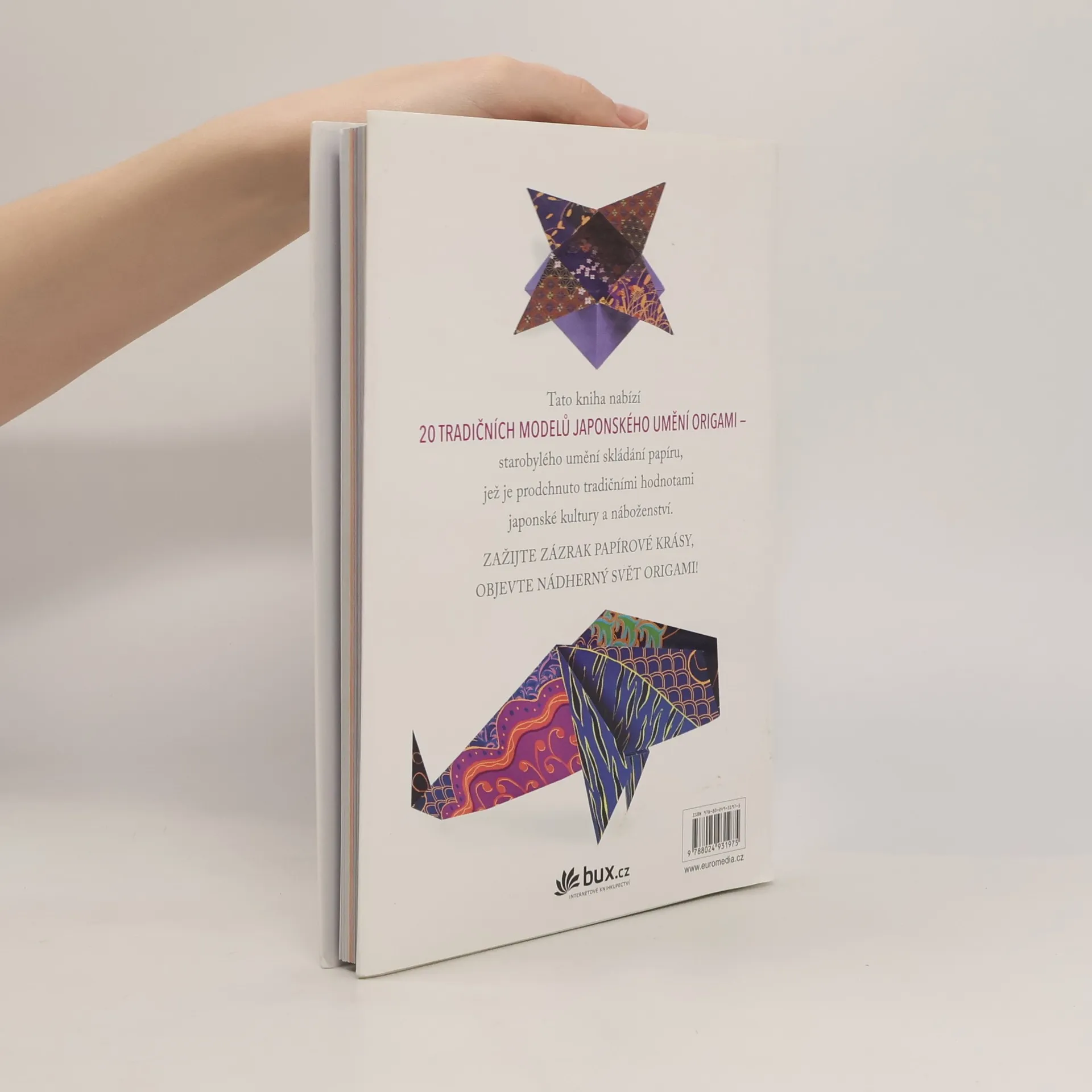 Umění origami je prodchnuto tradičními hodnotami spojenými s japonskou kulturou a náboženstvím. Tato kniha nabízí nejen úvod do starobylého umění skládání papíru, ale především 20 tradičních modelů s přehlednými diagramy a symboly, QR kódy a odkazy na video návody „krok za krokem“ na YouTube.