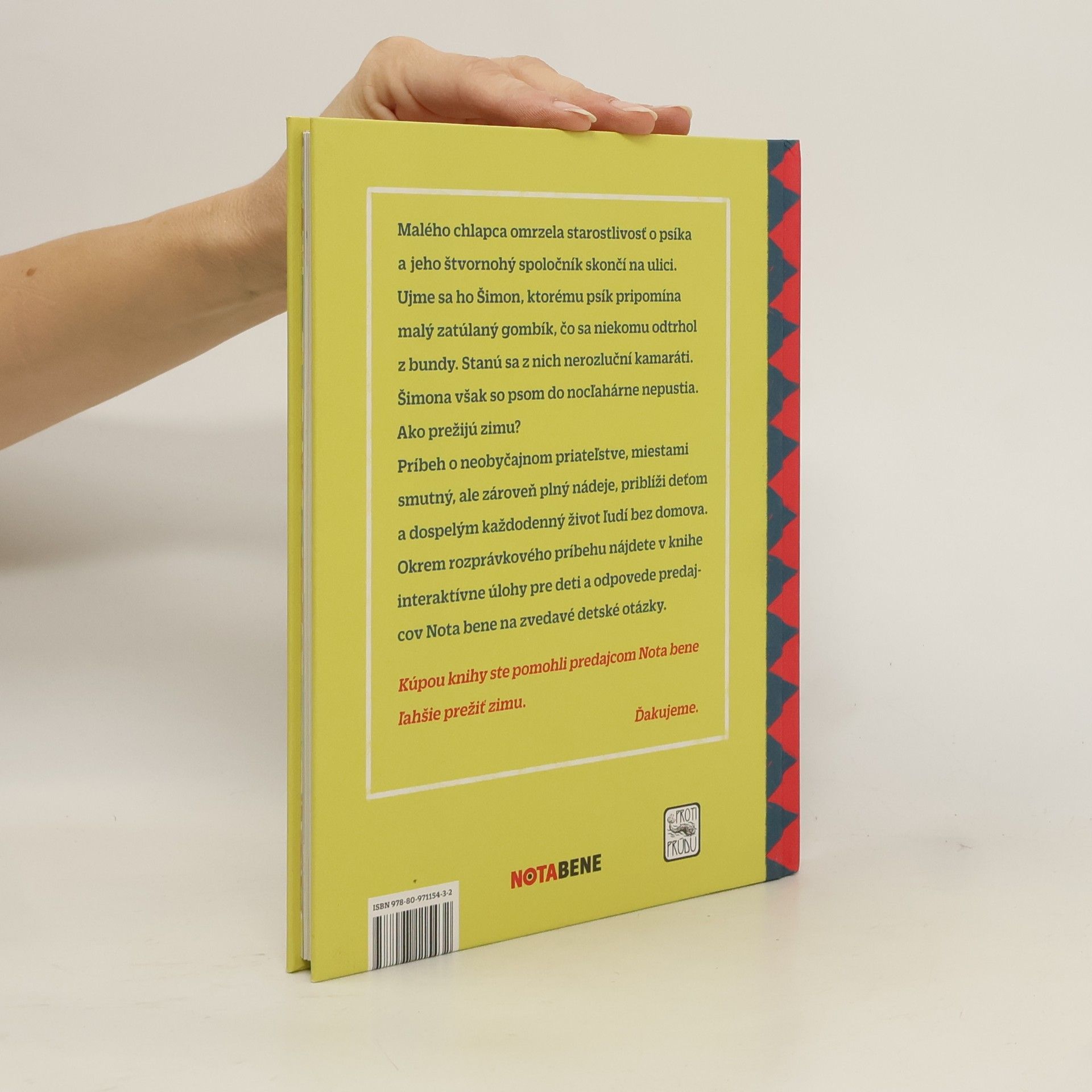 Malého chlapca omrzela starostlivosť o psíka a jeho štvornohý spoločník skončí na ulici. Ujme sa ho Šimon, ktorému psík pripomína malý zatúlaný gombík, čo sa niekomu odtrhol z bundy. Stanú sa z nich nerozluční kamaráti. Šimona však so psom do nocľahárne nepustia. Ako prežijú zimu? Príbeh o neobyčajnom priateľstve, miestami smutný, ale zároveň plný nádeje, priblíži deťom a dospelým každodenný život ľudí bez domova. Okrem rozprávkového príbehu nájdete v knihe aj interaktívne úlohy pre deti a odpovede predajcov Nota bene na zvedavé detské otázky.