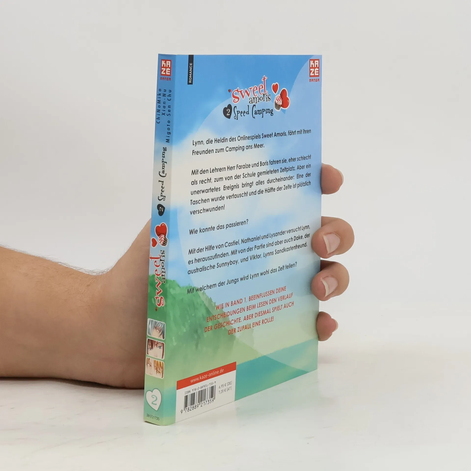 Lynn, die Heldin des Onlinespiels Sweet Amoris, fährt mit ihren Freunden zum Camping ans Meer. Mit den Lehrern Herr Faraize und Boris fahren sie, eher schlecht als recht, zum von der Schule gemieteten Zeltplatz. Aber ein unerwartetes Ereignis bringt alles durcheinander: Eine der Taschen wurde vertauscht und die Hälfte der Zelte ist plötzlich verschwunden! Wie konnte das passieren? Mit der Hilfe von Castiel, Nathaniel und Lysander versucht Lynn, es herauszufinden. Mit von der Partie sind aber auch Dake, der australische Sunnyboy, und Viktor, Lynns Sandkastenfreund. Mit welchem der Jungs wird Lynn wohl das Zelt teilen? WIE IN BAND 1, BEEINFLUSSEN DEINE ENTSCHEIDUNGEN BEIM LESEN DEN VERLAUF DER GESCHICHTE. ABER DIESMAL SPIELT AUCH DER ZUFALL EINE ROLLE!