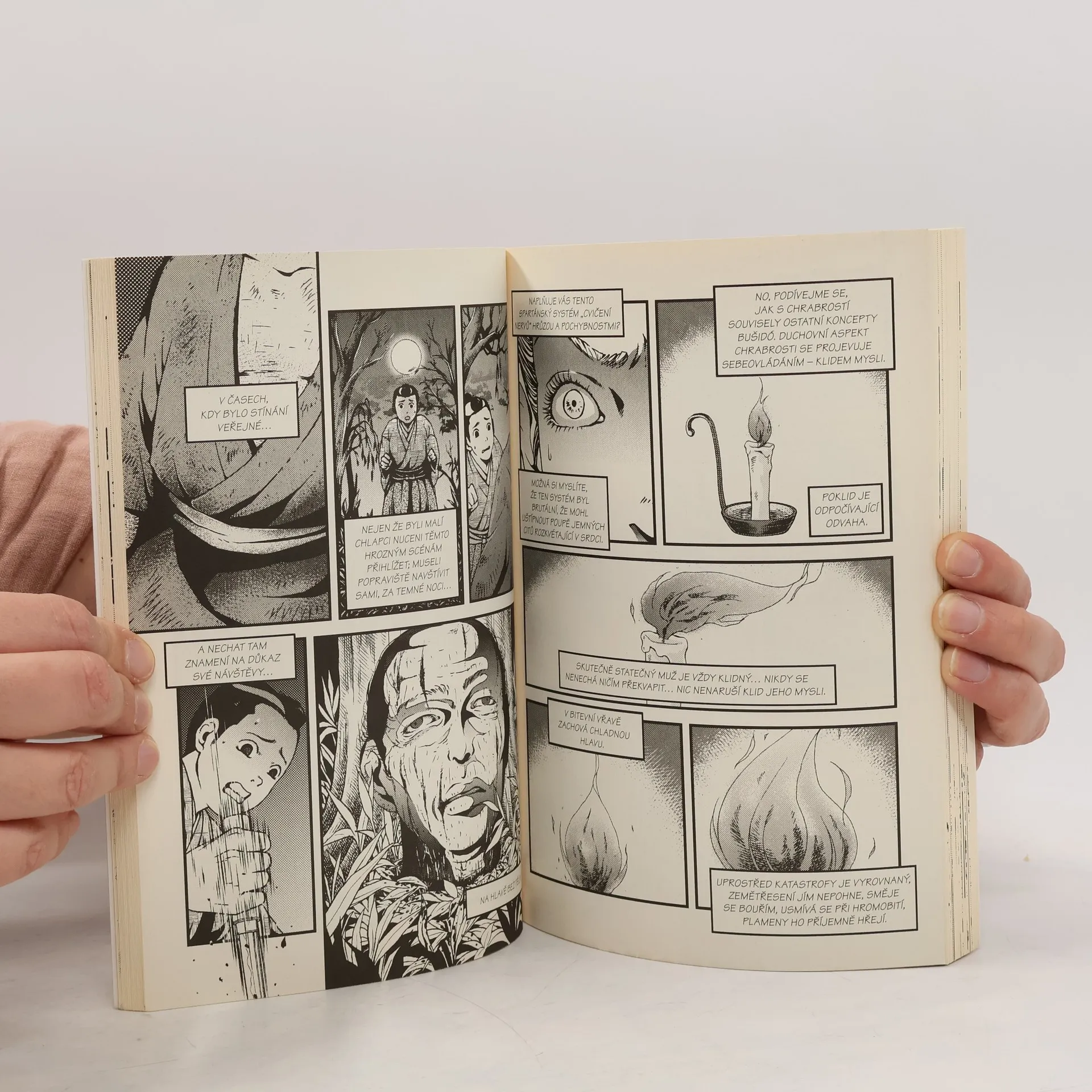 Skutečně statečný muž je vždy klidný, nenechá se zaskočit, nic nenaruší vyrovnanost jeho ducha. V zápalu boje zachová klid. Zemětřesení jím neotřesou, směje se bouřím. Obdivujeme ho jako vskutku skvělého muže, jenž v zlověstné přítomnosti nebezpečí nebo smrti neztrácí rozvážnost, který v ohrožení života dokáže složit báseň. V komiksové verzi kultovní klasiky Bušidó ožívají tajemství života samurajů.