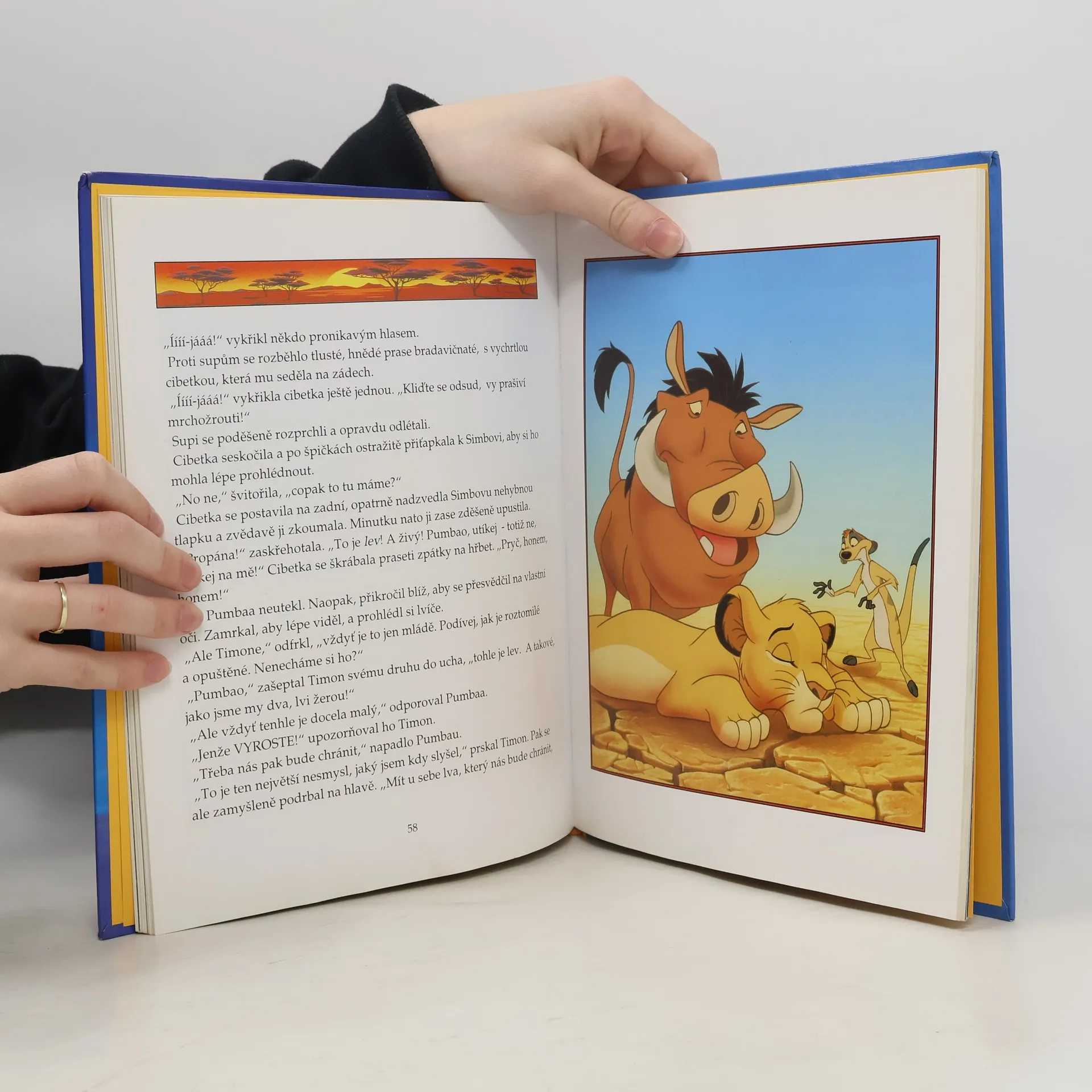 Strhující příběh nás zavádí do nitra Afriky, na vyprahlou planinu pod Lví skálou, kde se shromáždila zvířata, aby oslavila narození malého lvíčka Simby, budoucího krále. Z potomka krále Mufasy a královny Sarabi se raduje celá říše - až na králova bratra, zlého Scara. Ten se nemůže smířit s tím, že se dědicem trůnu stal Simba, a promýšlí, jak se ho navždy zbavit. S pomocí tří hyen, které se neštítí ničeho, začíná svůj krutý plán uskutečňovat.