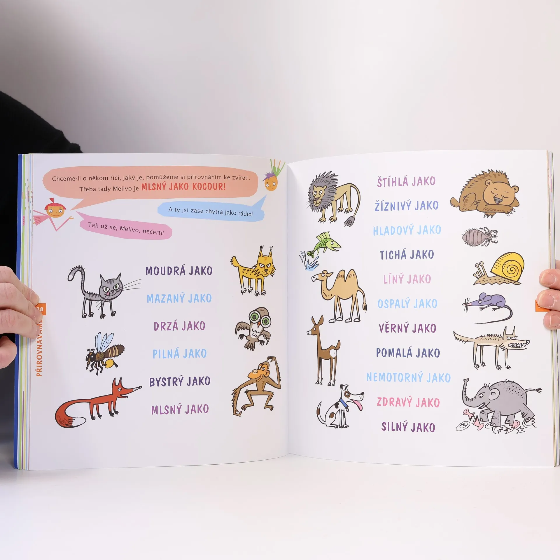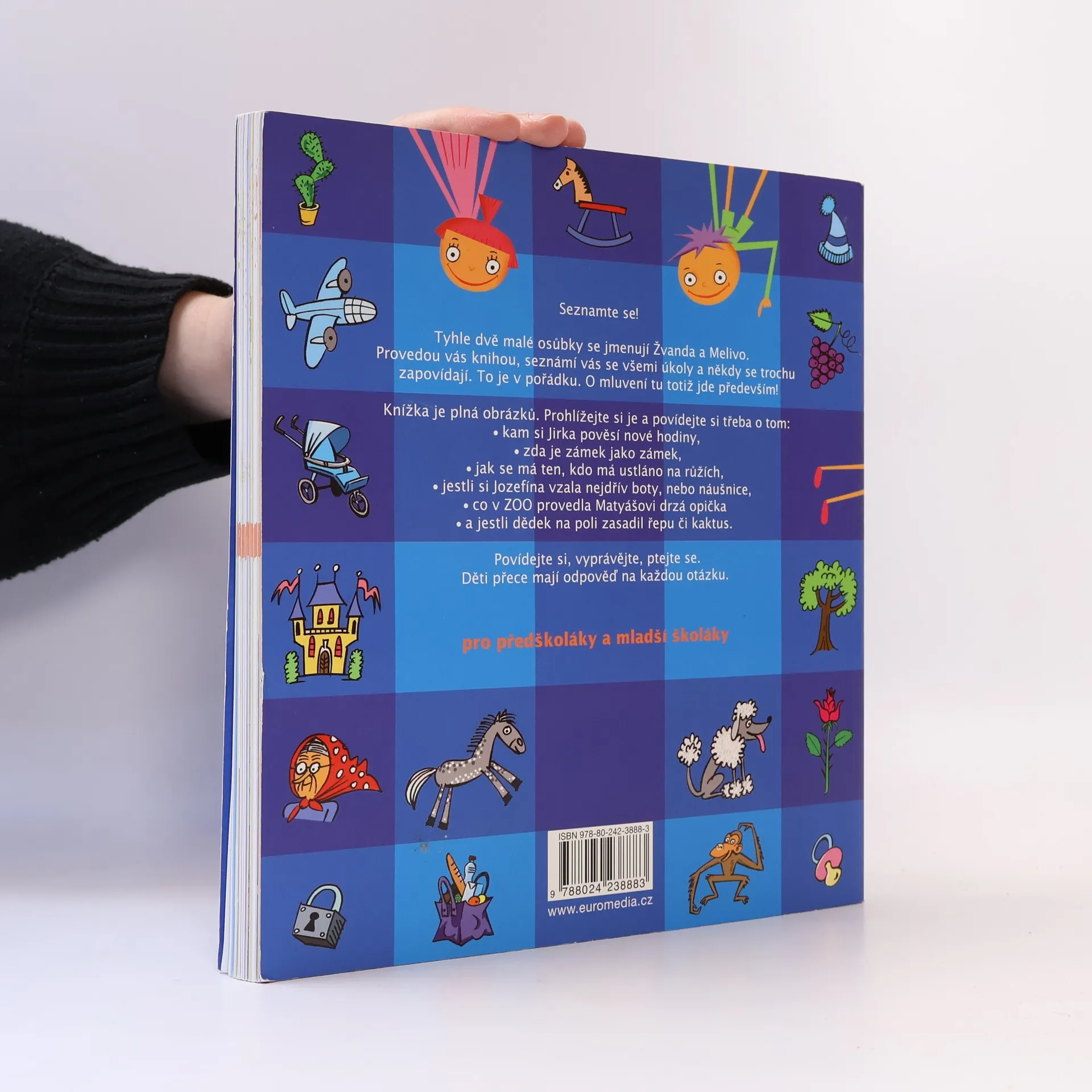 Knížka pro děti předškolního a mladšího školního věku se zaměřuje na zábavný rozvoj slovní zásoby a jazykového citu. Pomocí zajímavých úkolů, básniček, příběhů a hádanek, doplněných živými ilustracemi, se děti učí hrát si s jazykem a přesně vyjadřovat myšlenky a city. Kniha nabízí možnosti vybarvování, spojování čarami, kroužkování a podtrhávání, ale především podněcuje k mluvení. Dětem pomáhají dva upovídaní panáčci - Žvanda a Melivo, kteří radí a vysvětlují úkoly. Zadání nejsou striktní a slouží jako témata k hovoru, která lze dále rozvíjet. Úkoly se dělí do tří okruhů: první část využívá každodenní zkušenosti (barvy, činnosti, svět kolem nás), druhá se zaměřuje na jazykový systém (synonyma, protiklady, rýmy) a třetí na vyprávění (příběhy podle obrázků, logická posloupnost, popisy situací). Interaktivní knížka má děti pobavit i poučit, ideální pro rodiče, kteří chtějí připravit své děti na školu. Pro zvídavé děti představuje úkoly především dobrou zábavu.