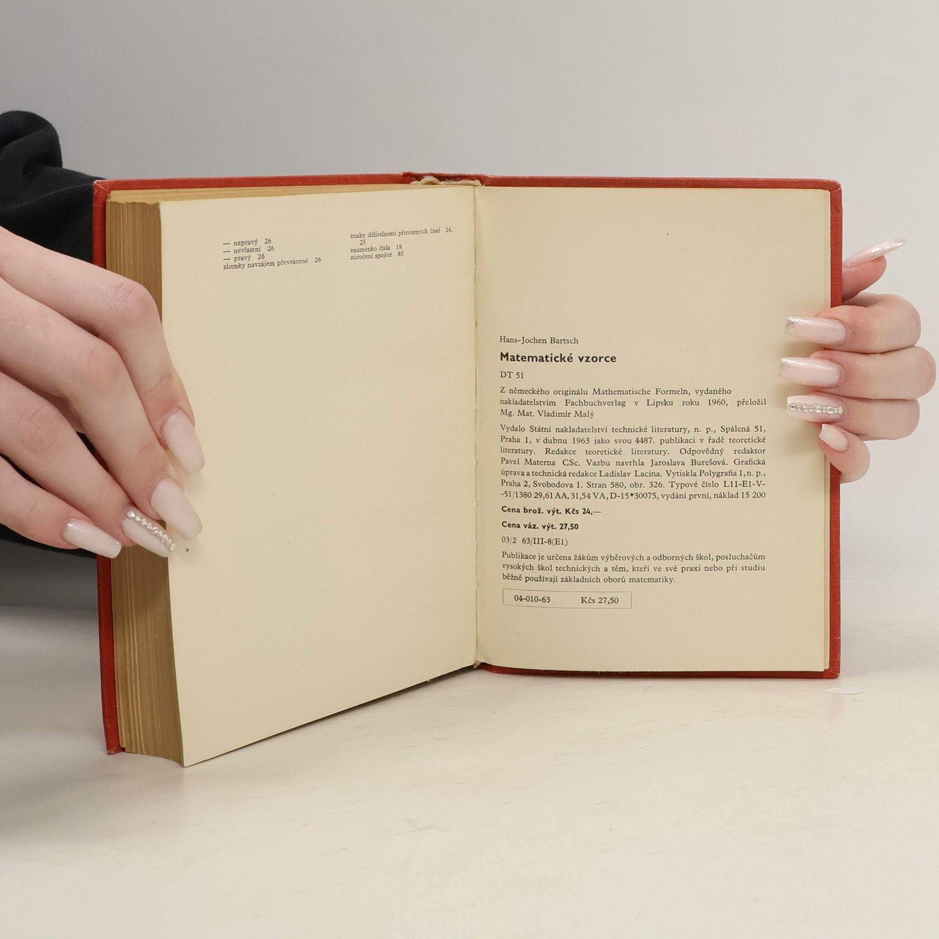 Publikace zahrnuje nejdůležitější definice, věty a metody ze základních oborů užité matematiky. Zvláštní pozornost je věnována výběru matematických vzorců a ilustrativním řešeným příkladům. Kromě základů matematické logiky a teorie množin obsahuje aritmetiku a elementární algebru, rovnice a nerovnice, základní funkce, procentový a úrokový počet, vektorový a maticový počet, elementární geometrii, rovinnou a sférickou trigonometrii, analytickou geometrii v rovině a prostoru, diferenciální a integrální počet, diferenciální geometrii, obyčejné a parciální diferenciální rovnice, posloupnosti a řady, Fourierův integrál a Laplaceovu transformaci, počet pravděpodobnosti a matematickou statistiku, lineární optimalizaci, spínačovou algebru a vzorce z regulační techniky. Knihu doplňují matematické tabulky, přehled znaků a symbolů, přehled literatury a věcný rejstřík. Je určena studujícím středních škol všech zaměření, posluchačům vysokých škol technických, ale hlavně těm čtenářům, kteří při své pracovní nebo studijní činnosti potřebují rychlou a přesnou informaci ze základní oblasti aplikované matematiky.