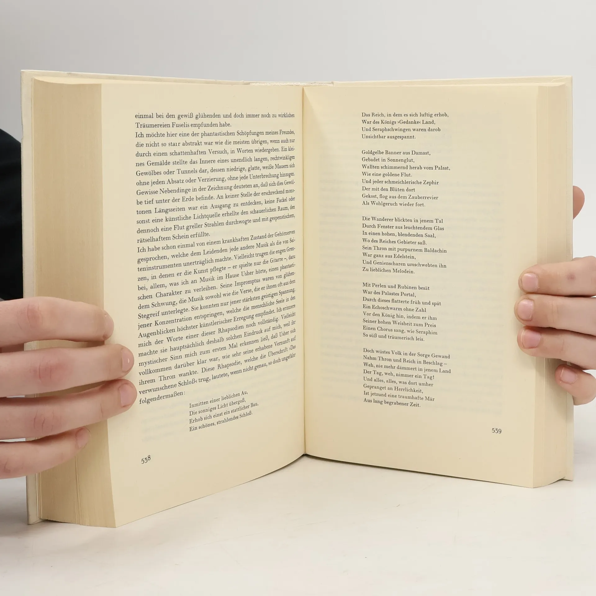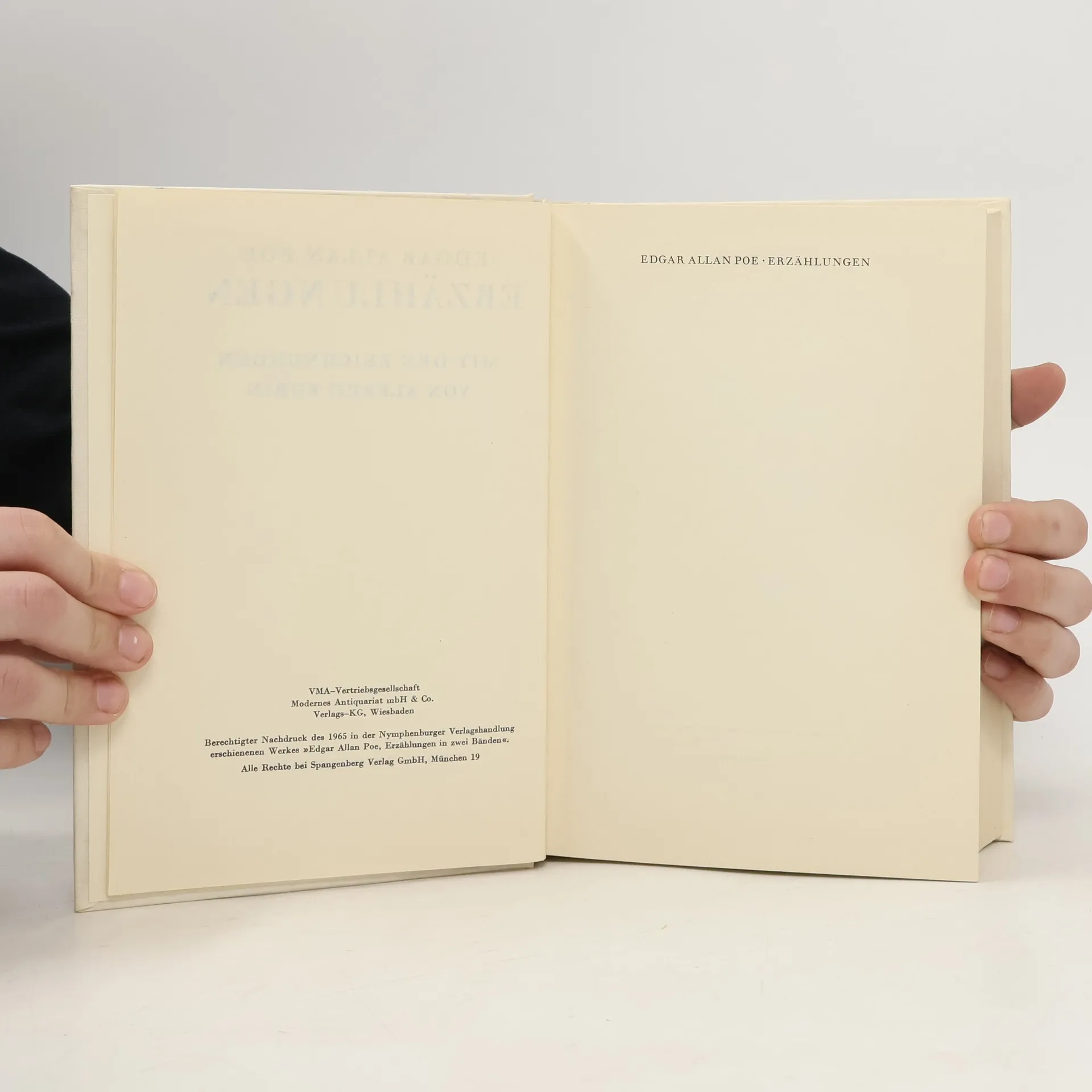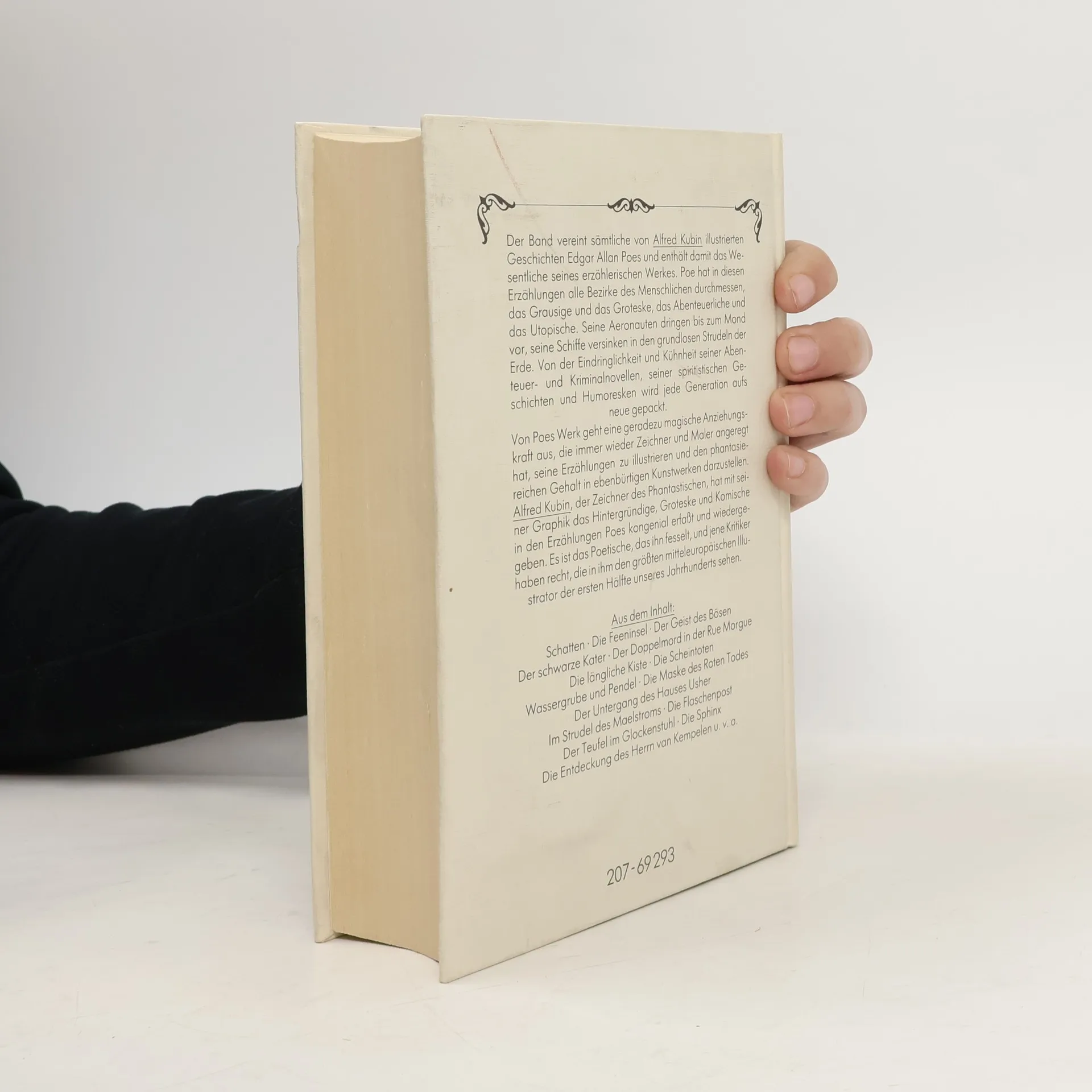 Aus dem Amerikanischen von A.v. Bosse, J.v.d. Goltz, M. Bretschneider, H. Kauders und W. Widmer. Mit Nachwort, Anmerkungen und Zeittafel von F.T. Zumbach. Inhalt: Das Manuskript in der Flasche Berenice Morella Das Stelldichein Ligeia Der Untergang des Hauses Usher William Wilson Der Mann der Menge Der mord in der Rue Morgue Der Malstrom Das ovale Porträt Die Maske des roten Todes Eleonora Das Geheimnis der Marie Roget Das verräterische Herz Der Goldkäfer Der schwarze Kater Die Grube und das Pendel Im Felsengebirge Die Augengläser Vorzeitiges Begräbnis Die längliche Kiste Der wahre Sachverhalt im Falle Valdemar Der entwendete Brief Das Faß Amontillado Der Froschhüpfer Seltsame Erlebnisse des Arthur Gordon Pym aus Nantucket Format 11,5 x 19 cm. Gebunden mit Schutzumschlag.