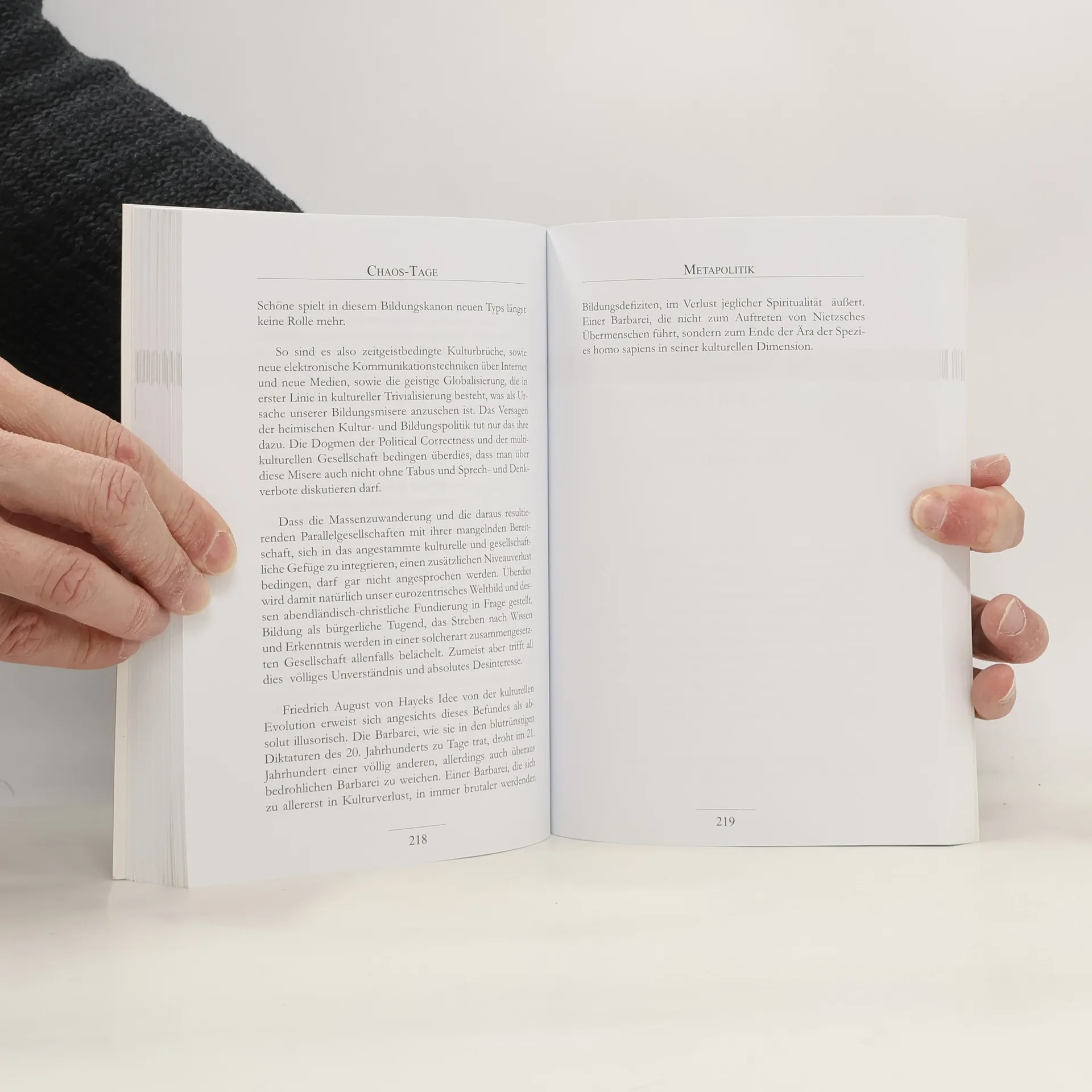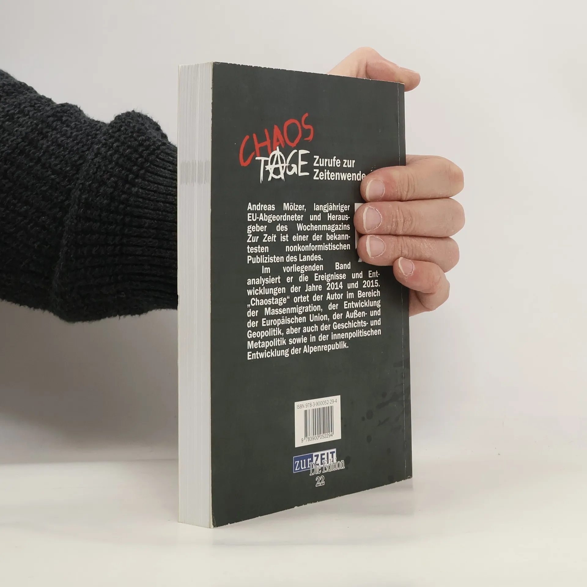 Andreas Mölzer, langjähriger EU-Abgeordneter und Herausgeber des Wochenmagazins Zur Zeit ist einer der bekanntesten nonkonformistischen Publizisten des Landes. Im vorliegenden Band analysiert er die Ereignisse und Entwicklungen der Jahre 2014 und 2015. „Chaostage“ ortet der Autor im Bereich der Massenmigration, der Entwicklung der Europäischen Union, der Außen- und Geopolitik, aber auch der Geschichts- und Metapolitik sowie in der innenpolitischen Entwicklung der Alpenrepublik.