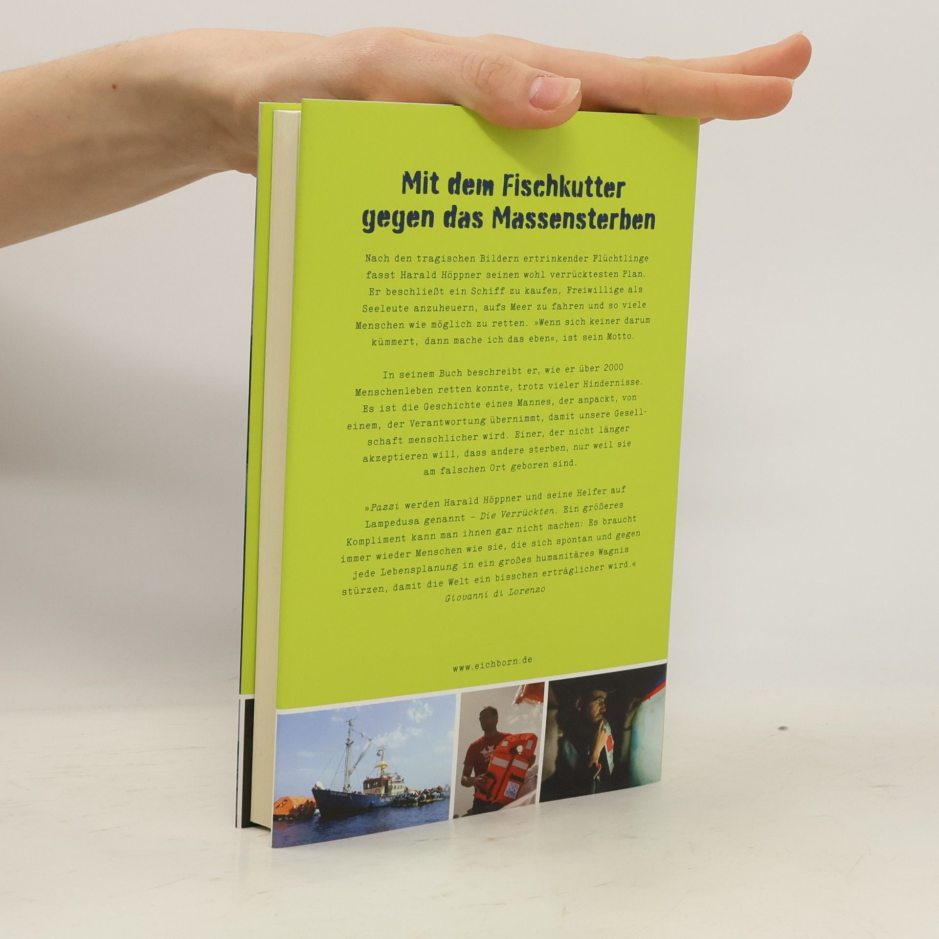 Mit dem Fischkutter gegen das Menschensterben Nach den tragischen Bildern ertrinkender Flüchtlinge fasst Harald Höppner seinen wohl verrücktesten Plan. Er beschließt ein Schiff zu kaufen, freiwillige Seemänner anzuheuern, aufs Meer zu fahren und so viele Menschen wie möglich zu retten. „Wenn sich keiner darum kümmert, dann mache ich das eben“, war sein Motto. In seinem Buch beschreibt er, wie er über 2000 Menschenleben retten konnte, trotz vieler Hindernisse. Es ist die Geschichte von einem, der anpackt, von einem, der Verantwortung übernimmt, damit unsere Gesellschaft menschlicher wird. Einem, der nicht länger akzeptieren will, dass andere sterben, nur weil sie am falschen Ort geboren sind.