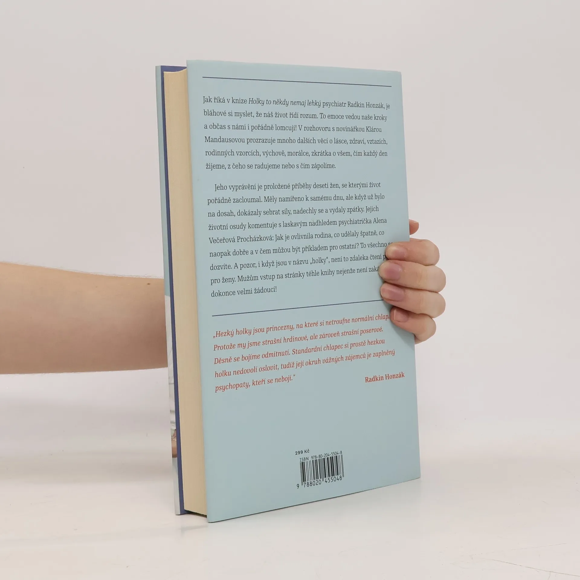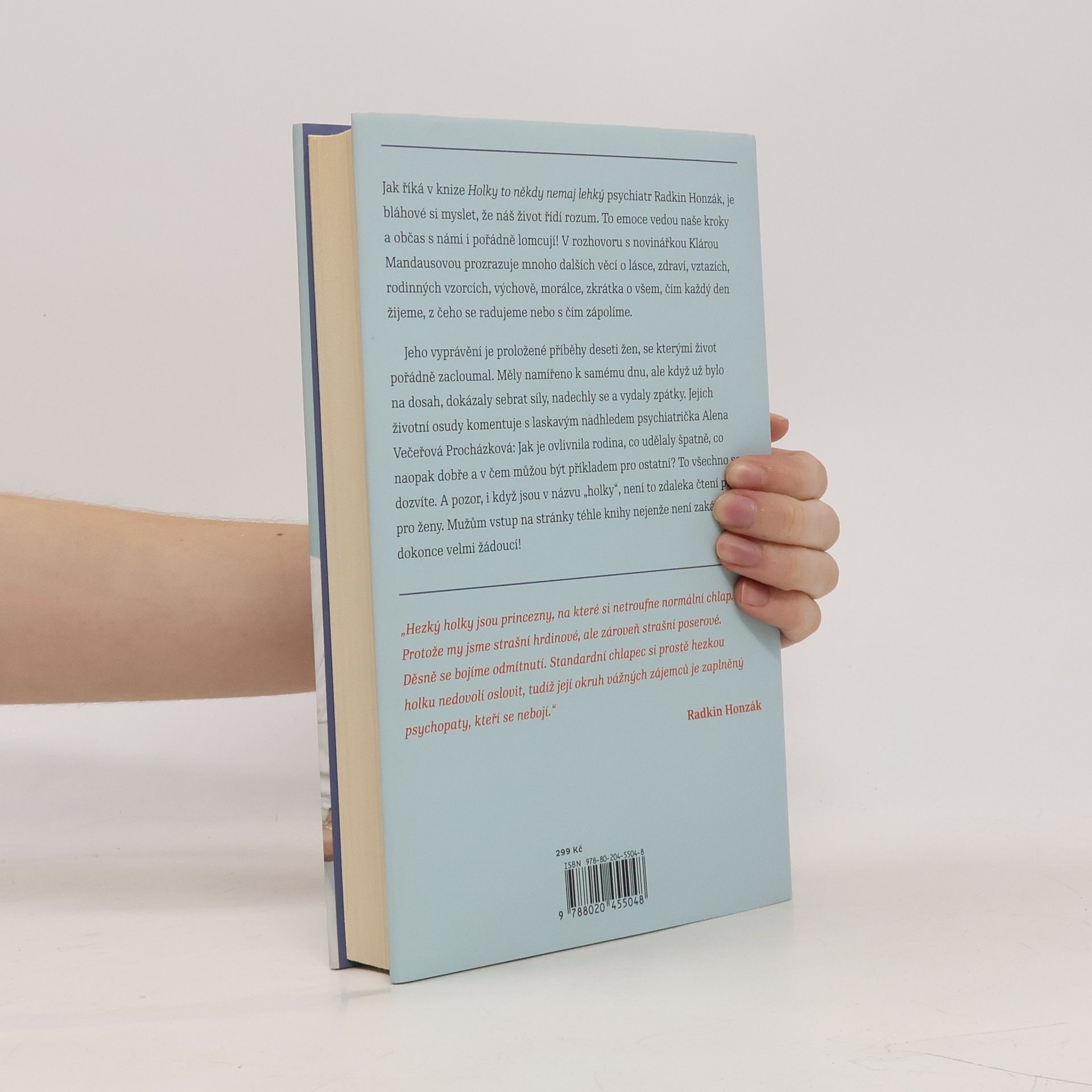 Říká se, že žena vydrží víc než kůň. A kolik toho vlastně vydrží kůň? Hodně, i když se někdy splaší, začne vyvádět a občas jde dokonce hlavou proti zdi. Ať to stojí, co to stojí. Jak říká v knize Holky to někdy nemaj lehký psychiatr Radkin Honzák, je bláhové si myslet, že náš život řídí rozum. Jsou to emoce, co vedou naše kroky a občas s námi i pořádně lomcují! V rozhovoru s novinářkou Klárou Mandausovou prozrazuje mnoho dalších věcí o lásce, zdraví, vztazích, rodinných vzorcích, výchově, morálce, zkrátka o všem, čím každý den žijeme, z čeho se radujeme nebo s čím zápolíme. Jeho vyprávění je proložené příběhy deseti žen, se kterými život pořádně zacloumal. Měly namířeno k samému dnu, ale když už bylo na dosah, dokázaly sebrat síly, nadechly se a vydaly zpátky. Jejich životní osudy komentuje s laskavým nadhledem psychiatrička Alena Večeřová Procházková: Jak je ovlivnila rodina, co udělaly špatně, co naopak dobře a v čem můžou být příkladem pro ostatní? To všechno se dozvíte. A pozor, i když jsou v názvu holky, není to zdaleka čtení pouze pro ženy. Mužům vstup na stránky téhle knihy nejenže není zakázán, je dokonce velmi žádoucí! Je vám, pánové, přece jasné, že rčení o koni a výdrži, platí i pro vás?