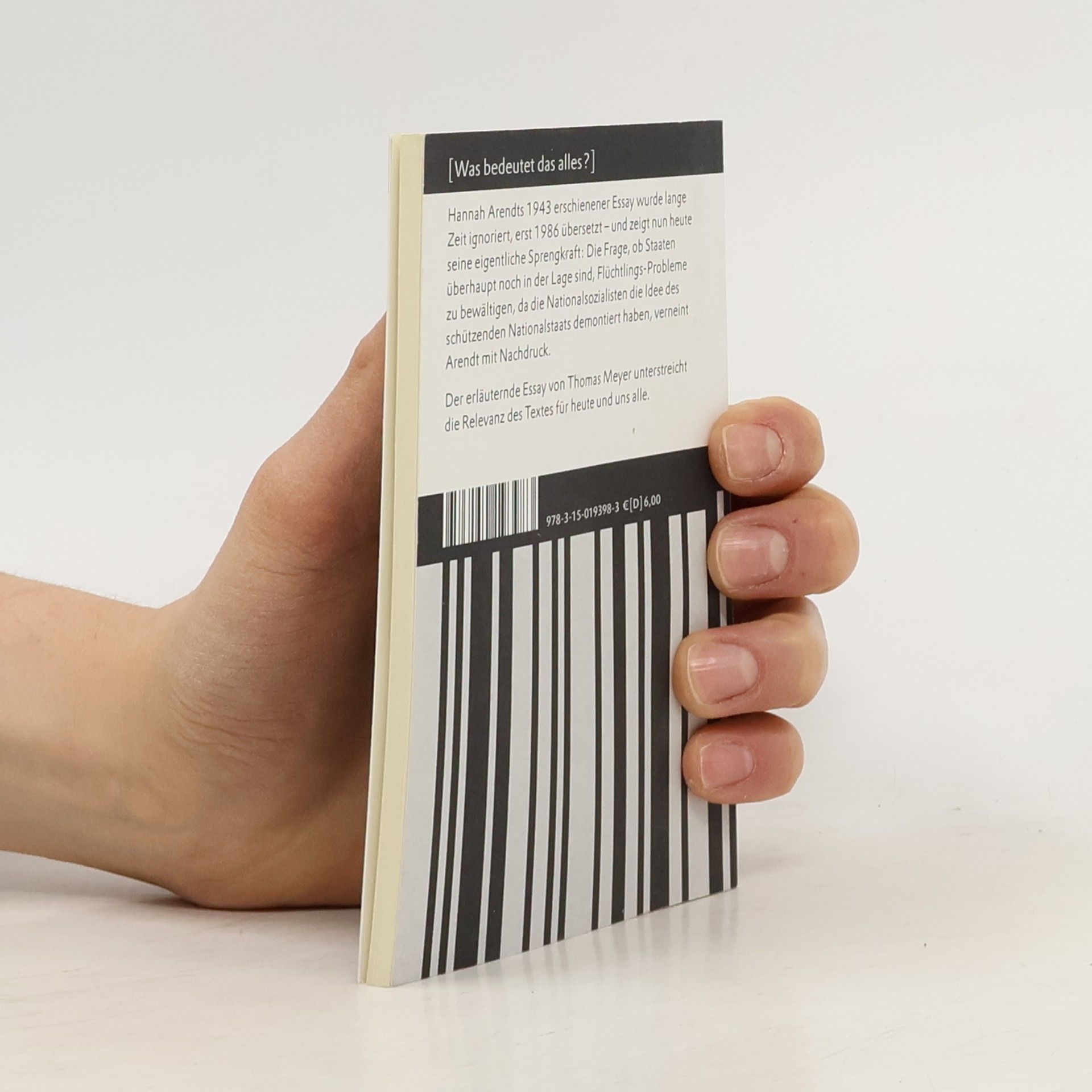 Hannah Arendts 1943 erschienener Essay wurde lange Zeit ignoriert, erst 1986 übersetzt – und zeigt erst heute seine eigentliche Sprengkraft: Aus unmittelbarem eigenem Erleben bezweifelte Arendt, dass Staaten überhaupt noch in der Lage sind, Flüchtlings-Probleme zu bewältigen, da die Nationalsozialisten die Idee des schützenden Nationalstaats unmöglich gemacht haben. Ähnlich wie bei »Eichmann in Jerusalem« brachte ihr diese These Schwierigkeiten mit zionistischen Strömungen ein, die Israel als Rettungsinsel genau in diesem Sinne sehen wollten. Der Essay von Thomas Meyer unterstreicht die Relevanz des Textes im Zusammenhang mit der heutigen Flüchtlingsdebatte.