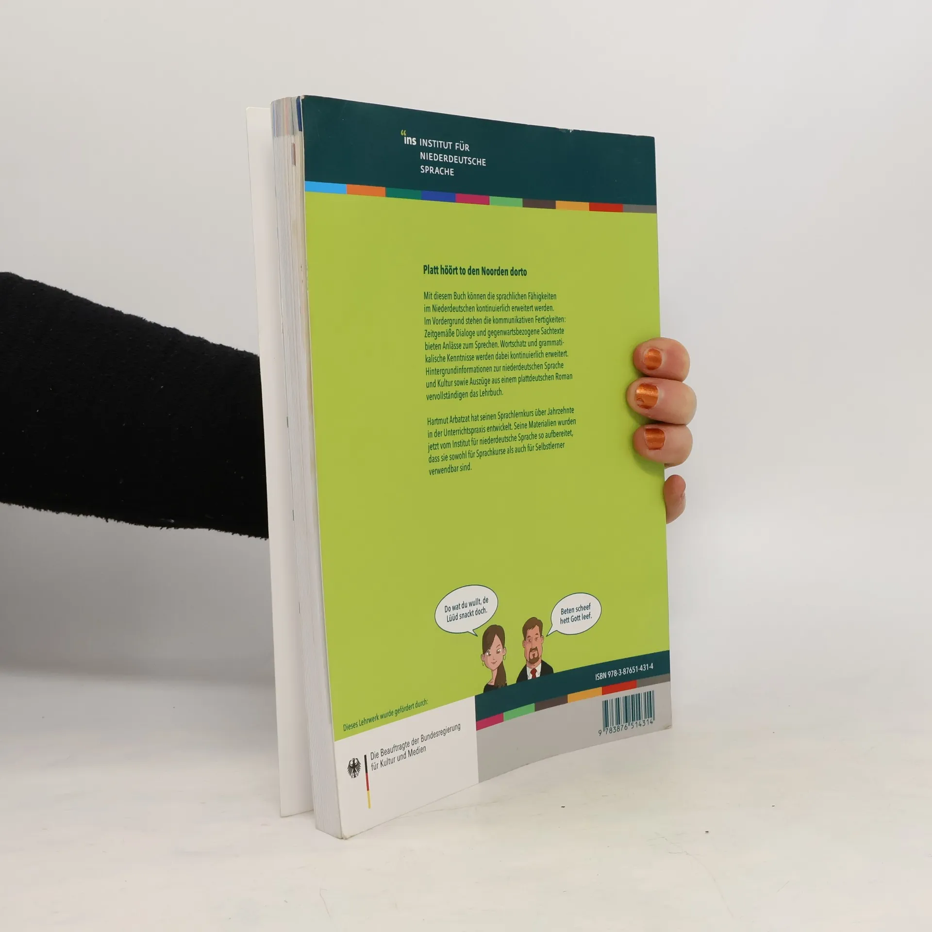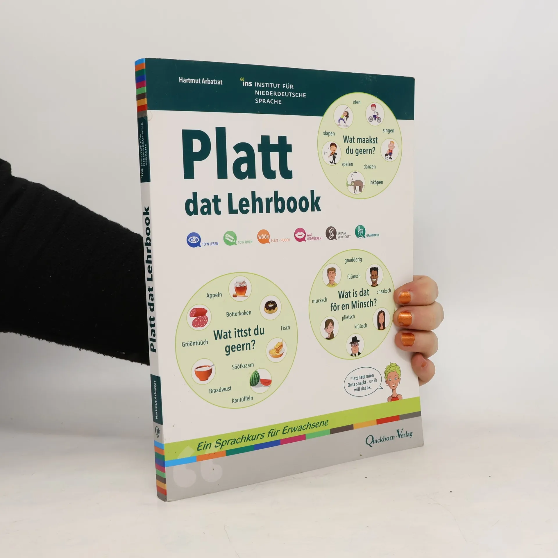 Hartmut Arbatzat wirkt seit vielen Jahren als VHS-Dozent für Plattdeutsch. Nun hat er unter der Herausgeberschaft des Instituts für Niederdeutsche Sprache seine bewährten Texte und Übungen zu einem Lehrbuch zusammengestellt. In zehn Kapiteln geht es um Menschen und Themen von heute, aber auch um Wortschatz und Grammatik. Für Anfänger ohne Vorkenntnisse, zum Selbststudium oder für Kurse an der Volkshochschule. Jedes Kapitel mit Lösungsteil, Aufgaben, Rätseln, Dialogen und Info-Kästchen.