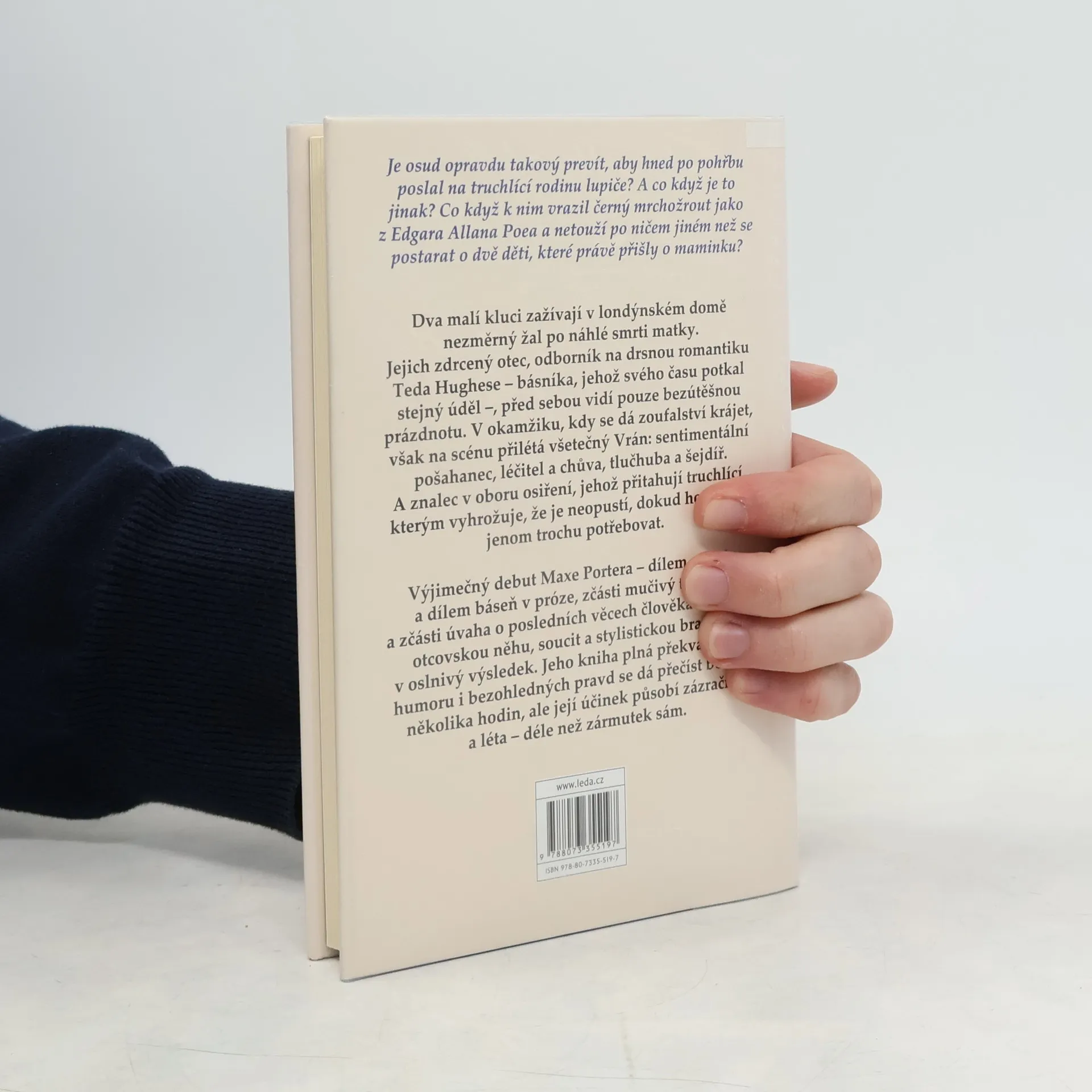 Dva malí kluci zažívají v londýnském domě nezměrný žal po náhlé smrti matky. Jejich zdrcený otec, odborník na drsnou romantiku Teda Hughese – básníka, jehož svého času potkal stejný úděl –, před sebou vidí pouze bezútěšnou prázdnotu. V okamžiku, kdy se dá zoufalství krájet, však na scénu přilétá všetečný Vrán: sentimentální pošahanec, léčitel a chůva, tlučhuba a šejdíř. A znalec v oboru osiření, jehož přitahují truchlící, kterým vyhrožuje, že je neopustí, dokud ho budou jenom trochu potřebovat. Výjimečný debut Maxe Portera – dílem novela a dílem báseň v próze, zčásti mučivý trojhlas a zčásti úvaha o posledních věcech člověka – slučuje otcovskou něhu, soucit a stylistickou bravuru v oslnivý výsledek. Jeho kniha, plná překvapivého humoru i bezohledných pravd, se dá přečíst během několika hodin, ale její účinek působí zázračně a dlouho – déle než zármutek sám.