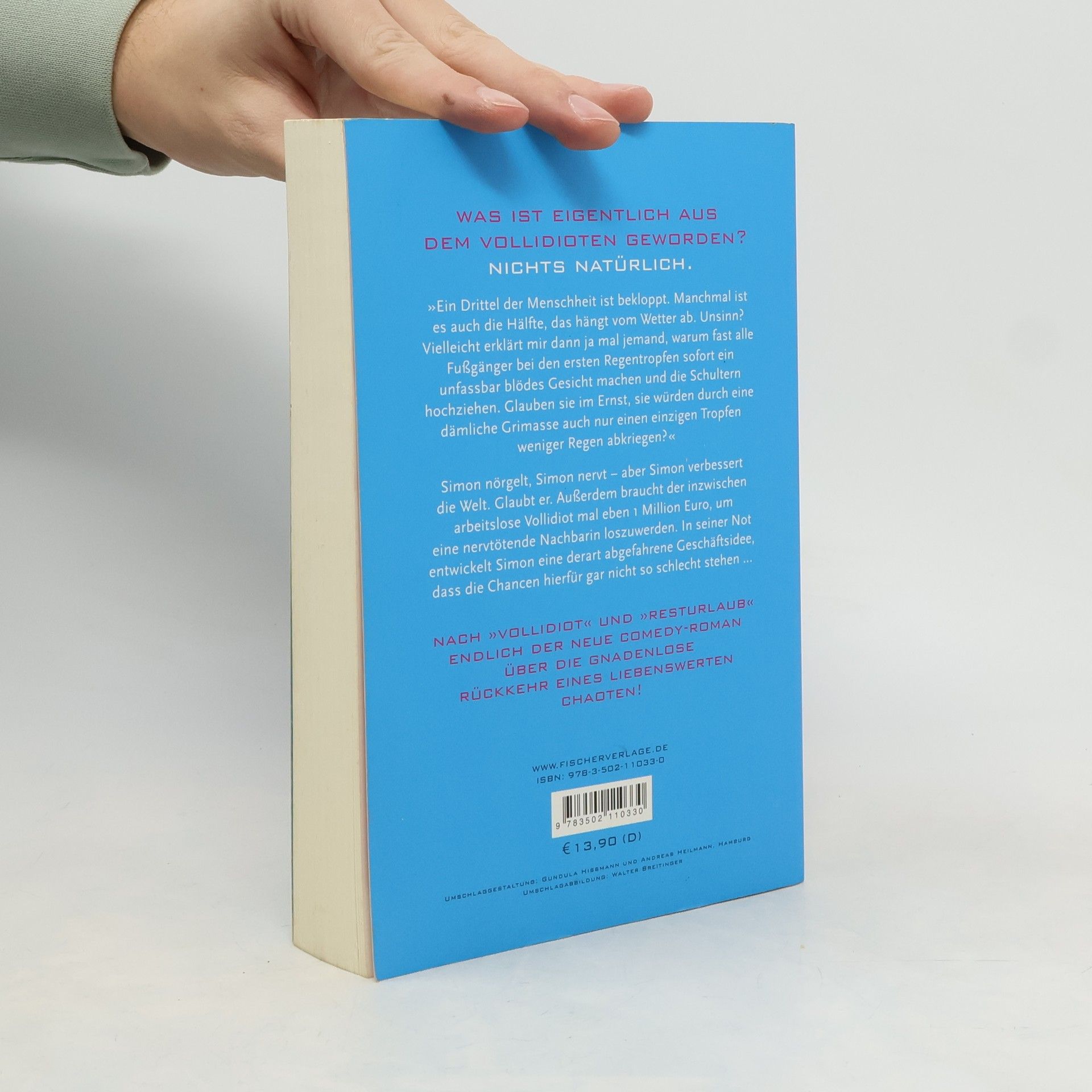 »Ein Drittel der Menschheit ist bekloppt. Manchmal ist es auch die Hälfte, das hängt vom Wetter ab. Unsinn? Vielleicht erklärt mir dann ja mal jemand, warum fast alle Fußgänger bei den ersten Regentropfen sofort ein unfassbar blödes Gesicht machen und die Schultern hochziehen. Glauben sie im Ernst, sie würden durch eine dämliche Grimasse auch nur einen einzigen Tropfen weniger Regen abkriegen? Das ist eine rhetorische Frage mit einer sehr, sehr traurigen Antwort: Sie glauben es.«Simon nörgelt, Simon nervt – aber Simon verbessert die Welt. Glaubt er. Außerdem braucht der inzwischen arbeitslose Vollidiot mal eben 1 Million Euro, um eine nervtötende Nachbarin loszuwerden. In seiner Not entwickelt Simon eine derart abgefahrene Geschäftsidee, dass die Chancen hierfür gar nicht so schlecht stehen ... Der Comedy-Bestseller über die gnadenlose Rückkehr eines liebenswerten Chaoten!