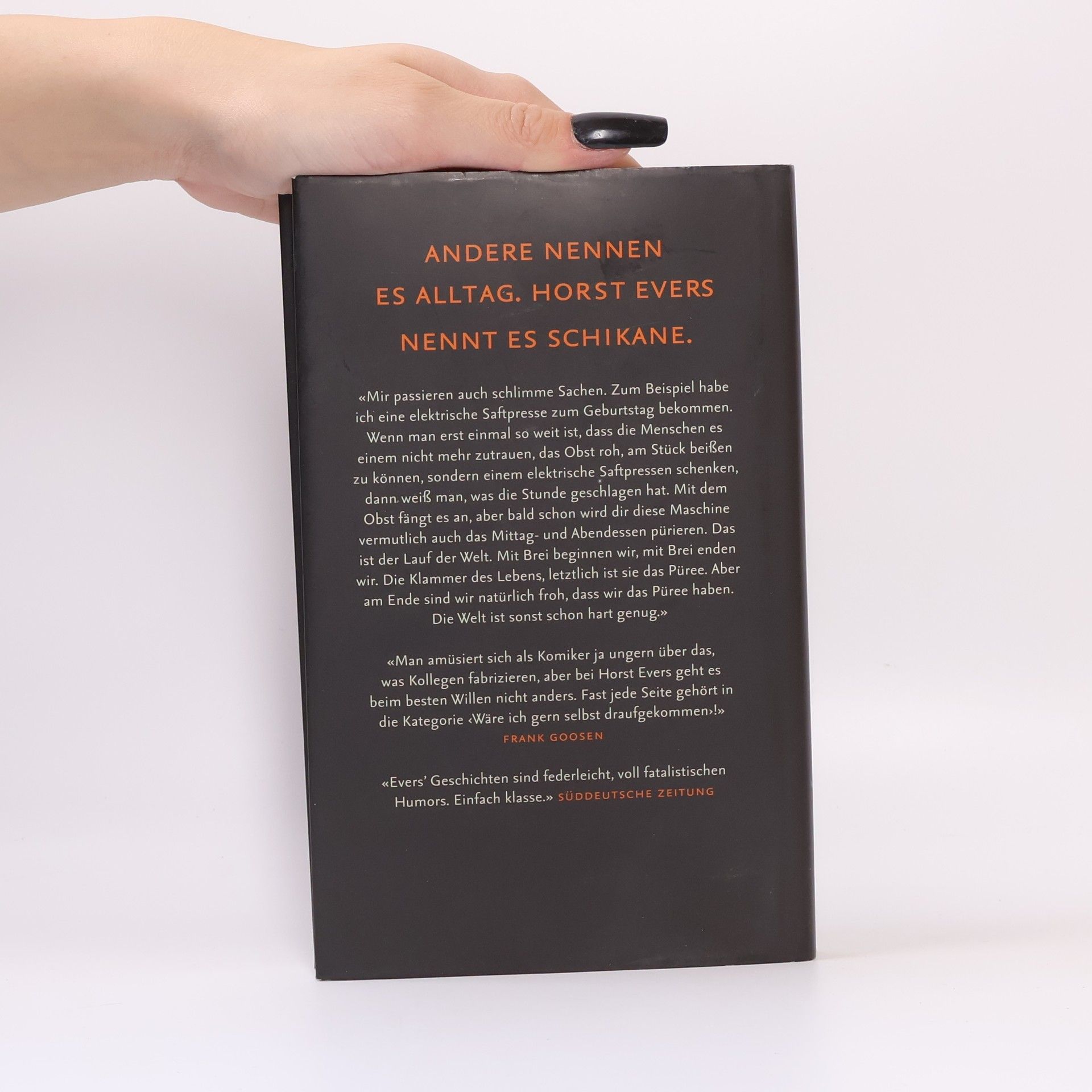Andere nennen es Alltag. Horst Evers nennt es Schikane.«Mir passieren auch schlimme Sachen. Zum Beispiel habe ich eine elektrische Saftpresse zum Geburtstag bekommen. Wenn man erst einmal so weit ist, dass die Menschen es einem nicht mehr zutrauen, das Obst roh, am Stück beißen zu können, sondern einem elektrische Saftpressen schenken, dann weiß man, was die Stunde geschlagen hat. Mit dem Obst fängt es an, aber bald schon wird dir diese Maschine vermutlich auch das Mittag- und Abendessen pürieren. Das ist der Lauf der Welt. Mit Brei beginnen wir, mit Brei enden wir. Die Klammer des Lebens, letztlich ist sie das Püree. Aber am Ende sind wir natürlich froh, dass wir das Püree haben. Die Welt ist sonst schon hart genug.»«Man amüsiert sich als Komiker ja ungern über das, was Kollegen fabrizieren, aber bei Horst Evers geht es beim besten Willen nicht anders. Fast jede Seite gehört in die Kategorie ‹Wäre ich gern selbst draufgekommen›!» Frank Goosen«Evers’ Geschichten sind federleicht, voll fatalistischen Humors. Einfach klasse.» Süddeutsche Zeitung
