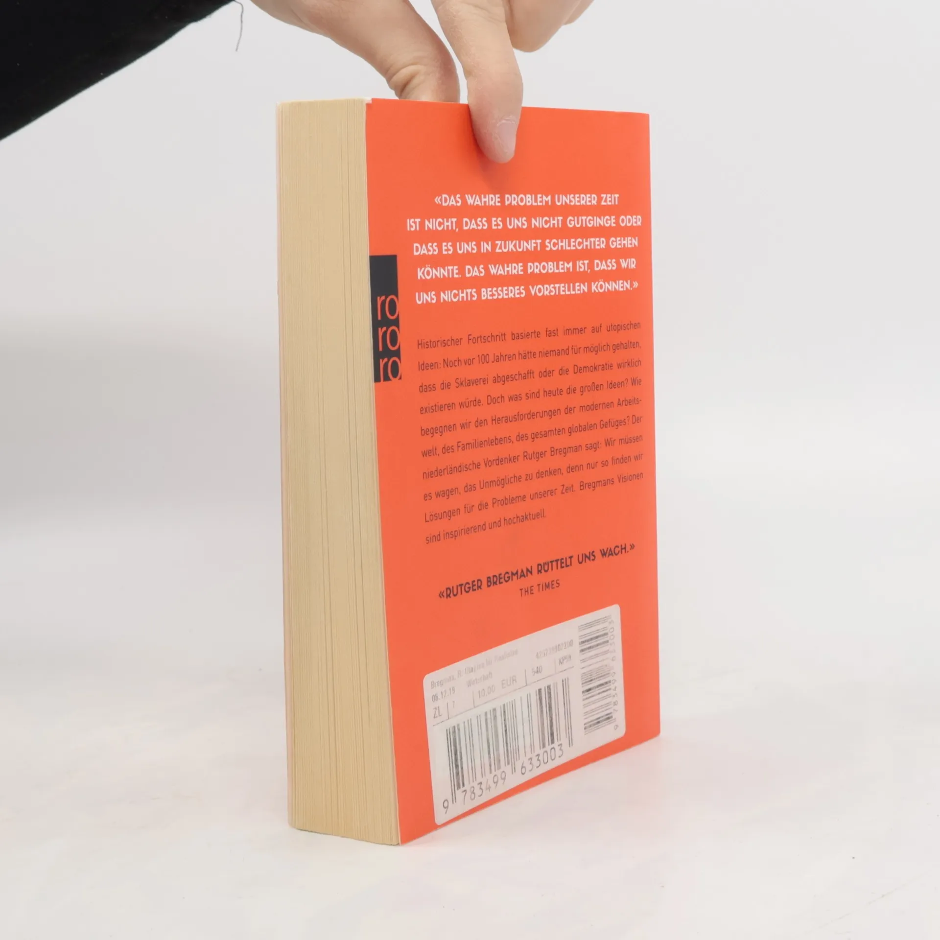 Was sind heute die großen Ideen? Historischer Fortschritt basierte fast immer auf utopischen Ideen: Noch vor 100 Jahren hätte niemand für möglich gehalten, dass die Sklaverei abgeschafft oder die Demokratie wirklich existieren würde. Doch wie begegnen wir den Herausforderungen der modernen Arbeitswelt, des Familienlebens, des gesamten globalen Gefüges? Der niederländische Vordenker Rutger Bregman sagt: «Das wahre Problem unserer Zeit ist nicht, dass es uns nicht gut ginge oder dass es uns in Zukunft schlechter gehen könnte. Das wahre Problem ist, dass wir uns nichts Besseres vorstellen können.» Wir müssen es wagen, das Unmögliche zu denken, denn nur so finden wir Lösungen für die Probleme unserer Zeit. Bregman macht deutlich, warum das bedingungslose Grundeinkommen eine echte Option ist und inwiefern die 15-Stunden-Woche eine Antwort auf die Digitalisierung der Arbeit sein kann. «Alternativlos» ist für Bregman keine Option, sogar die Armut kann abgeschafft werden, wie er am Beispiel einer kanadischen Stadt zeigt. Bregmans Visionen sind inspirierend, seine Energie ist mitreißend; er zeigt: Utopien können schneller Realität werden, als wir denken.