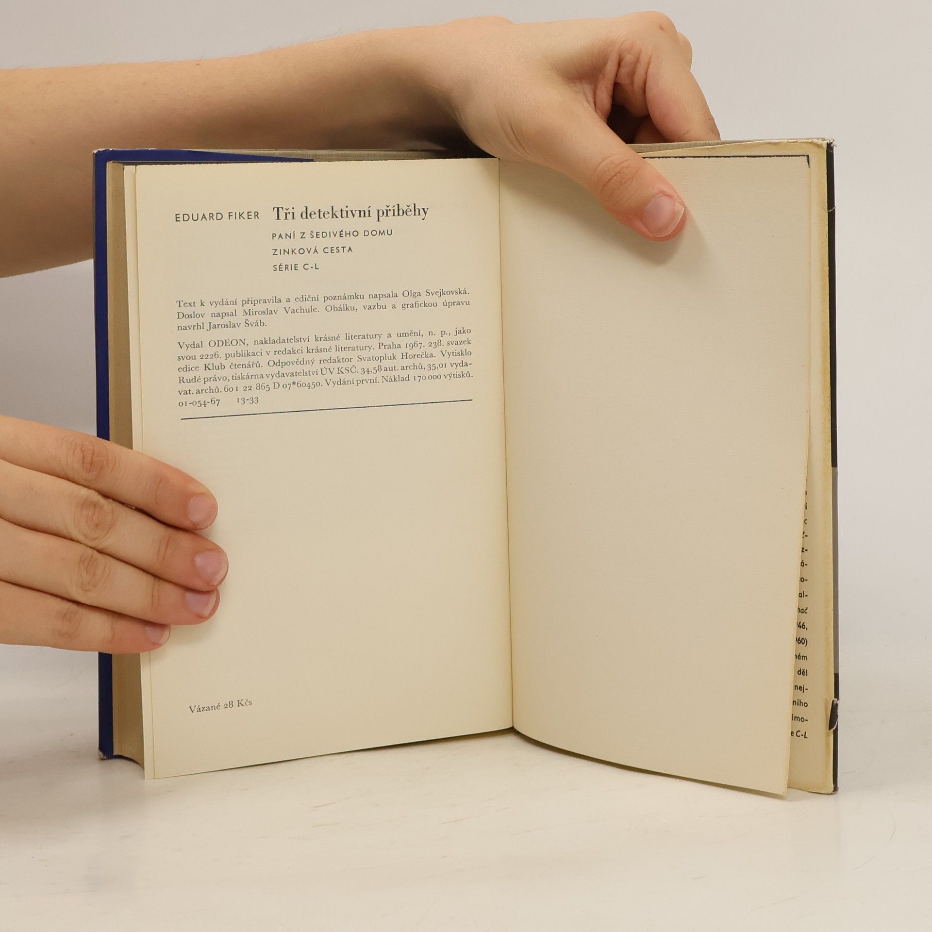 obsahuje 3 detektivní romány Paní z Šedivého domu (Tři čtvrti na jedenáct). Zinková cesta. Série C-L. Vyšlo v Klubu čtenářů - 238. Text k vydání připravila a ediční poznámku napsala Olga Svejkovská. Doslov „Několik slov o Eduardu Fikerovi“ napsal Miroslav Vachule. První vydání.