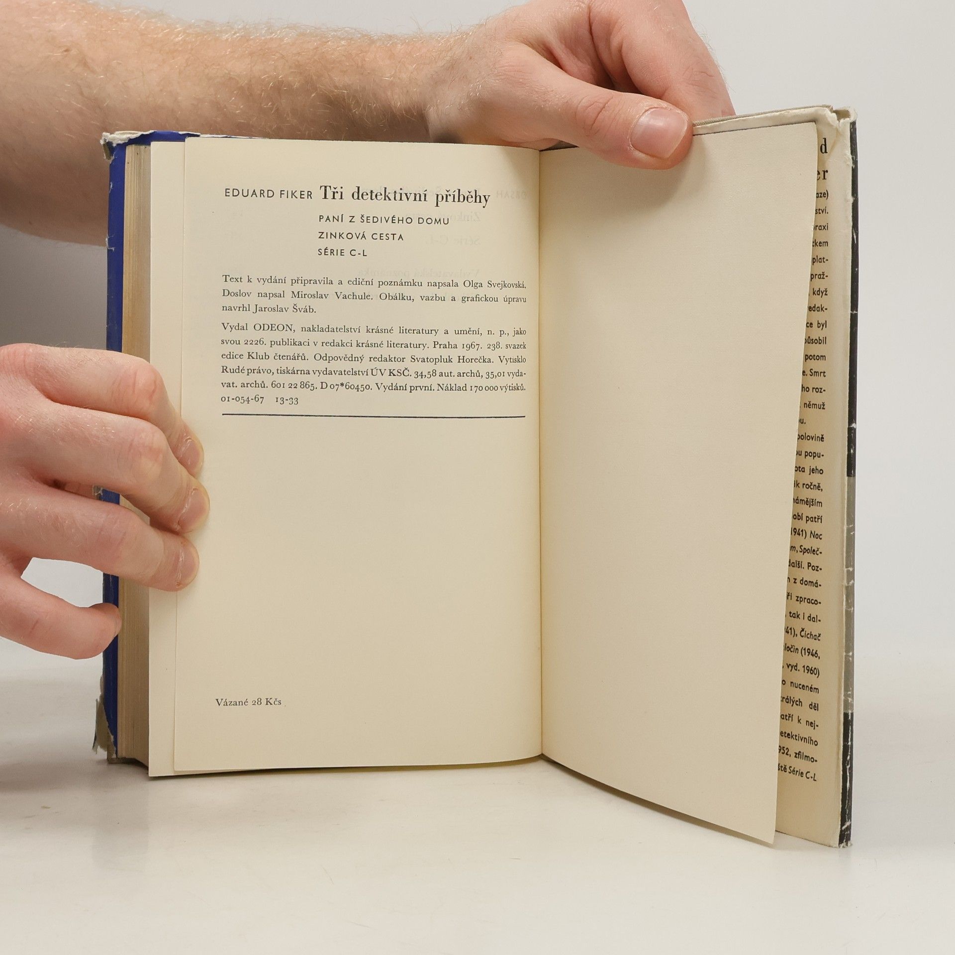 obsahuje 3 detektivní romány Paní z Šedivého domu (Tři čtvrti na jedenáct). Zinková cesta. Série C-L. Vyšlo v Klubu čtenářů - 238. Text k vydání připravila a ediční poznámku napsala Olga Svejkovská. Doslov „Několik slov o Eduardu Fikerovi“ napsal Miroslav Vachule. První vydání.